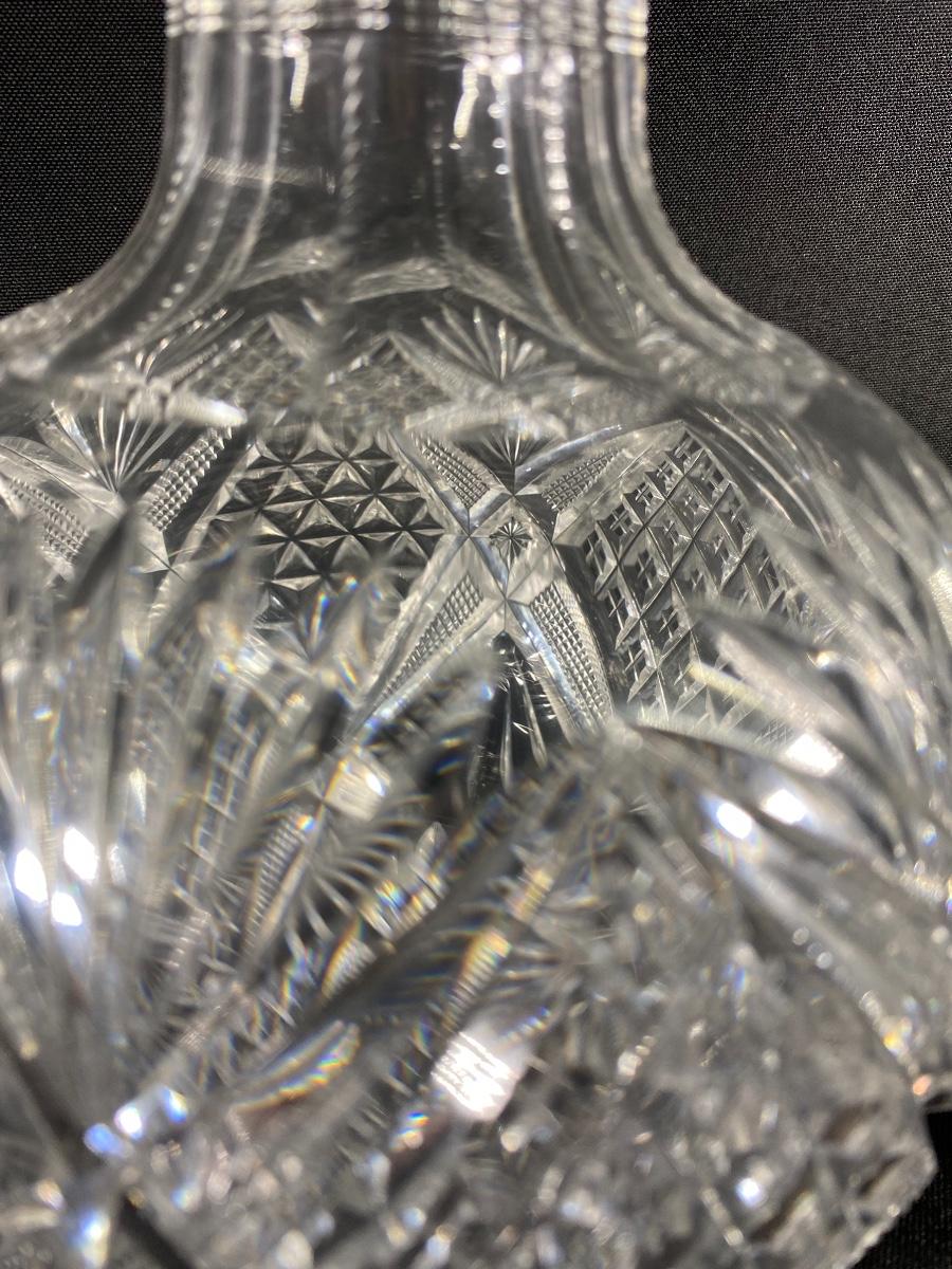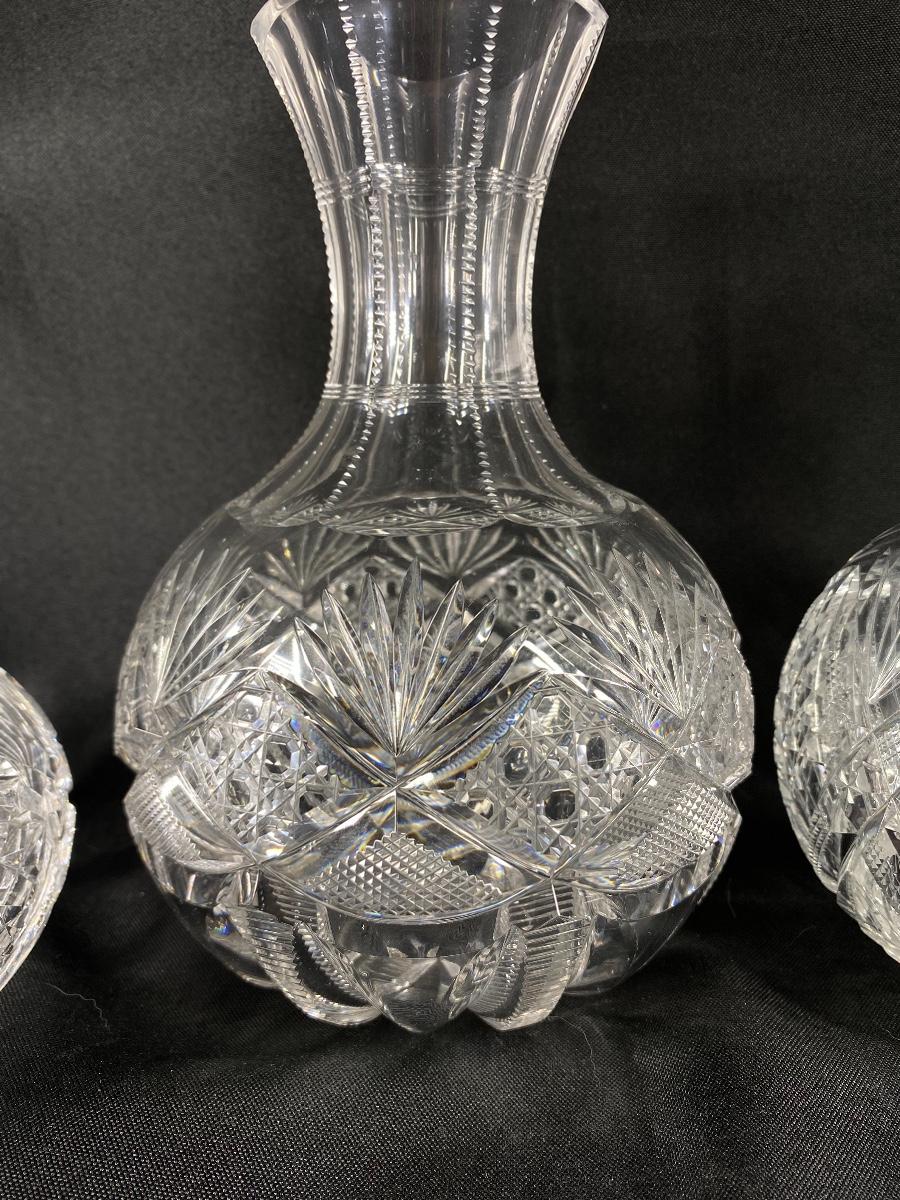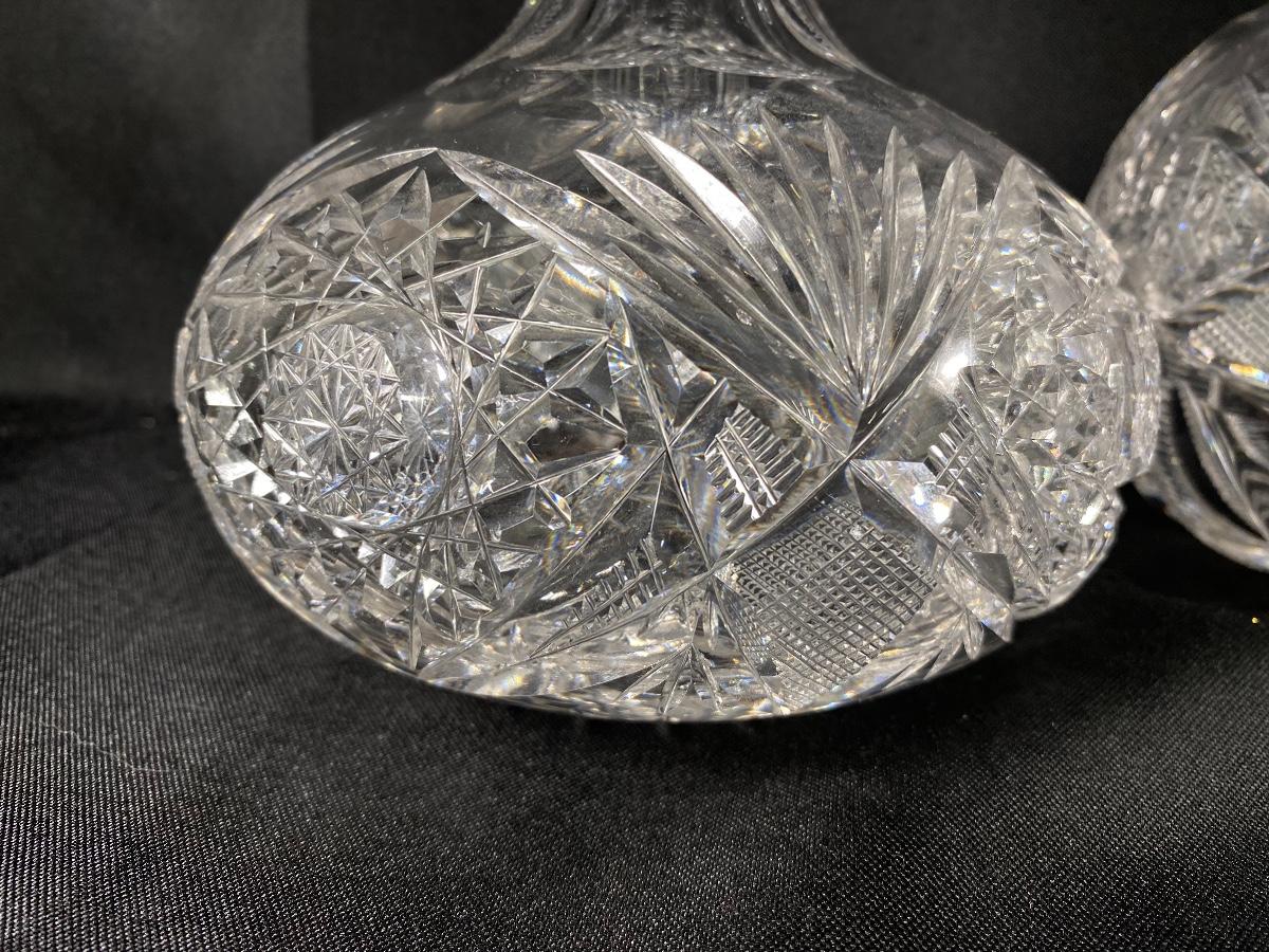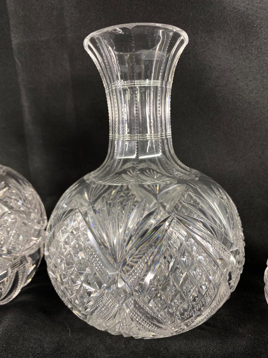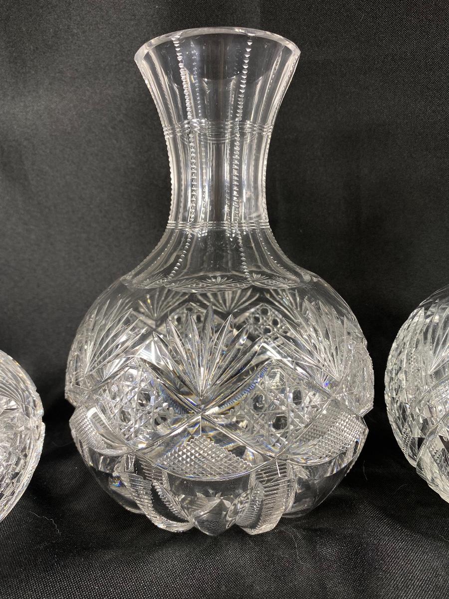 Set of 4 cut crystal decanter bottles. Highly detailed ornate cuts, each one different from the other. Heavy thick glass. None of them have the bottle stopper, would work great as vases. One does have a couple chips in the opening edge, other three do not. About 8" size.