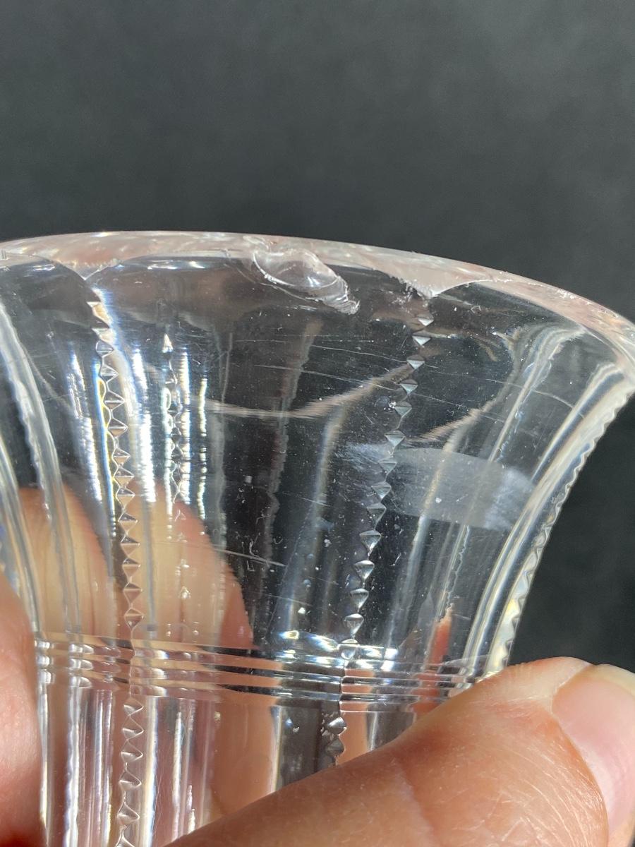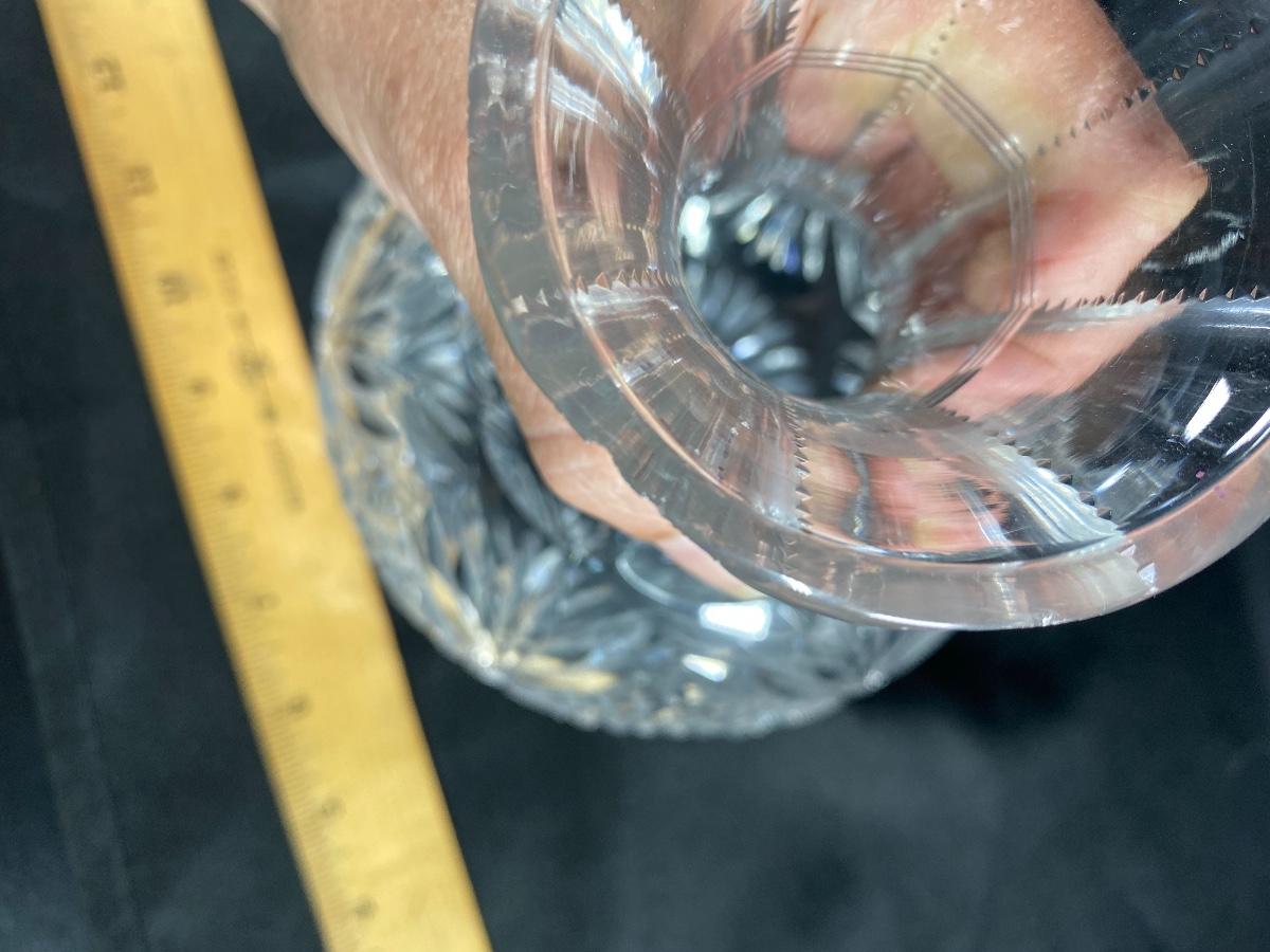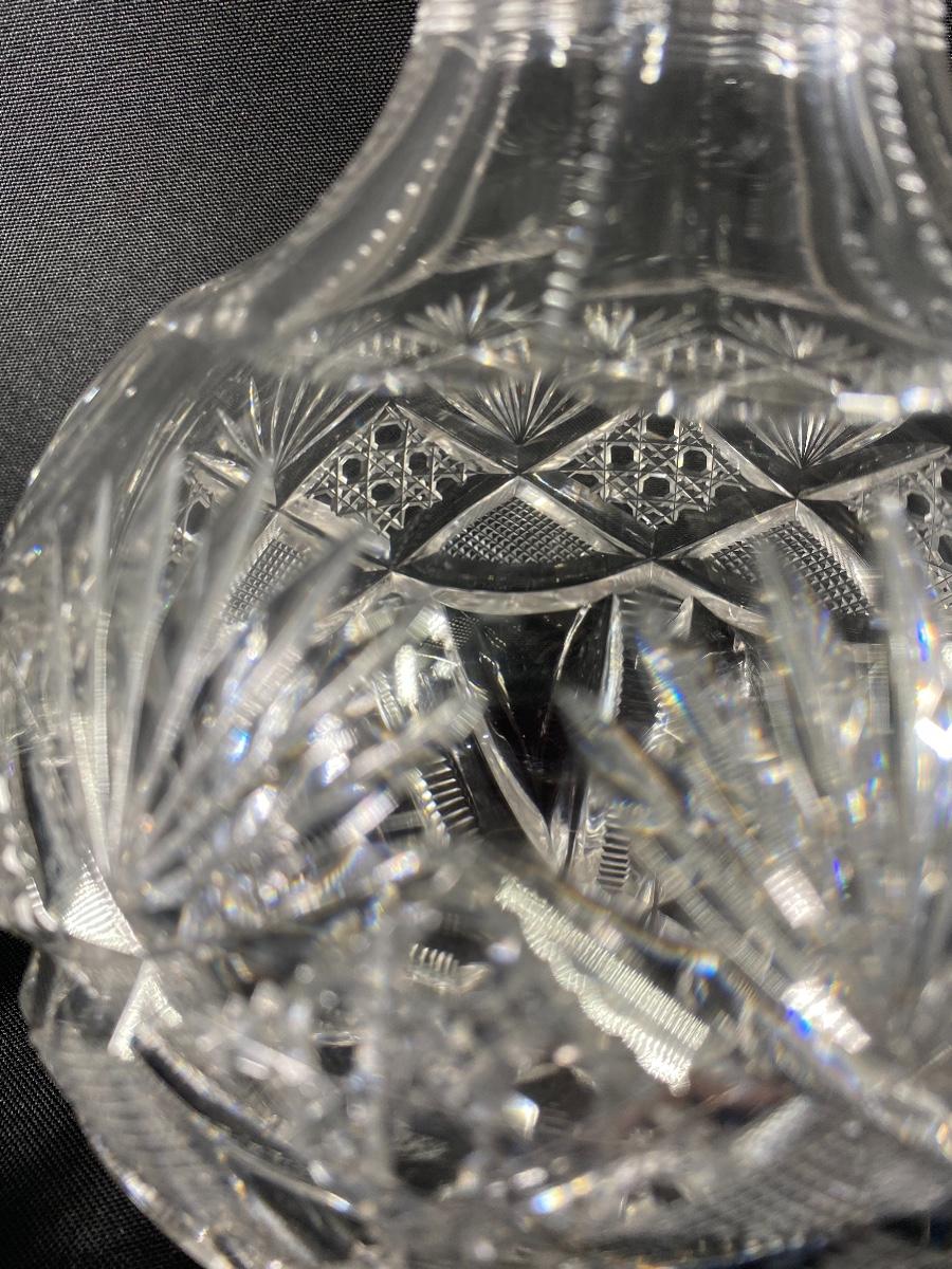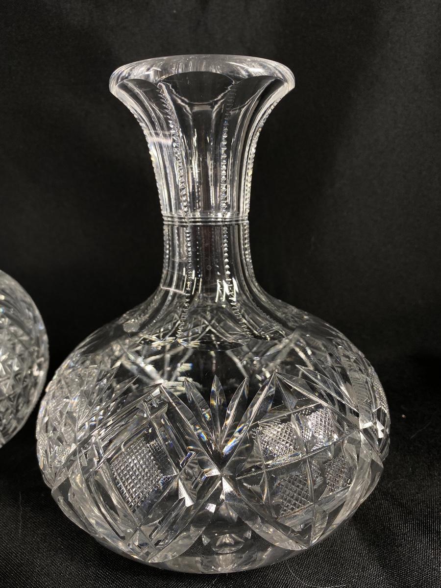 Set of 4 cut crystal decanter bottles. Highly detailed ornate cuts, each one different from the other. Heavy thick glass. None of them have the bottle stopper, would work great as vases. One does have a couple chips in the opening edge, other three do not. About 8" size.