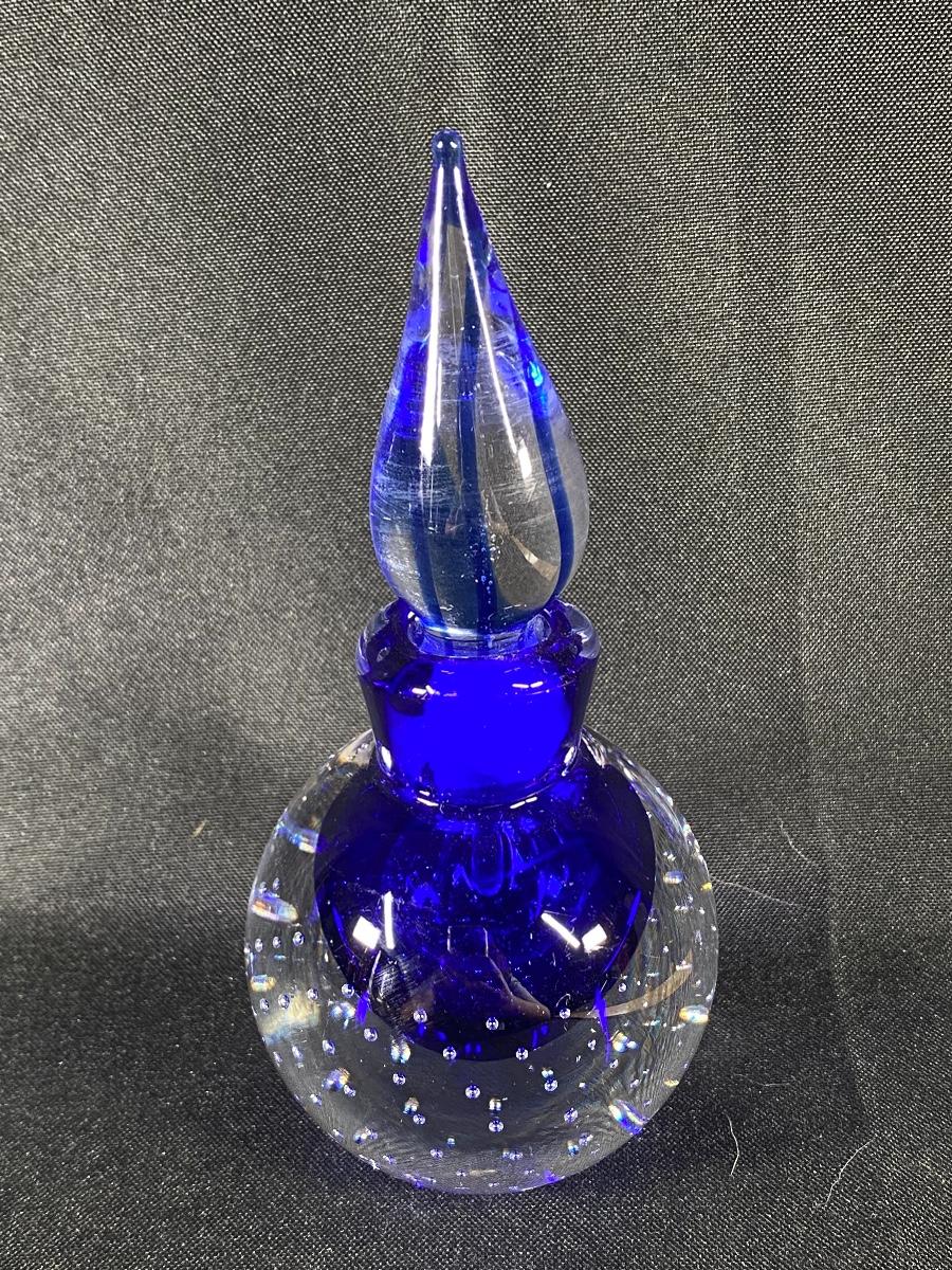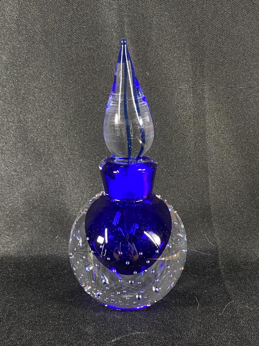 Cobalt blue and clear art glass perfume bottle. Blown glass, nicely done. About 6" size. Good condition.