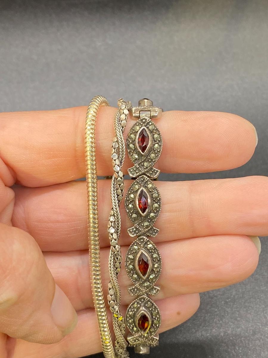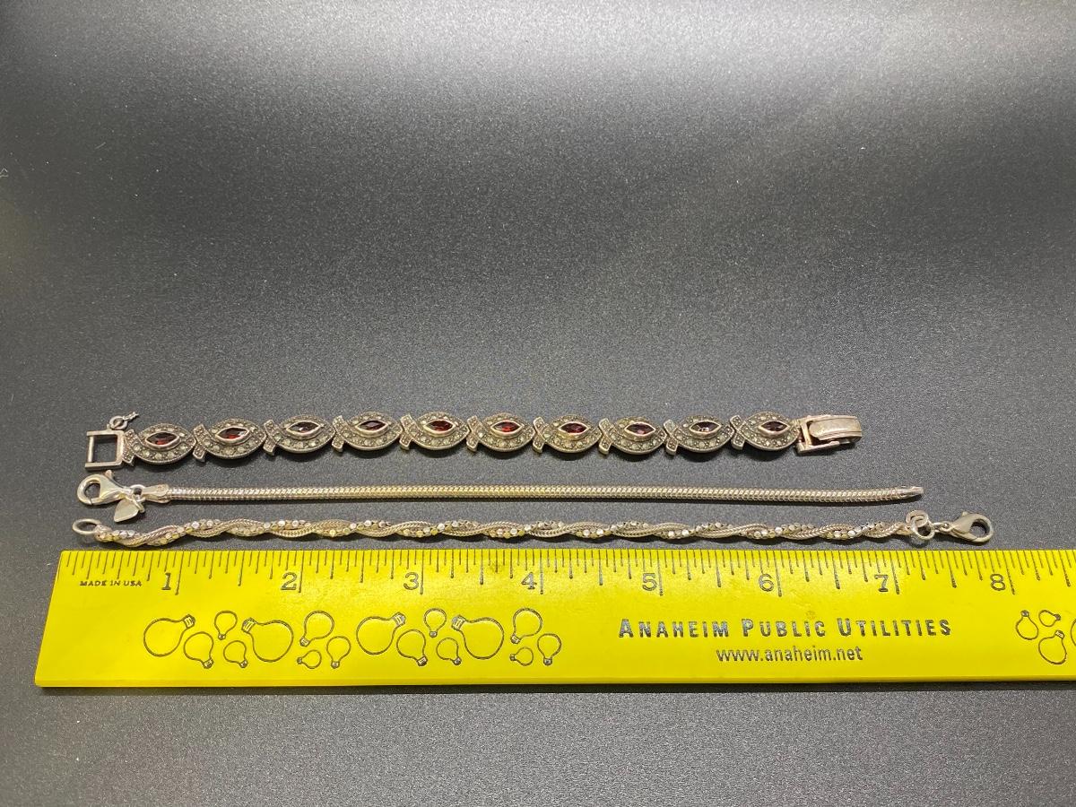 Set of 3 sterling silver bracelets. Wear together or separate. Between 7" and 8" length. All are stamped.