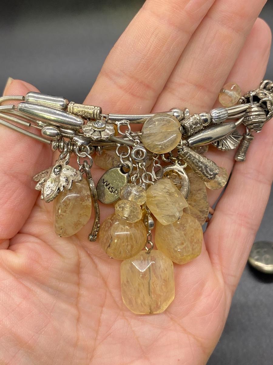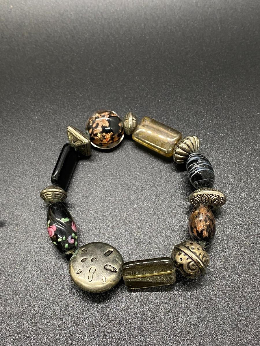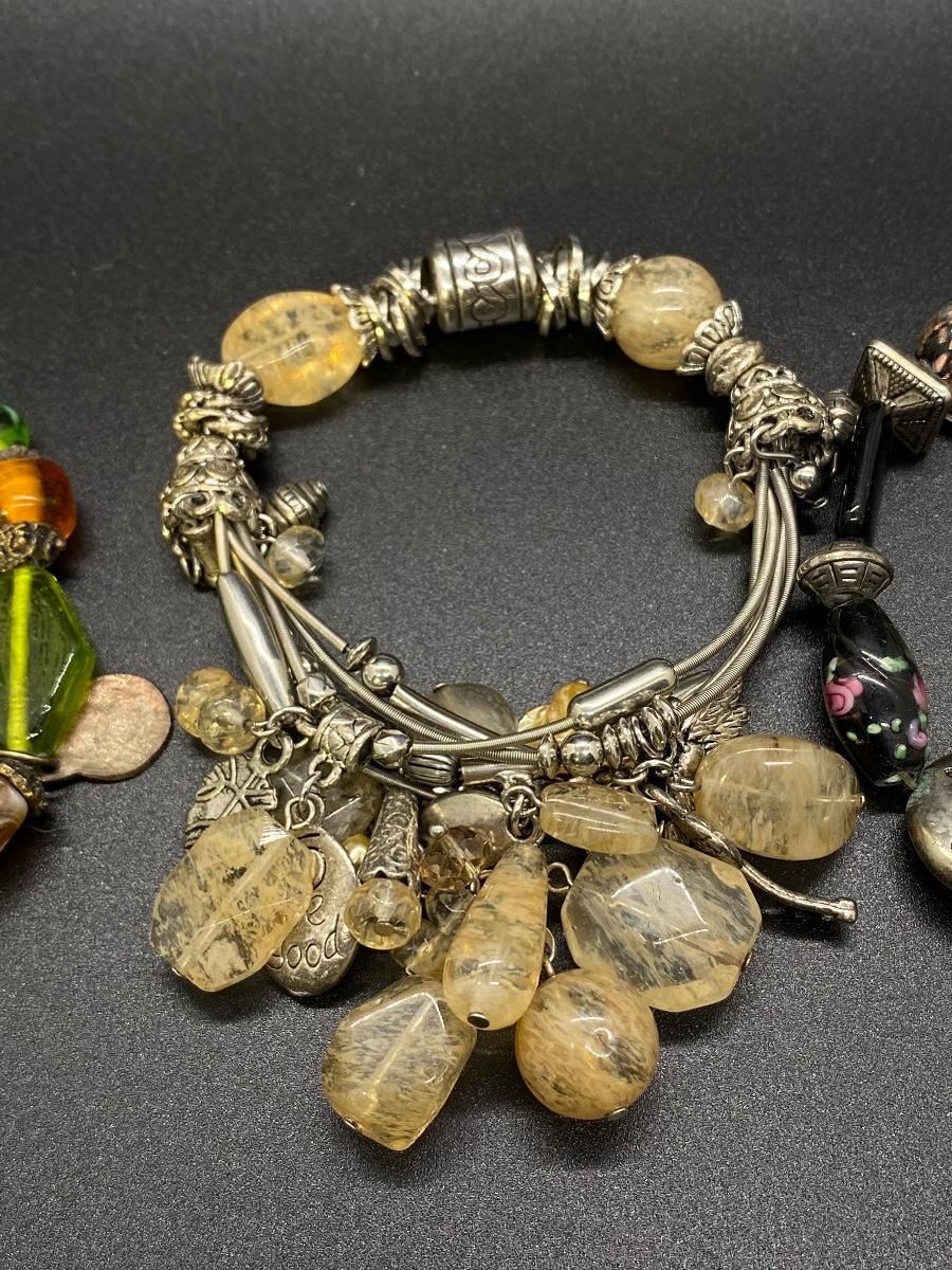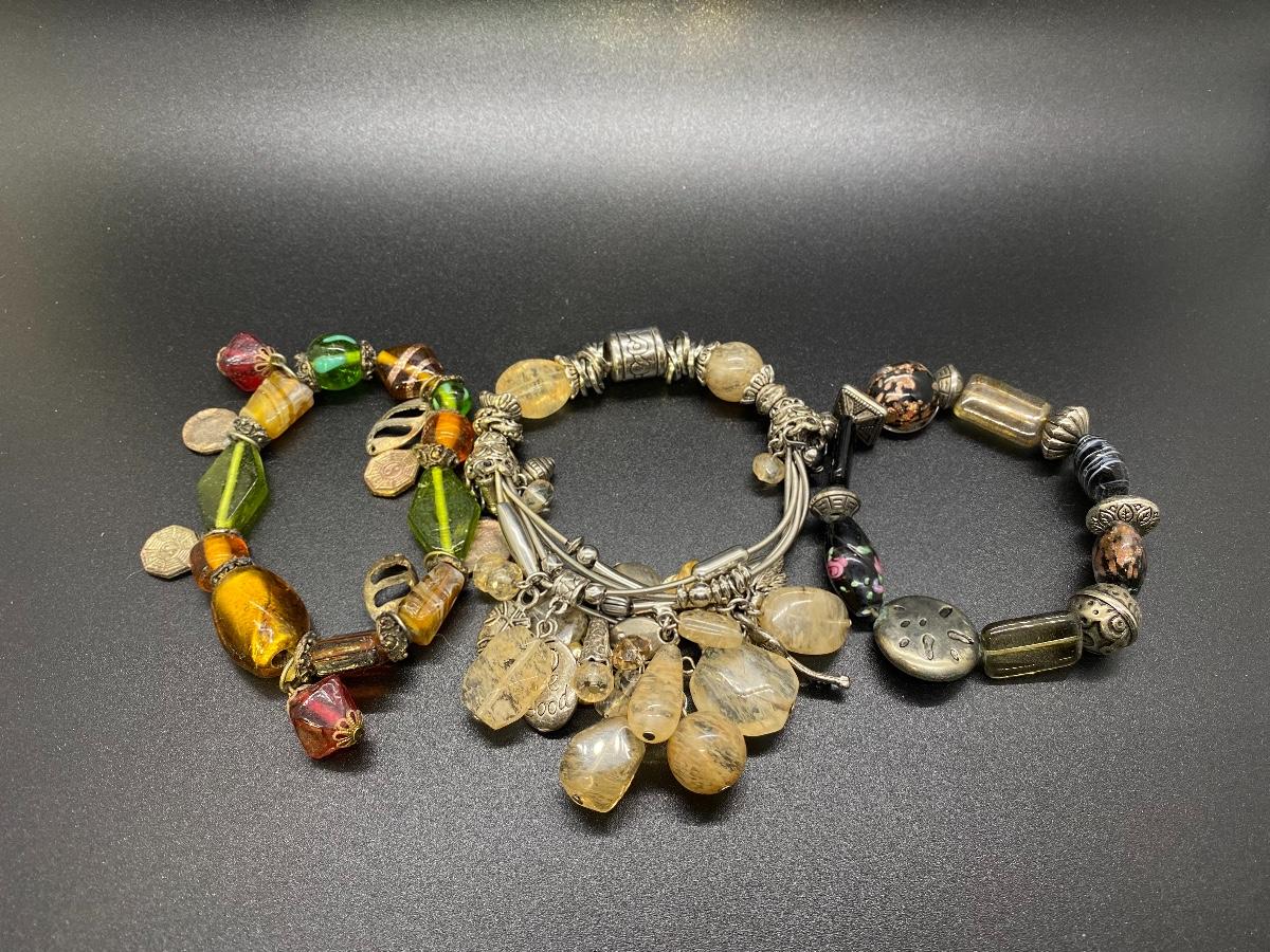 Set of 3 beaded stretch bracelets. Made up of polished stone, glass beads, and metal accents. Adjustable size.