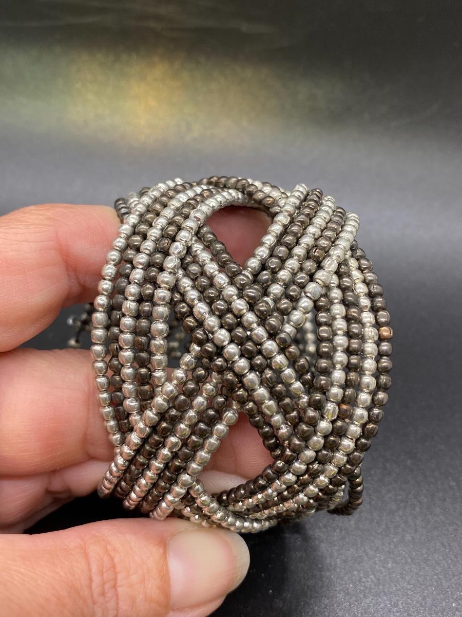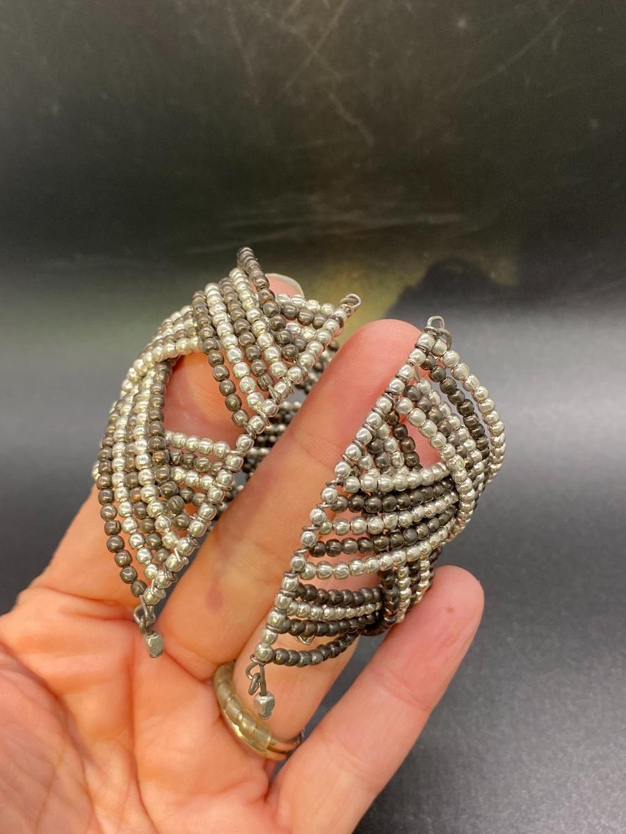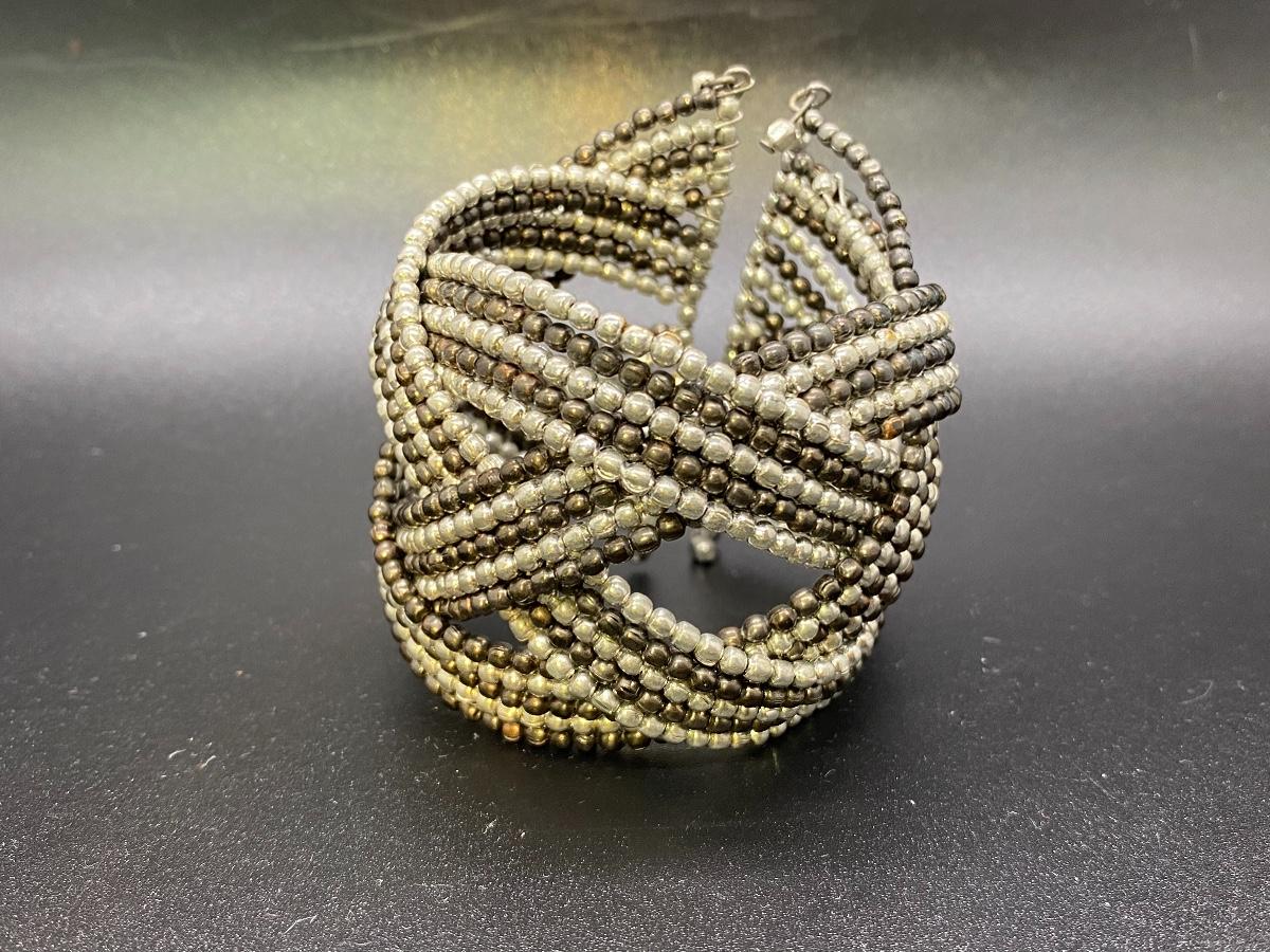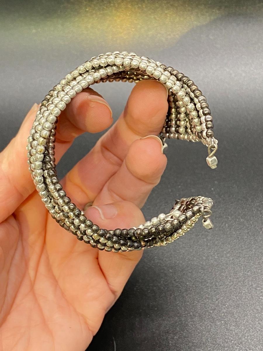 Metallic beaded wire cuff bracelet. Multi tone beaded pattern, stretch fit.