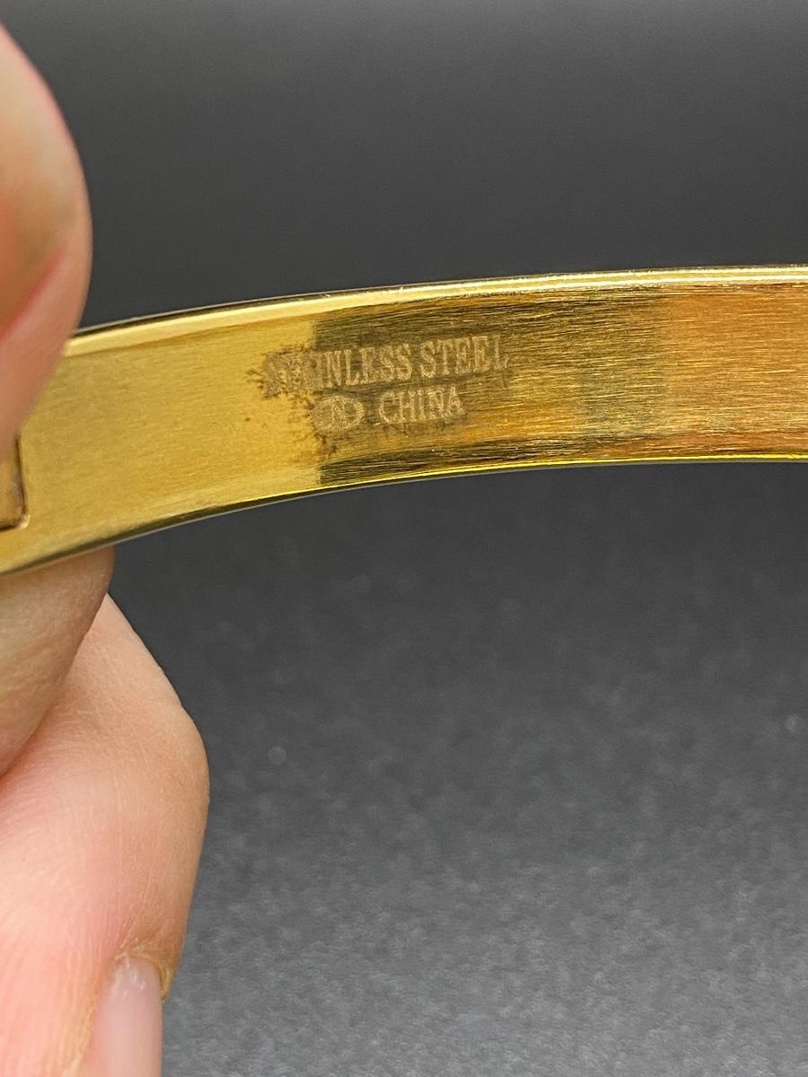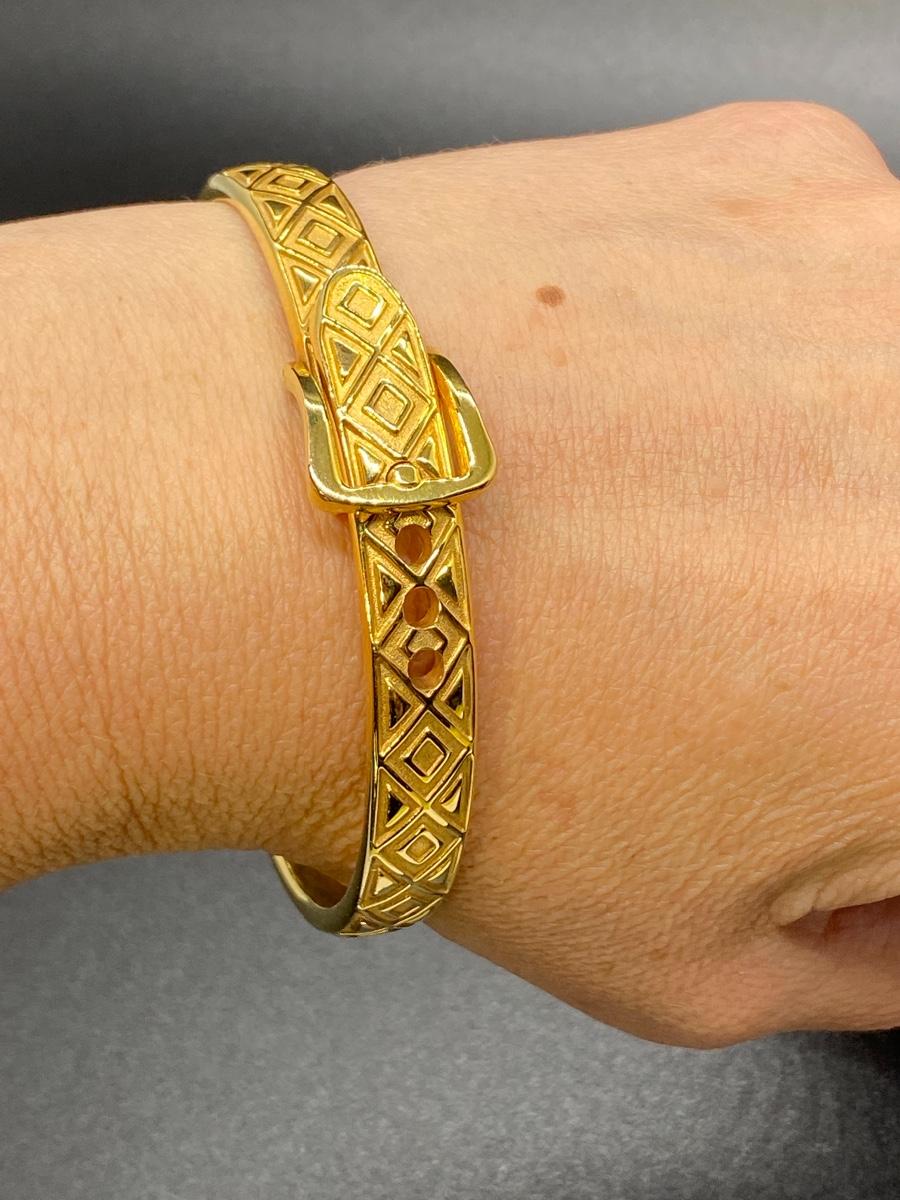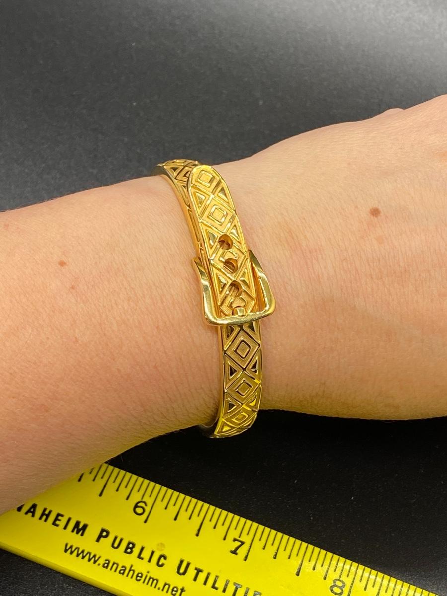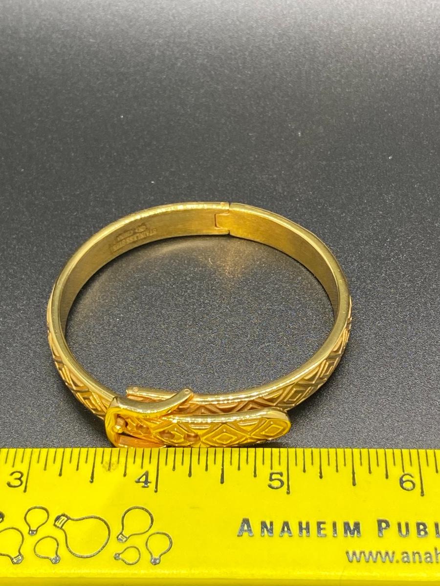 Gold tone stainless steel bangle bracelet. Hinged with 4 adjustable size settings. Looks like a belt.