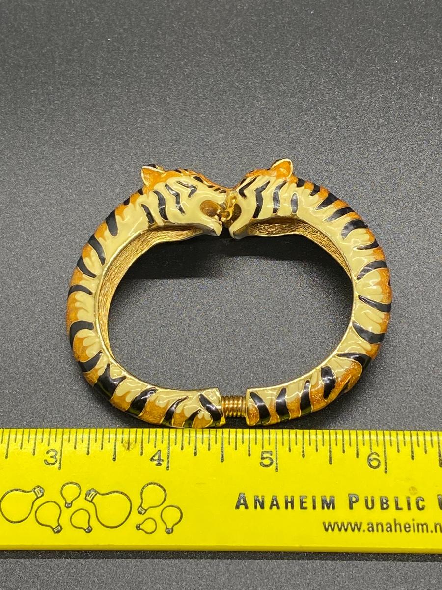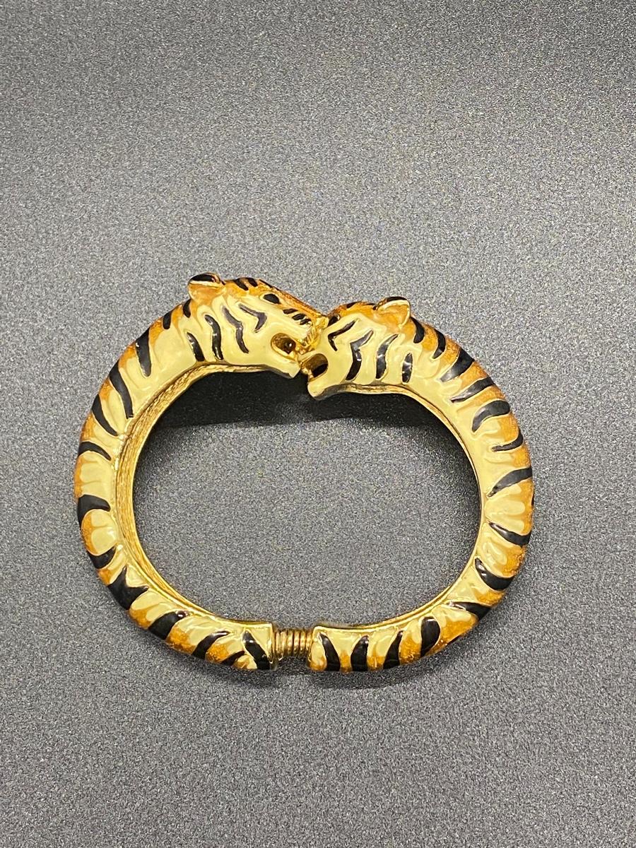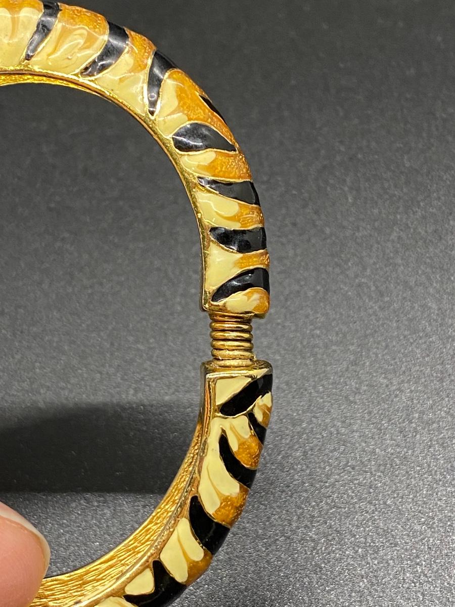 Vintage enameled KJL tiger bangle bracelet. Gold tone enameled bracelet has a spring style hinge for easy on/off and adjustable size. Great condition.