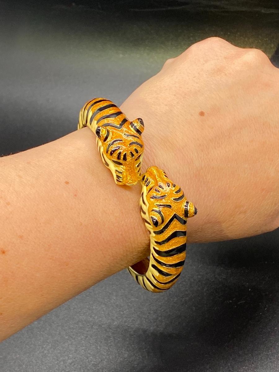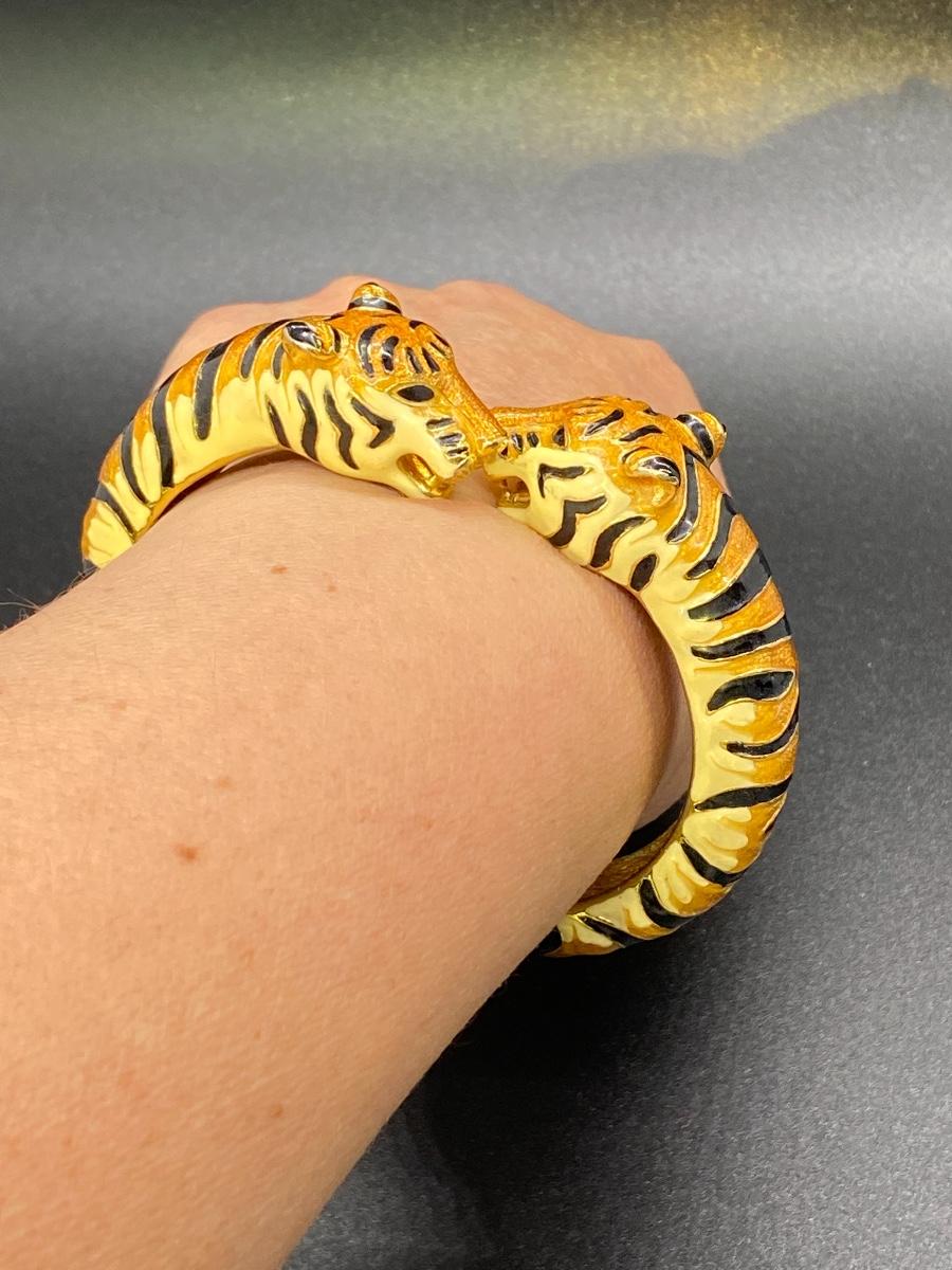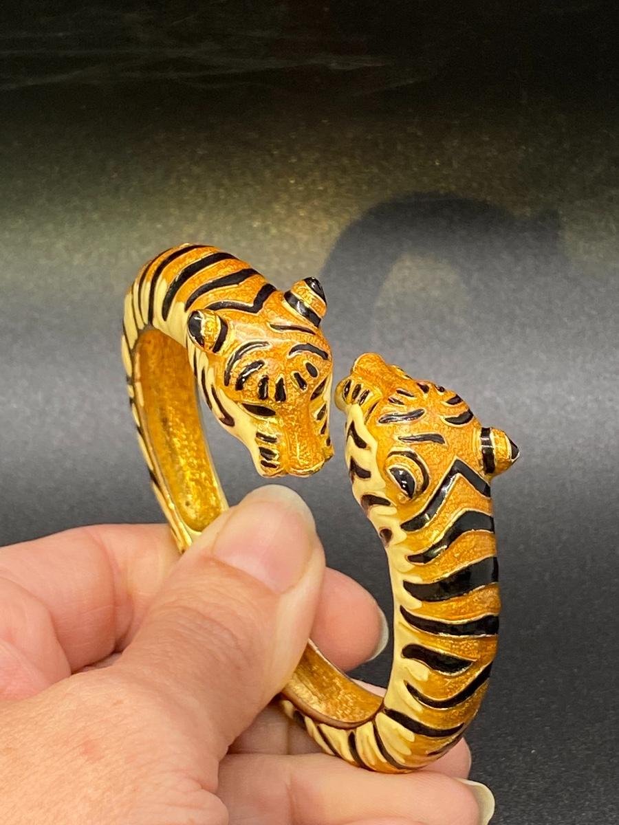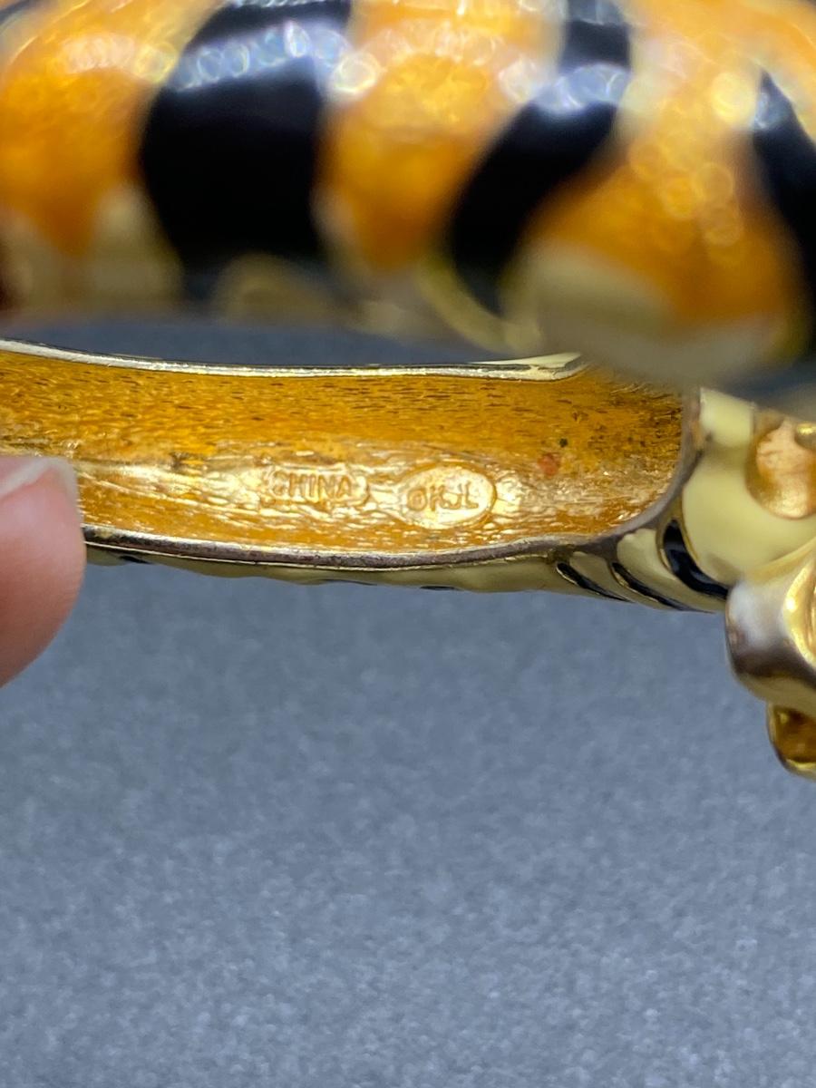 Vintage enameled KJL tiger bangle bracelet. Gold tone enameled bracelet has a spring style hinge for easy on/off and adjustable size. Great condition.
