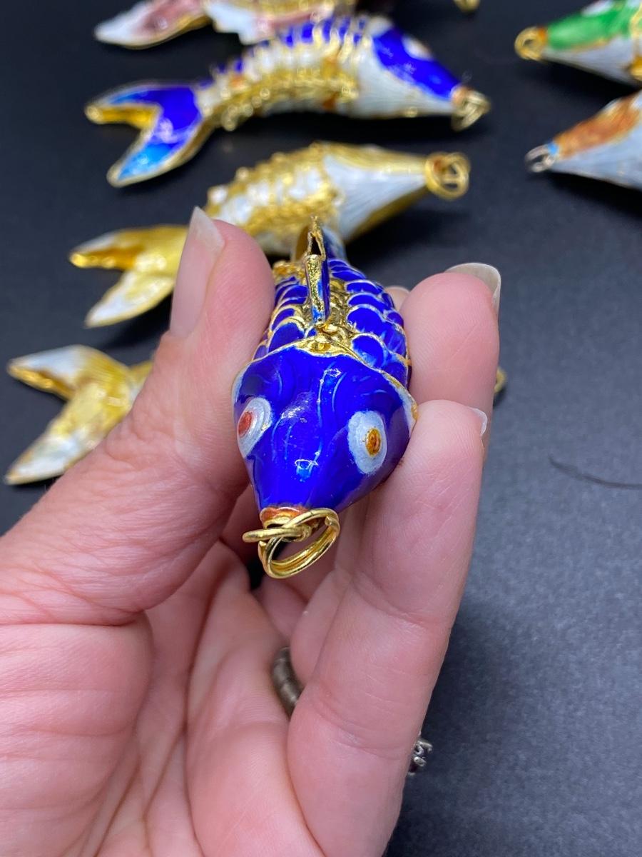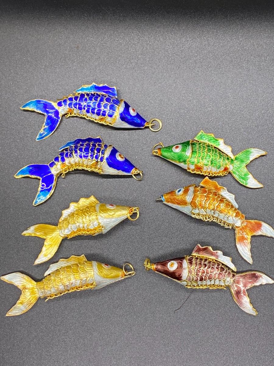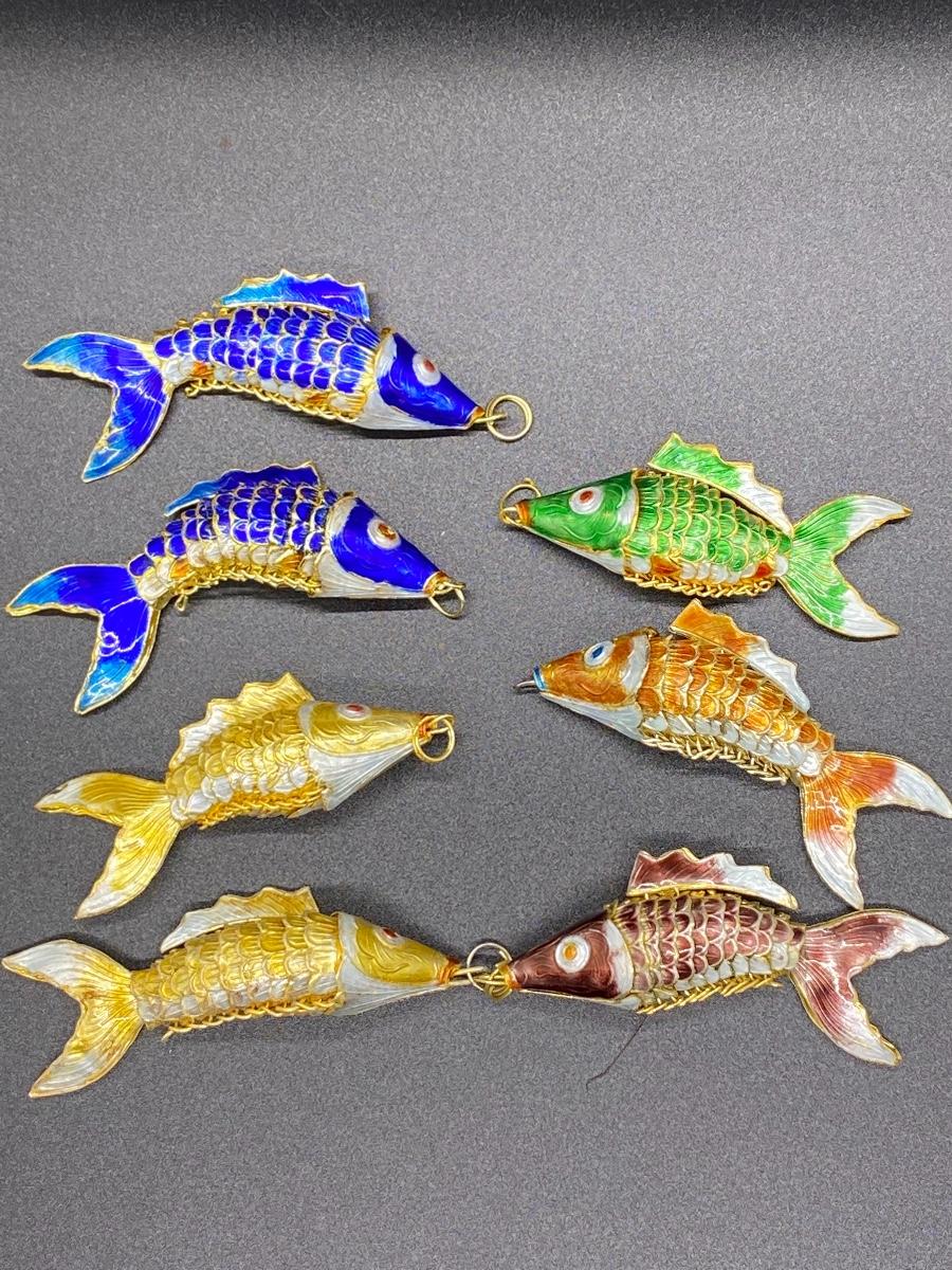 Colorful lot of 7 articulated fish pendants. About 3.5" size.