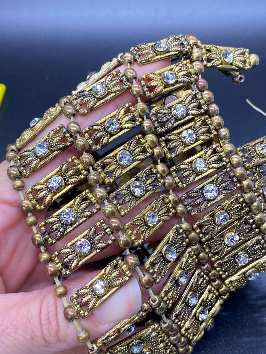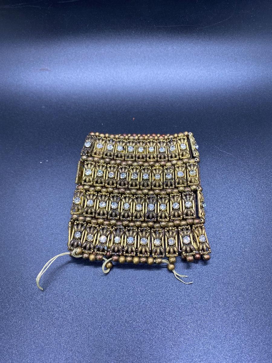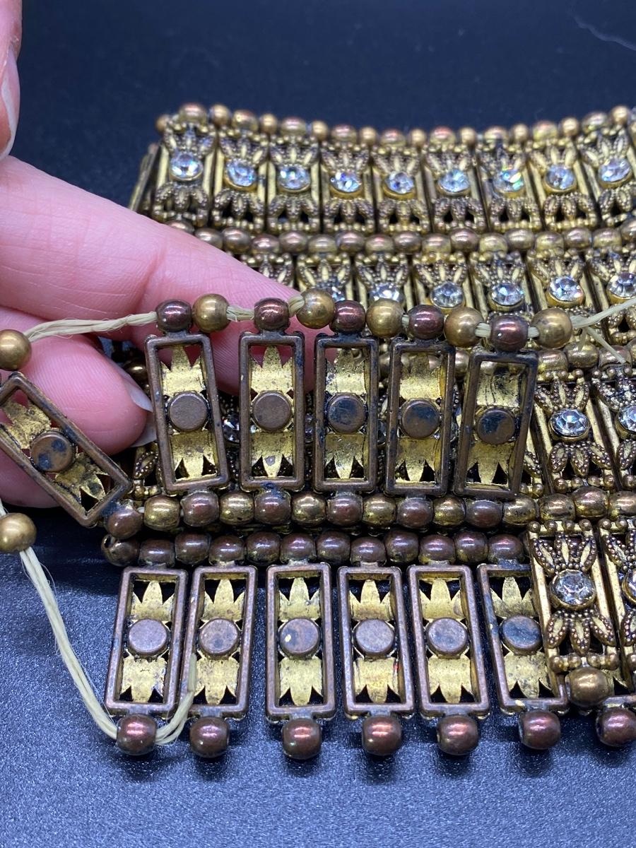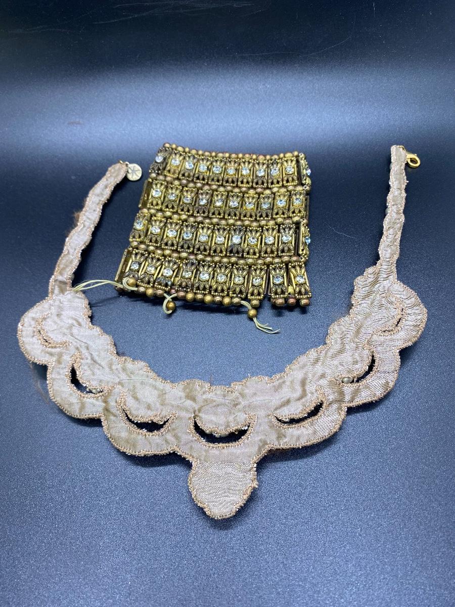 Interesting bead & rhinestone set. Choker style necklace is stitched to a fabric backing. Bracelet is stretch but needs to be repaired at one end as the elastic has broke.