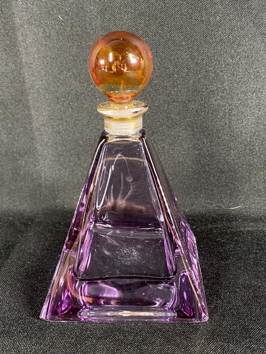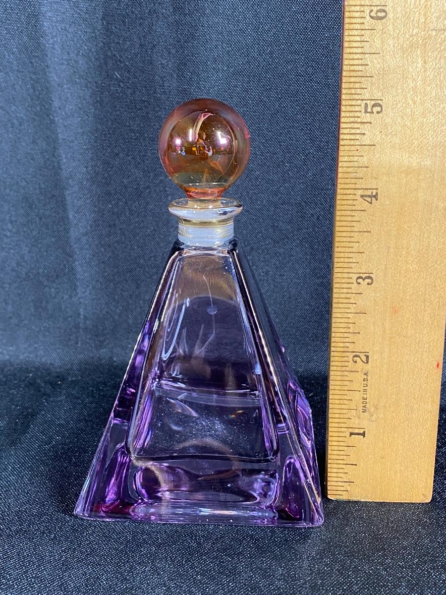 Violet purple with a gold stopper pyramid shaped glass perfume bottle. Excellent condition. 5" tall.