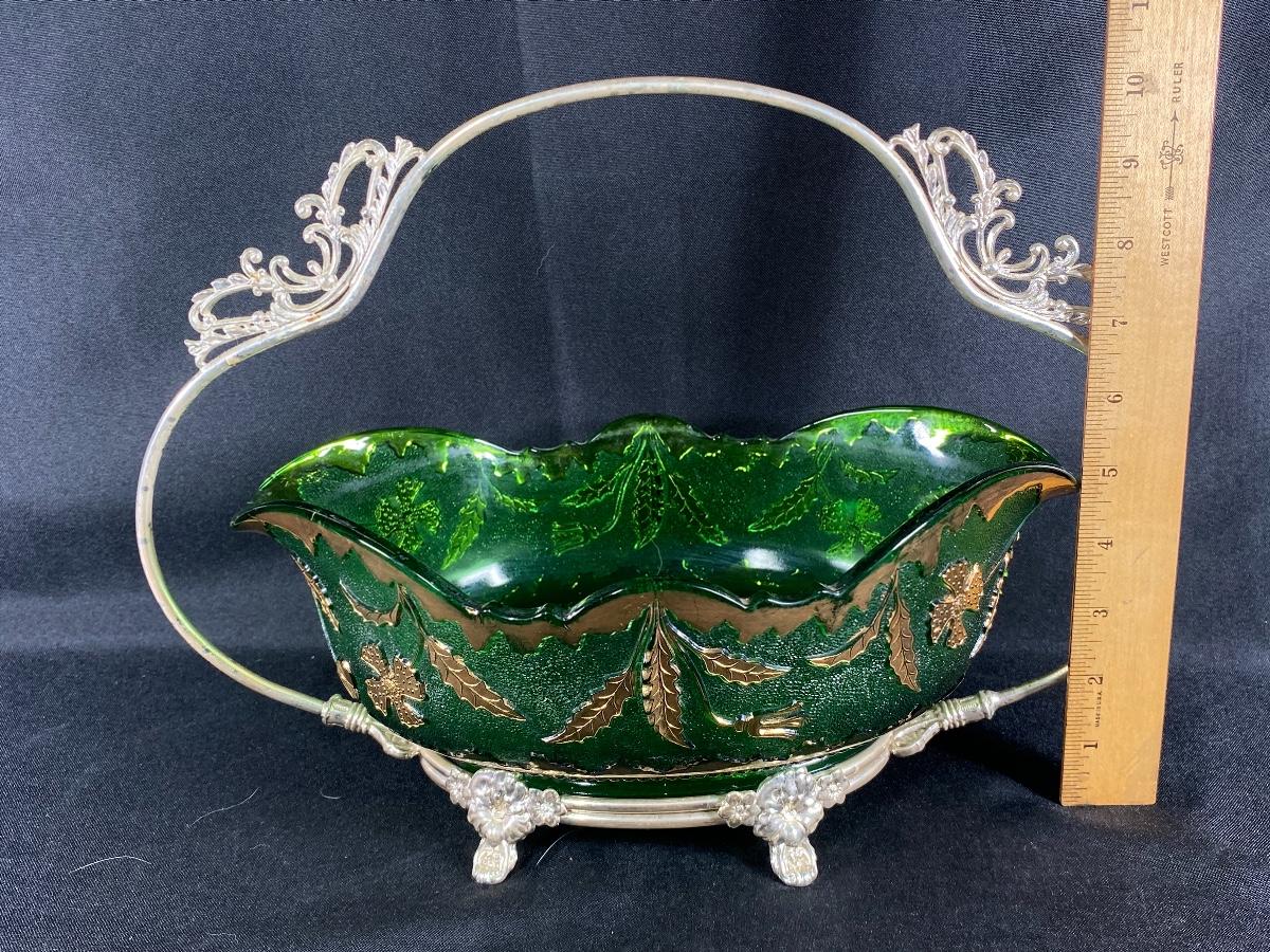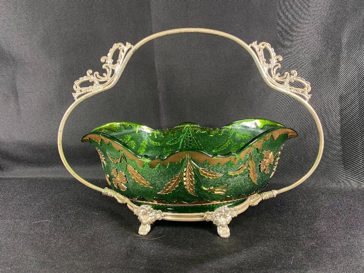 Antique pressed green glass serving bowl with metal caddy. Fluted oval shape bowl, wheat flower embossed design in gold. Has a silvertone metal serving caddy. In good condition. No chips, a little haze to the caddy metal. About 14" across and 10" tall.