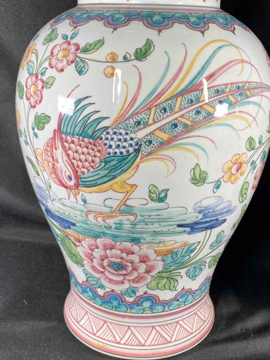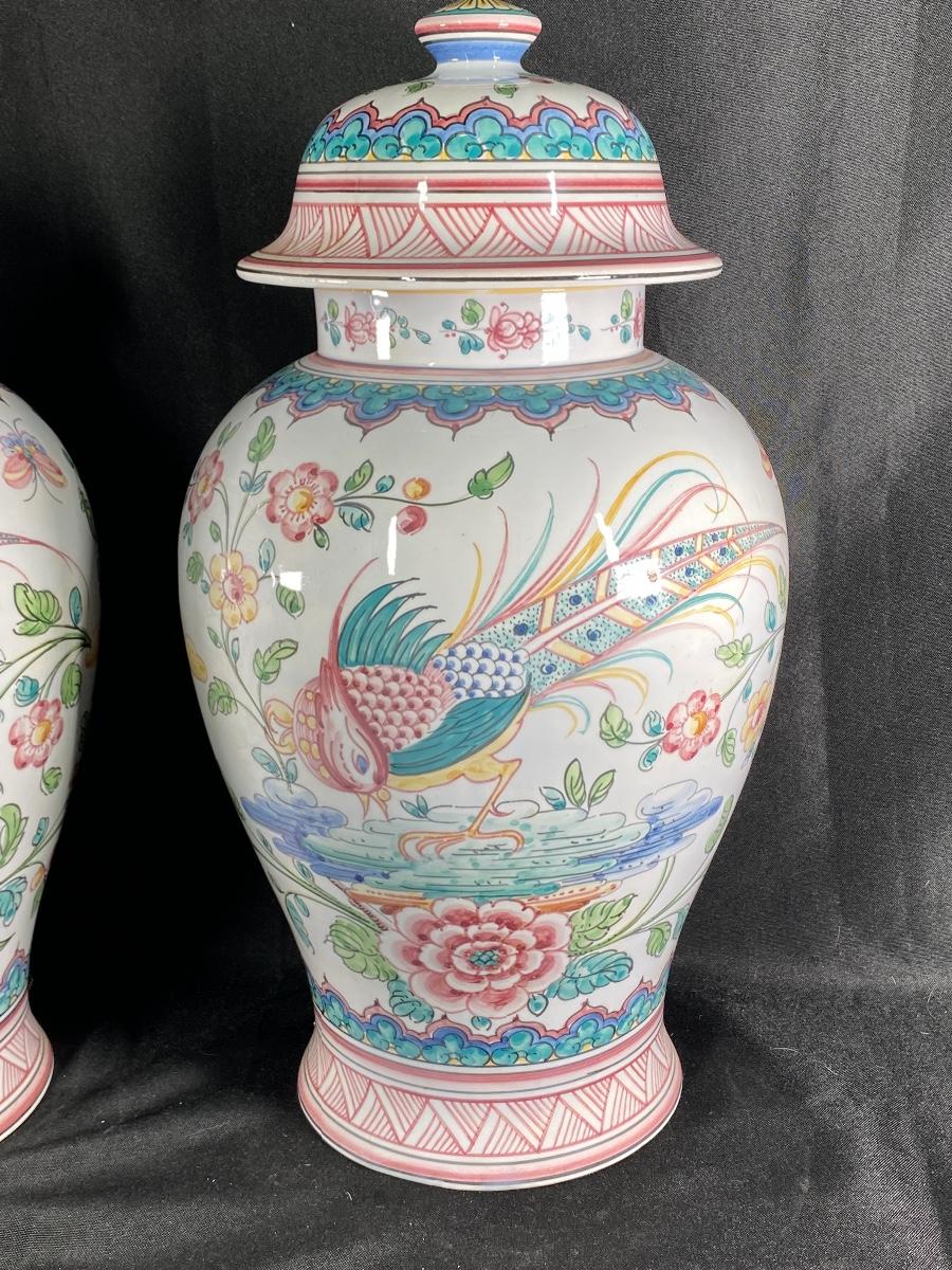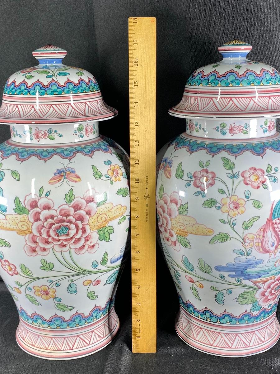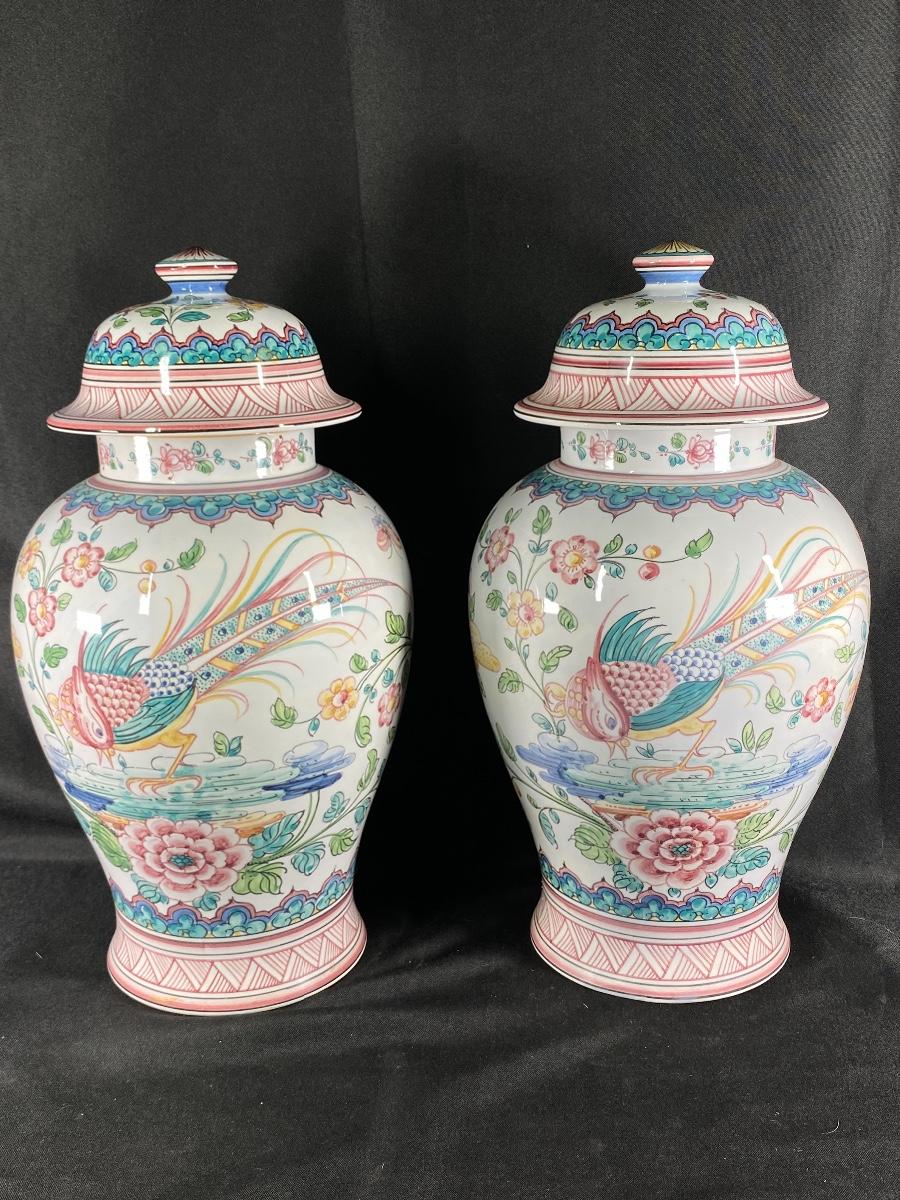 Hand painted in Portugal, a beautiful pair of large ginger pots. Pastel colors, ornate designs with flowers and pheasants. Almost identical designs, shapes and sizes of pattern are slightly different since they are hand painted. In good condition, No damage noticed. Marked on the bottom. Stand at about 17".