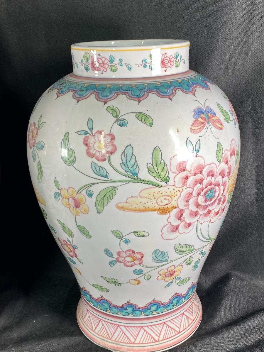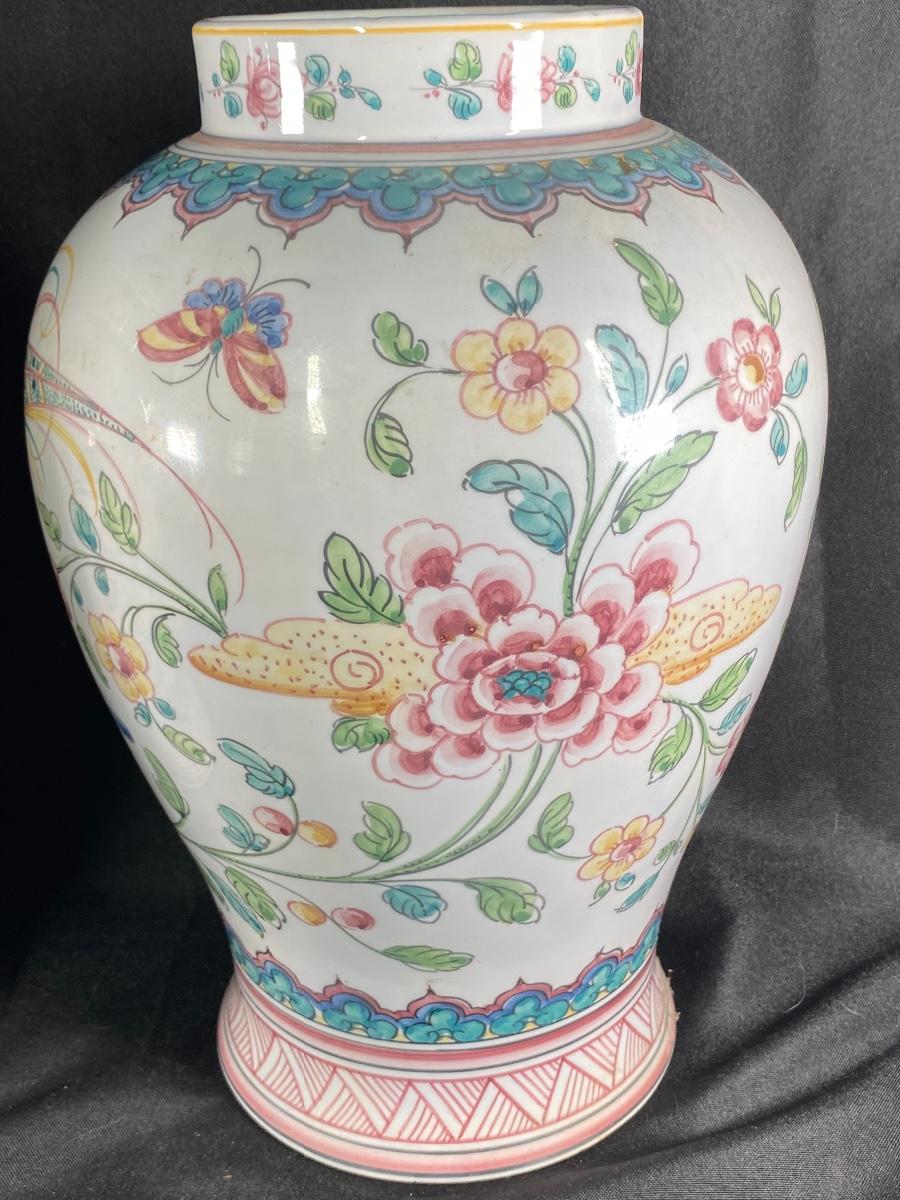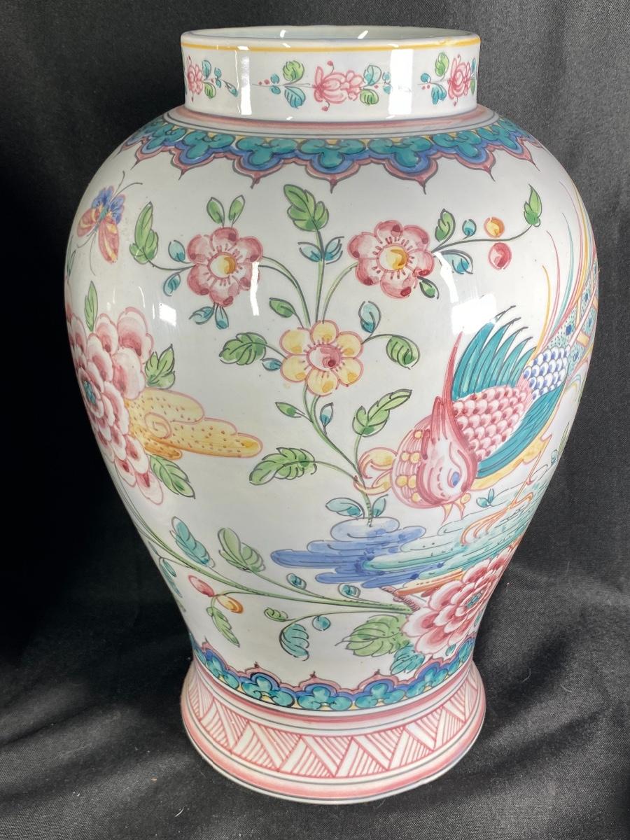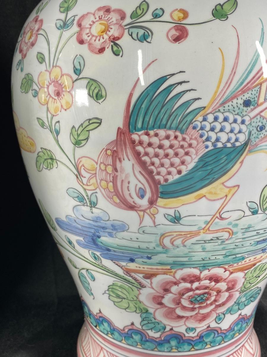 Hand painted in Portugal, a beautiful pair of large ginger pots. Pastel colors, ornate designs with flowers and pheasants. Almost identical designs, shapes and sizes of pattern are slightly different since they are hand painted. In good condition, No damage noticed. Marked on the bottom. Stand at about 17".