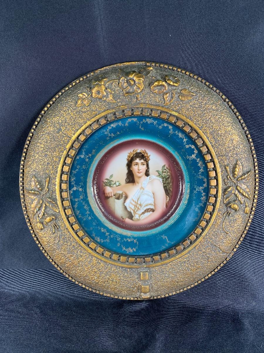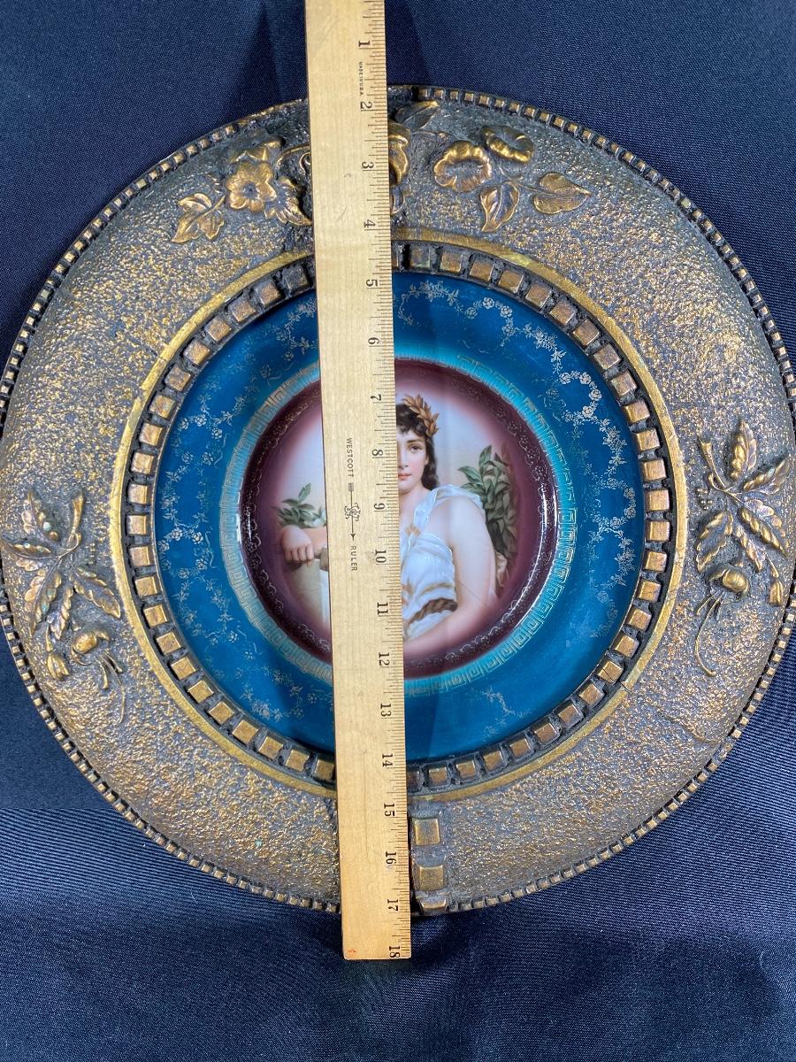 Vintage Royal Munich framed portrait plate. Features a goddess like woman in the center. Light wear but in good displaying condition. About 16" diameter.