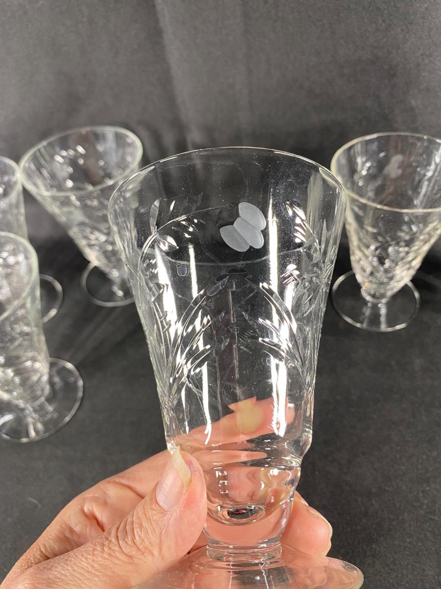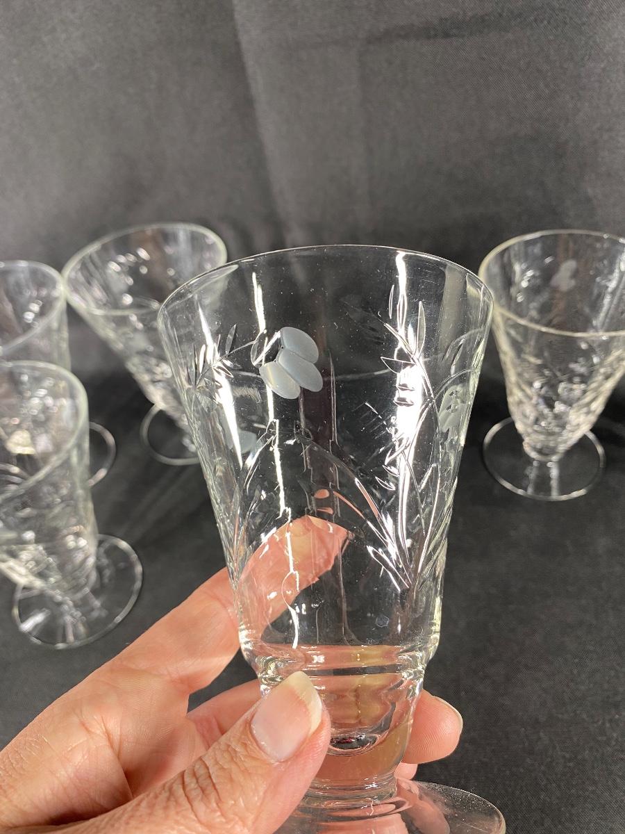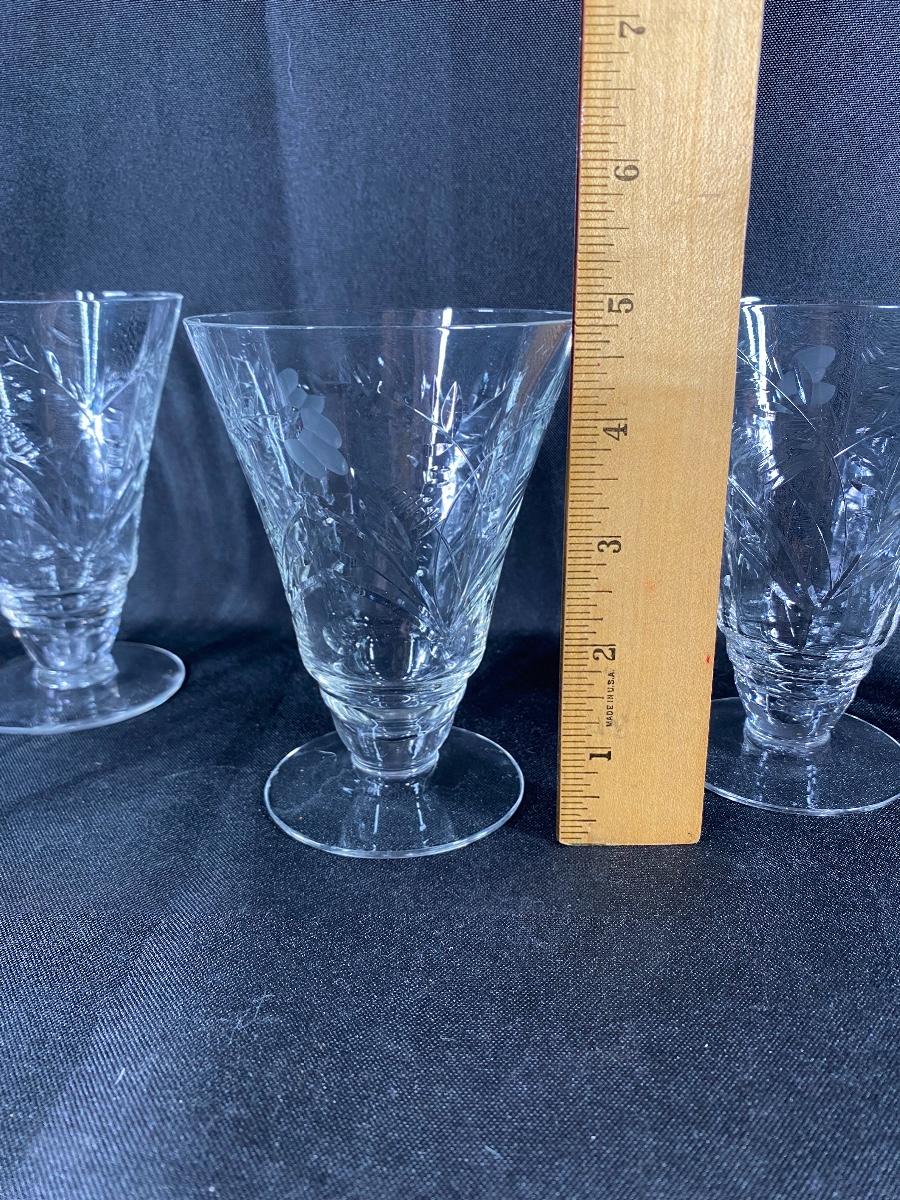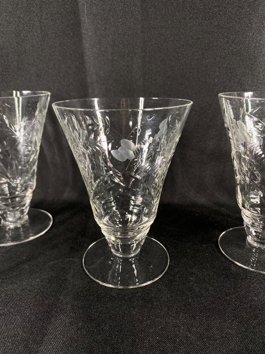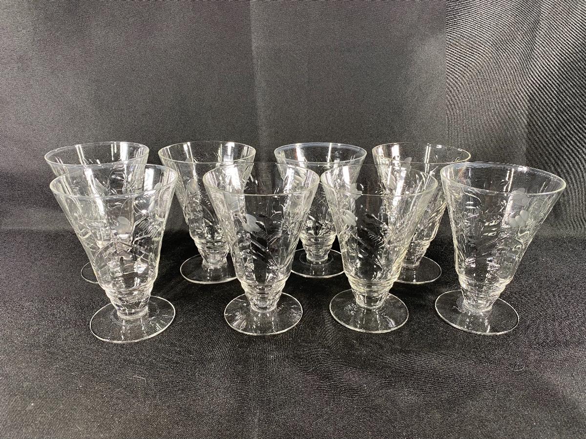 Set of 8 flower etched parfait glasses. Good condition. 5" tall. There may be a flea bite chip or two along edge, looks like previous owner had any chips sanded smooth.