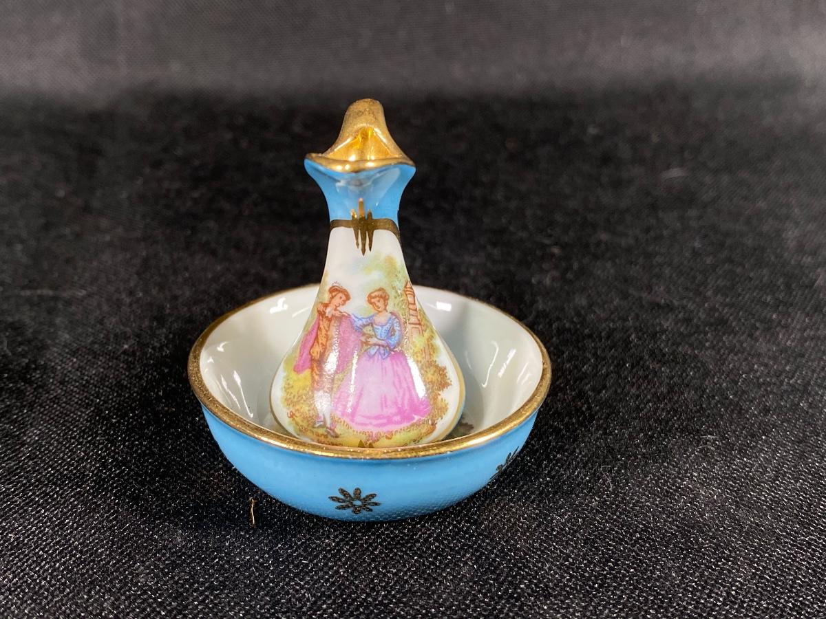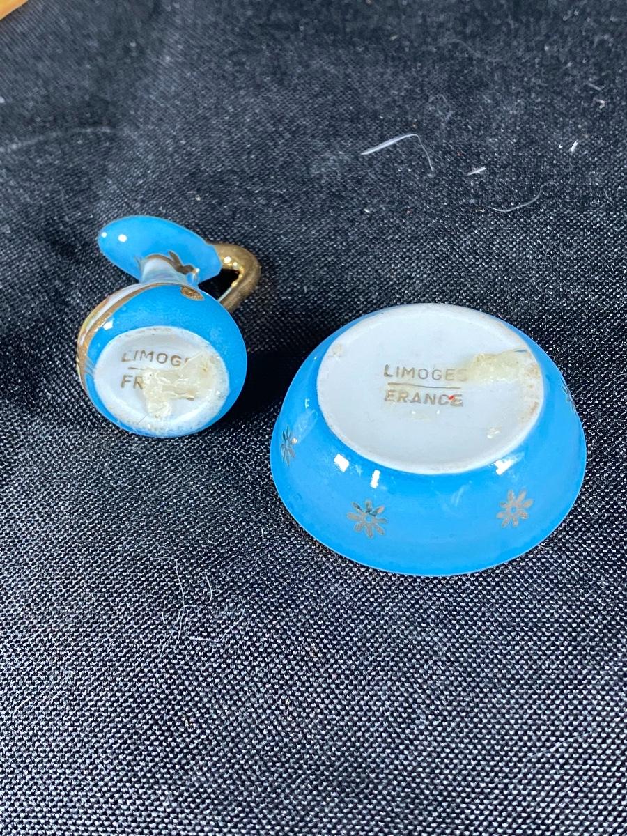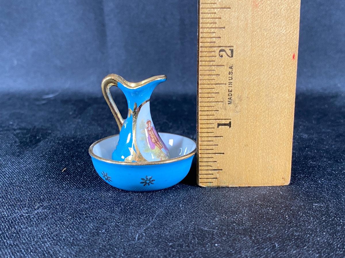Miniature Limoges France wash bowl and pitcher. Robin egg blue with gold accent, has Victorian couple imagery on both pieces. Stamped on bottoms. Only about 1.5" size.