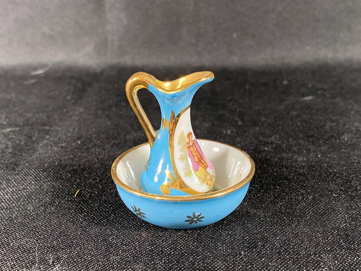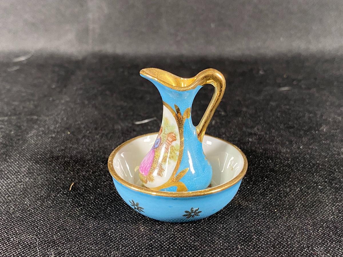 Limoges France Blue Gold Victorian Couple Miniature Wash Basin & Pitcher