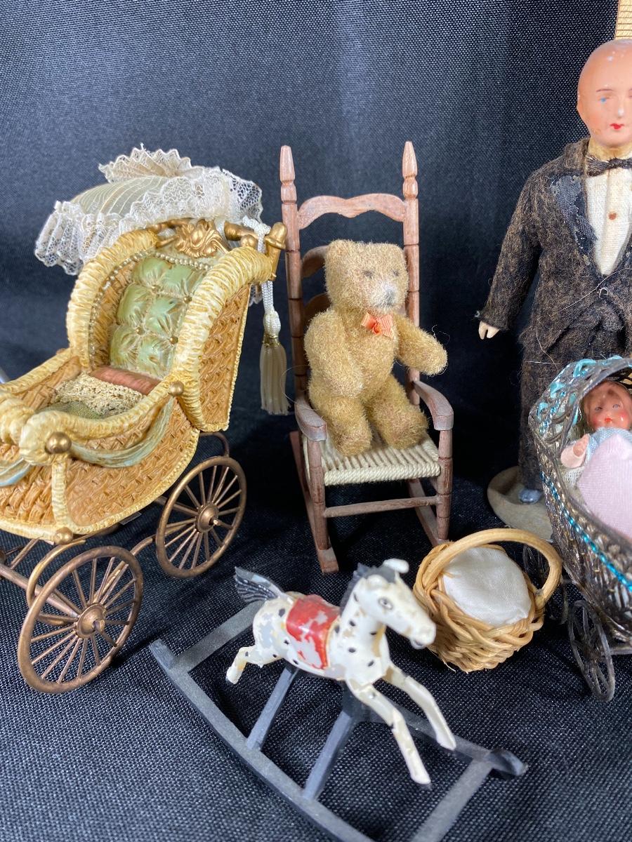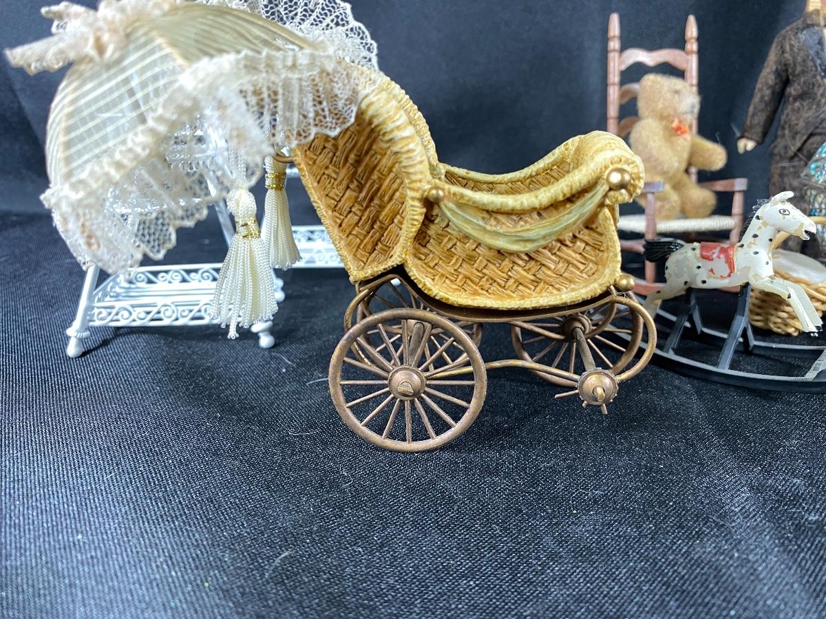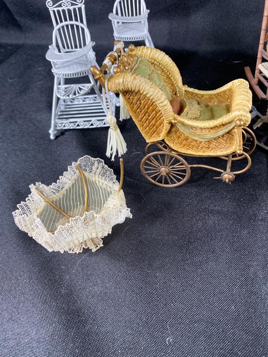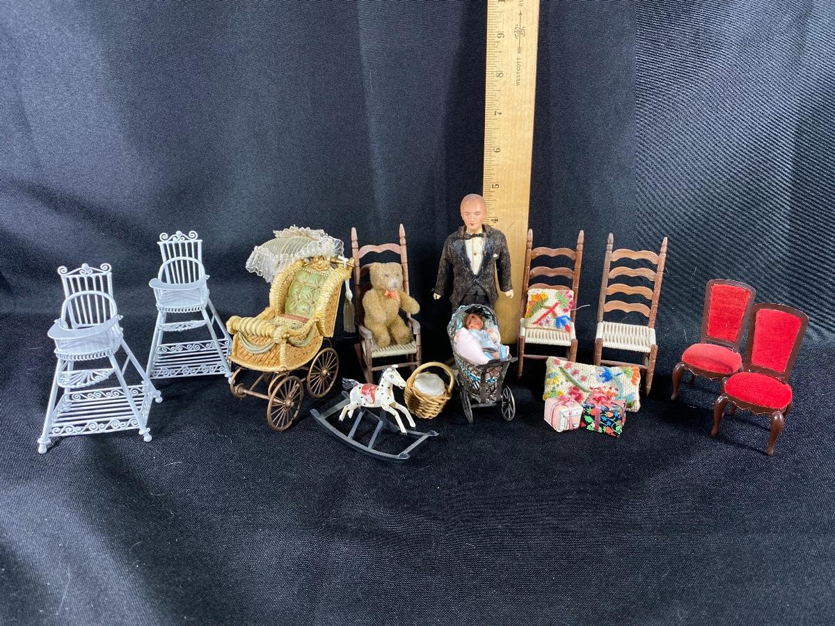 Mixed lot of dollhouse miniatures. Everything photo'd included. The larger baby carriage does have a damaged wheel and parasol has broken off. See photos.