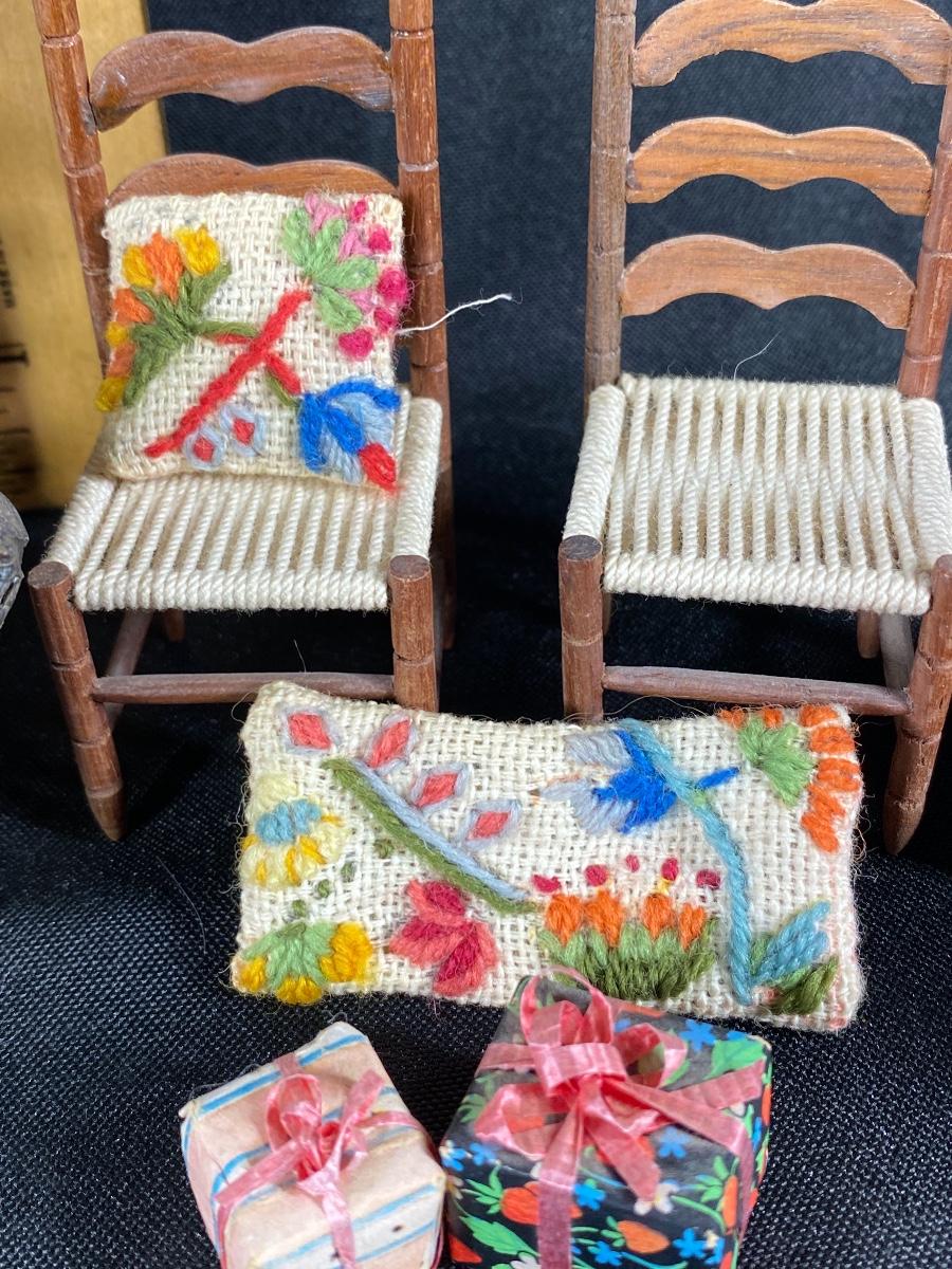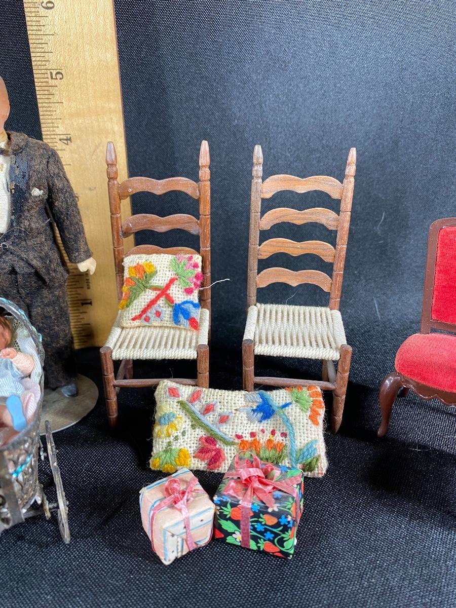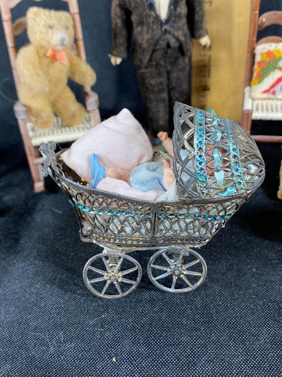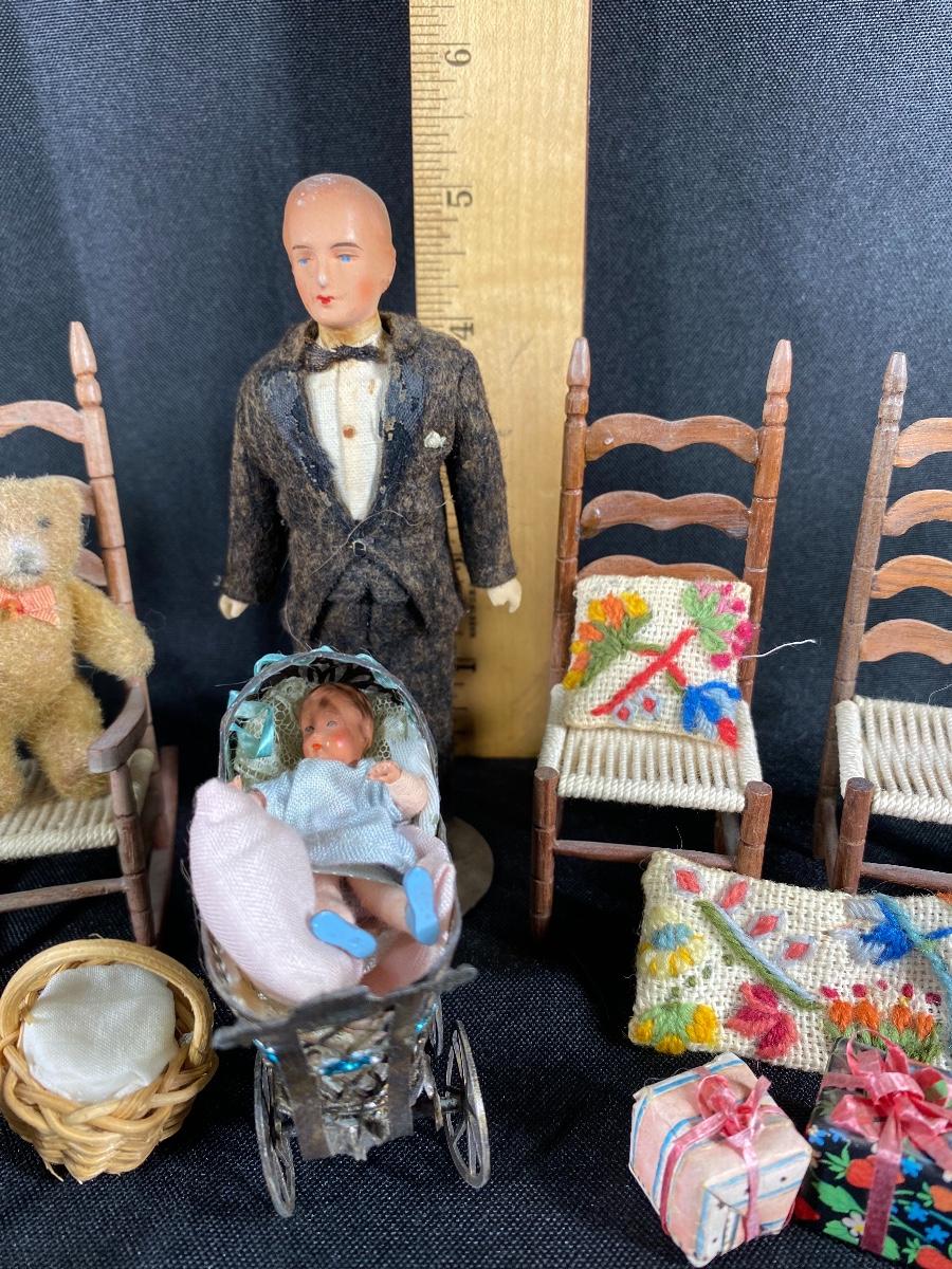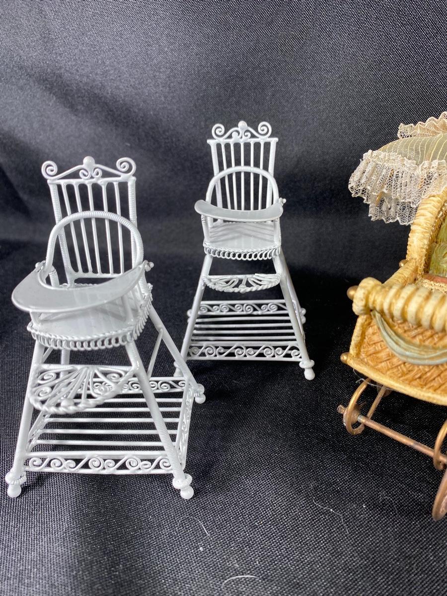 Mixed lot of dollhouse miniatures. Everything photo'd included. The larger baby carriage does have a damaged wheel and parasol has broken off. See photos.