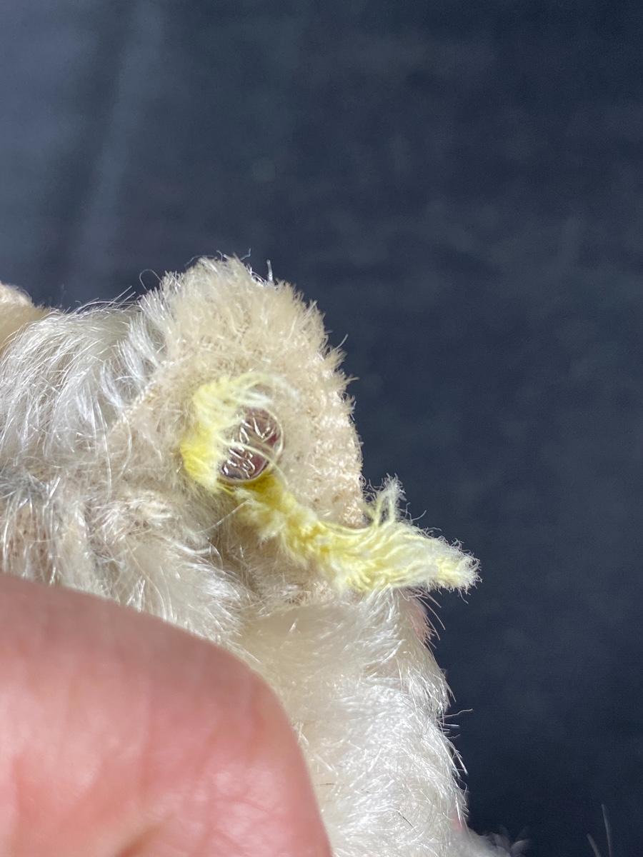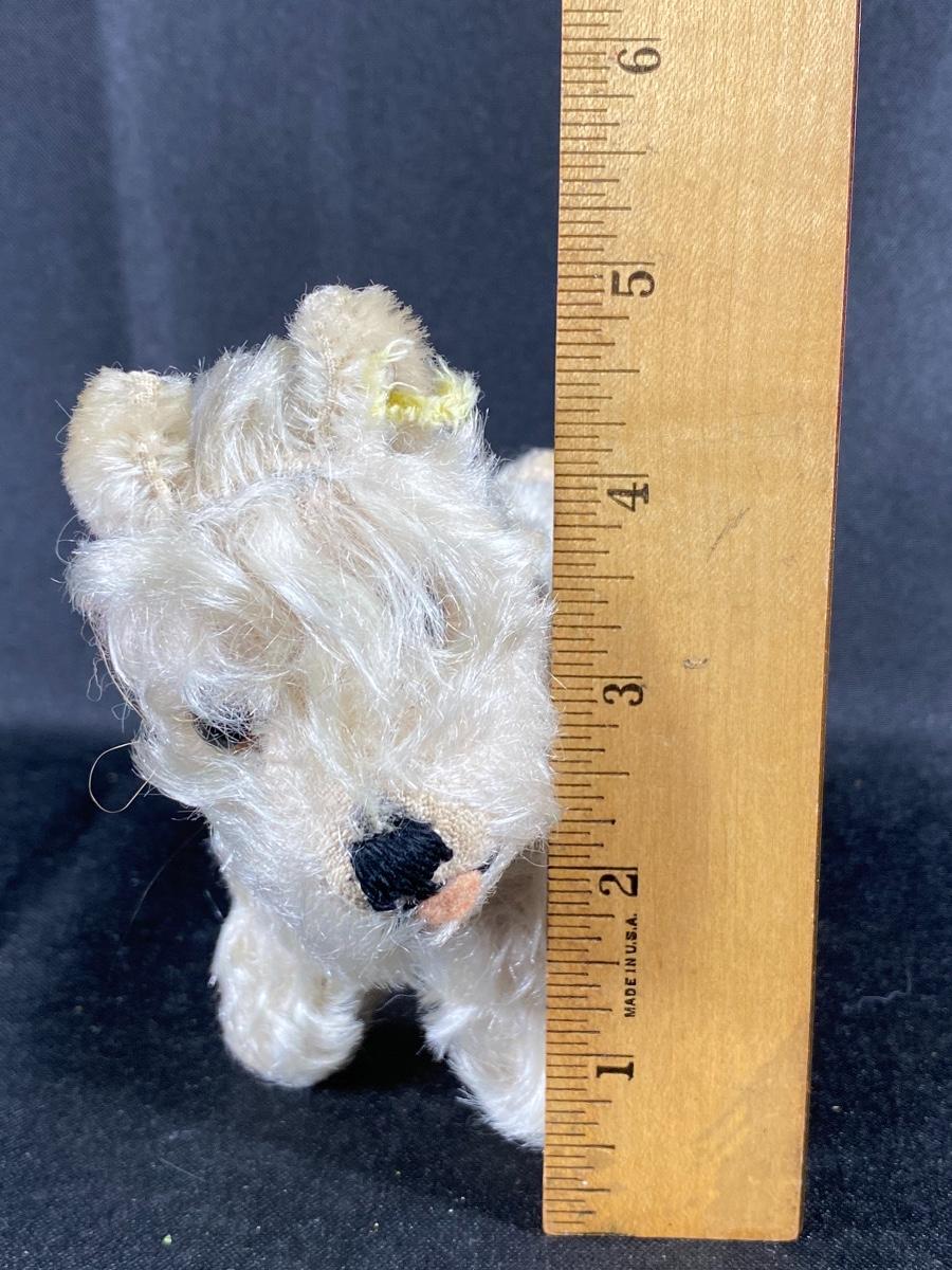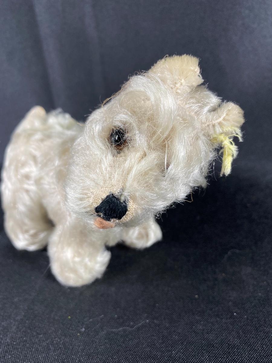 Small vintage terrier like Steiff plush dog. Has small worn piece of yellow tag and ear button. Mohair fur is worn in spots. Head turns. Under 5" size.
