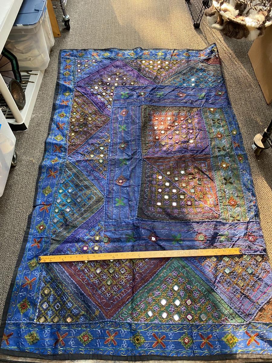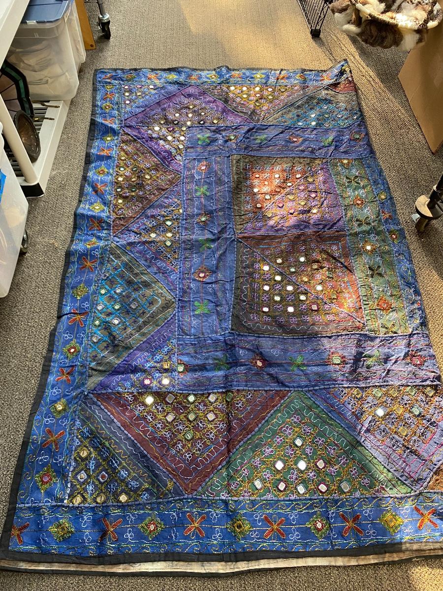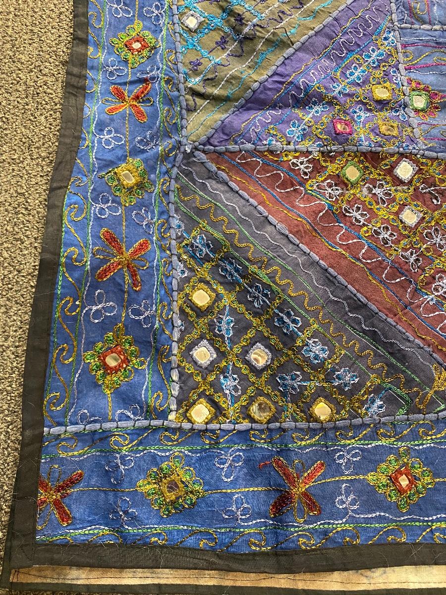Colorful wall tapestry, made in India. One side is colorful with stitched design and mirror accents, the other is a faded tye-dye look with a tribal pattern. Large size about 7' square. In good condition.