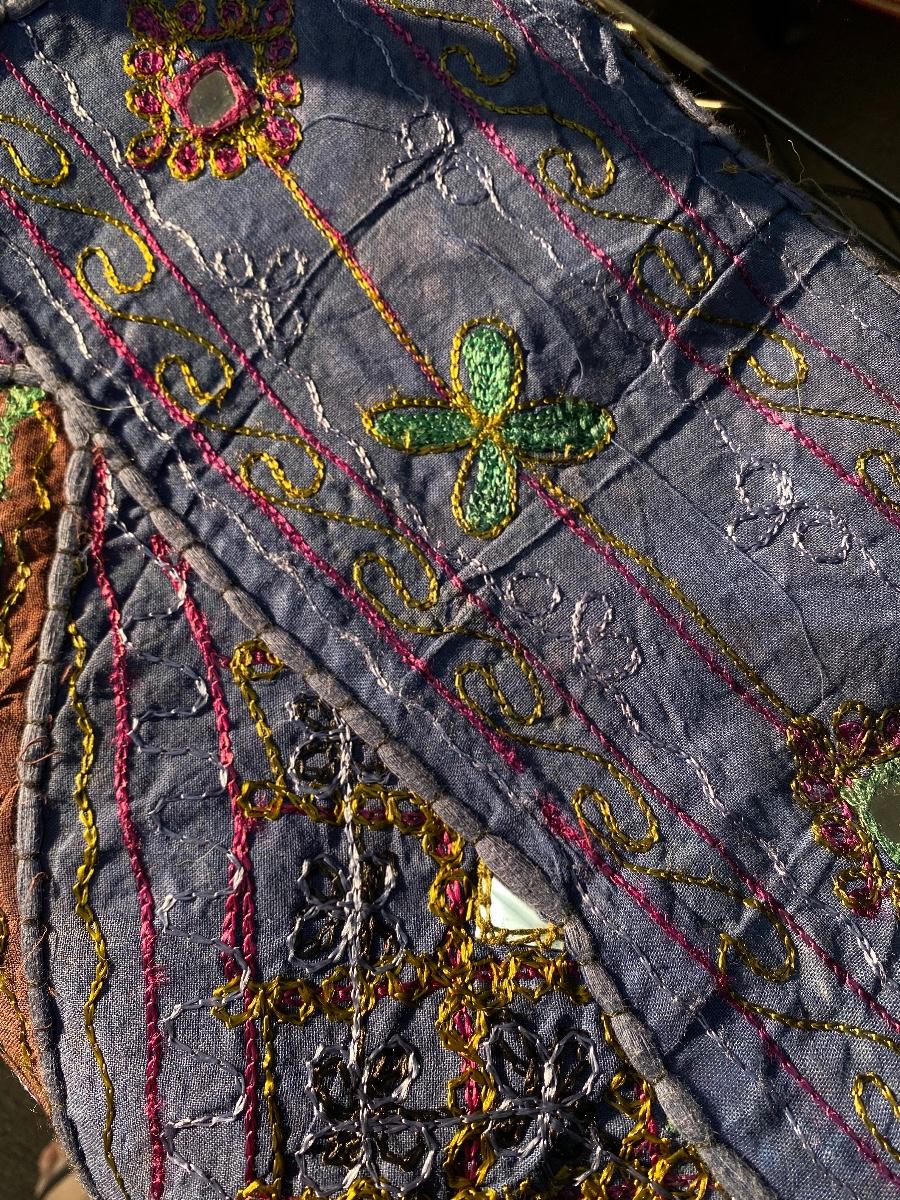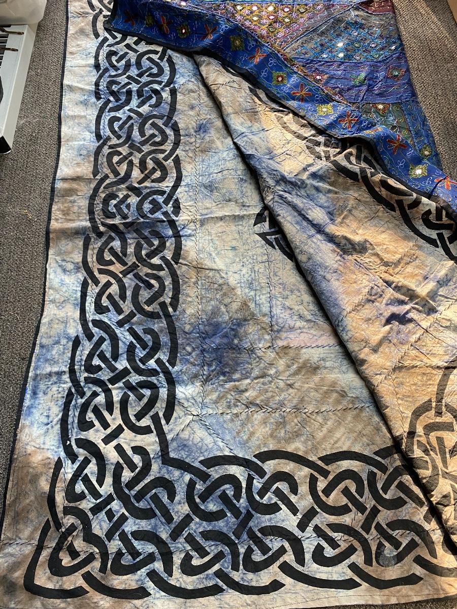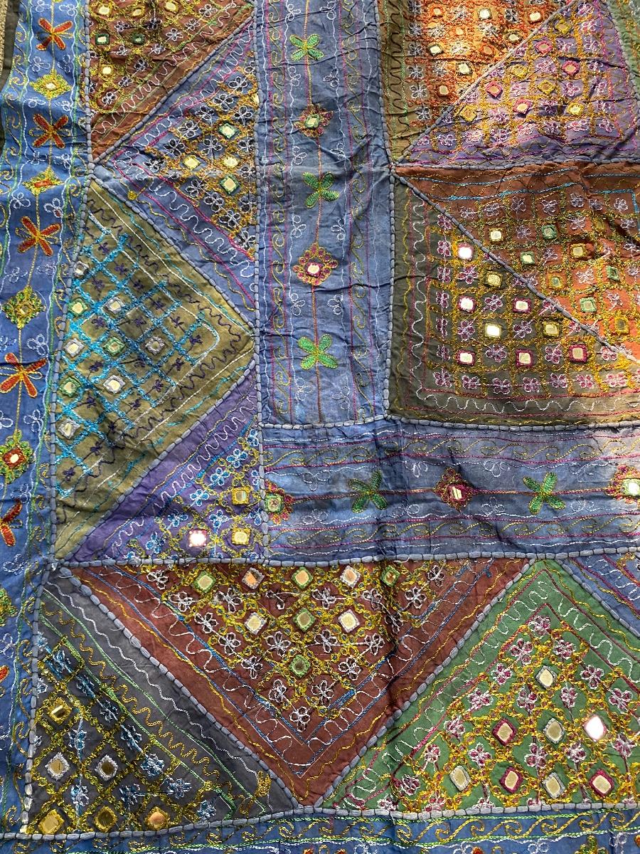 Colorful wall tapestry, made in India. One side is colorful with stitched design and mirror accents, the other is a faded tye-dye look with a tribal pattern. Large size about 7' square. In good condition.