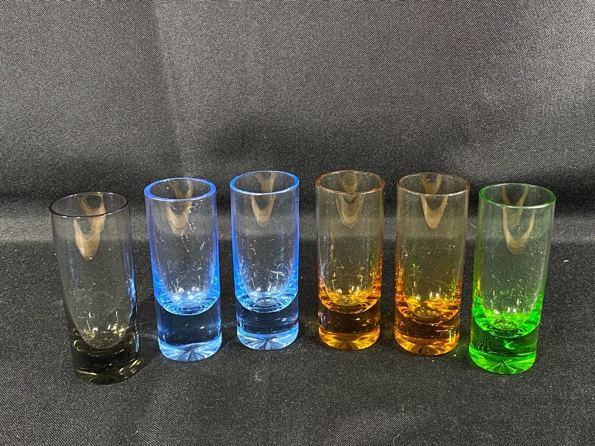 Set of 6 shot glasses, 4 colors, good condition.
