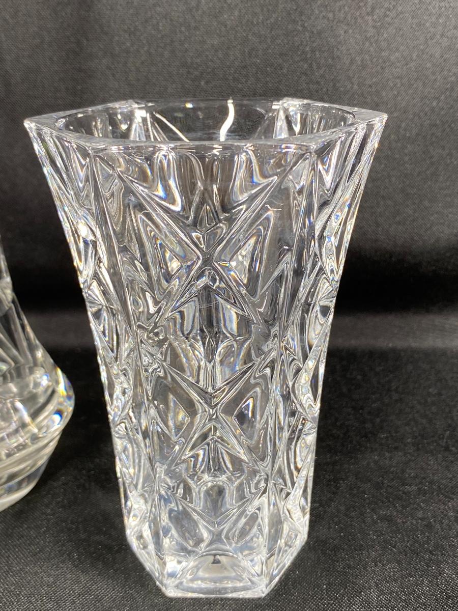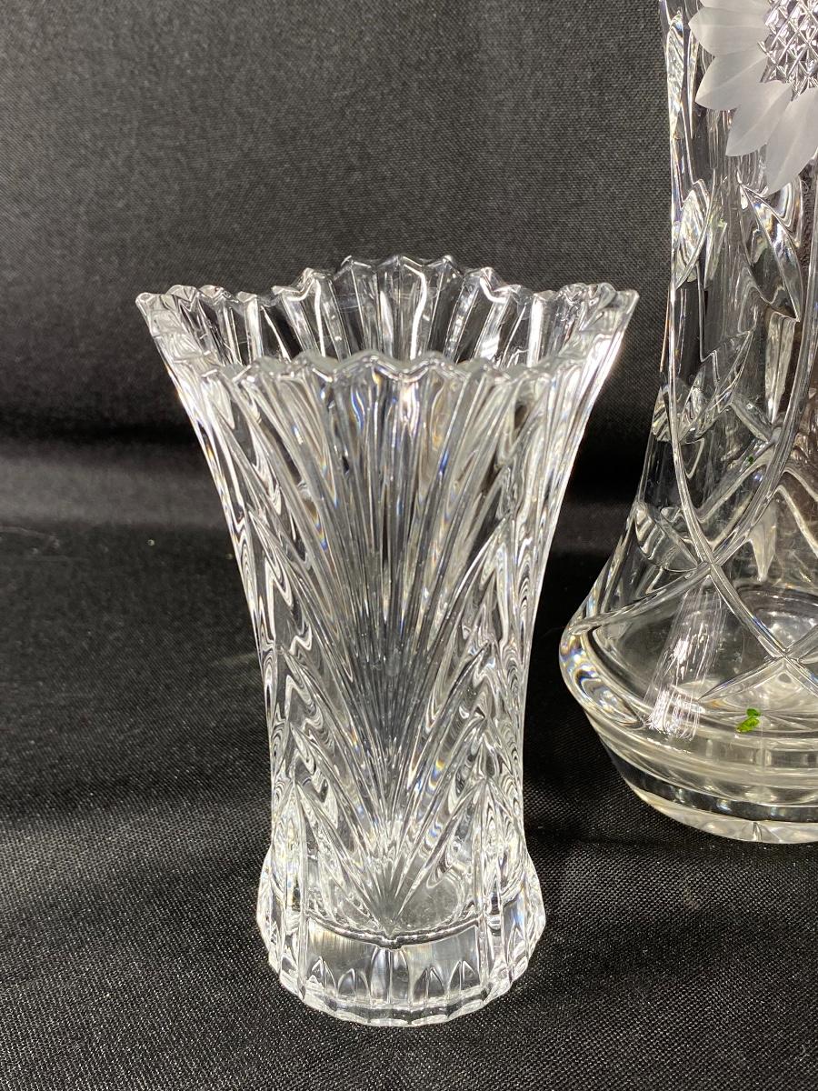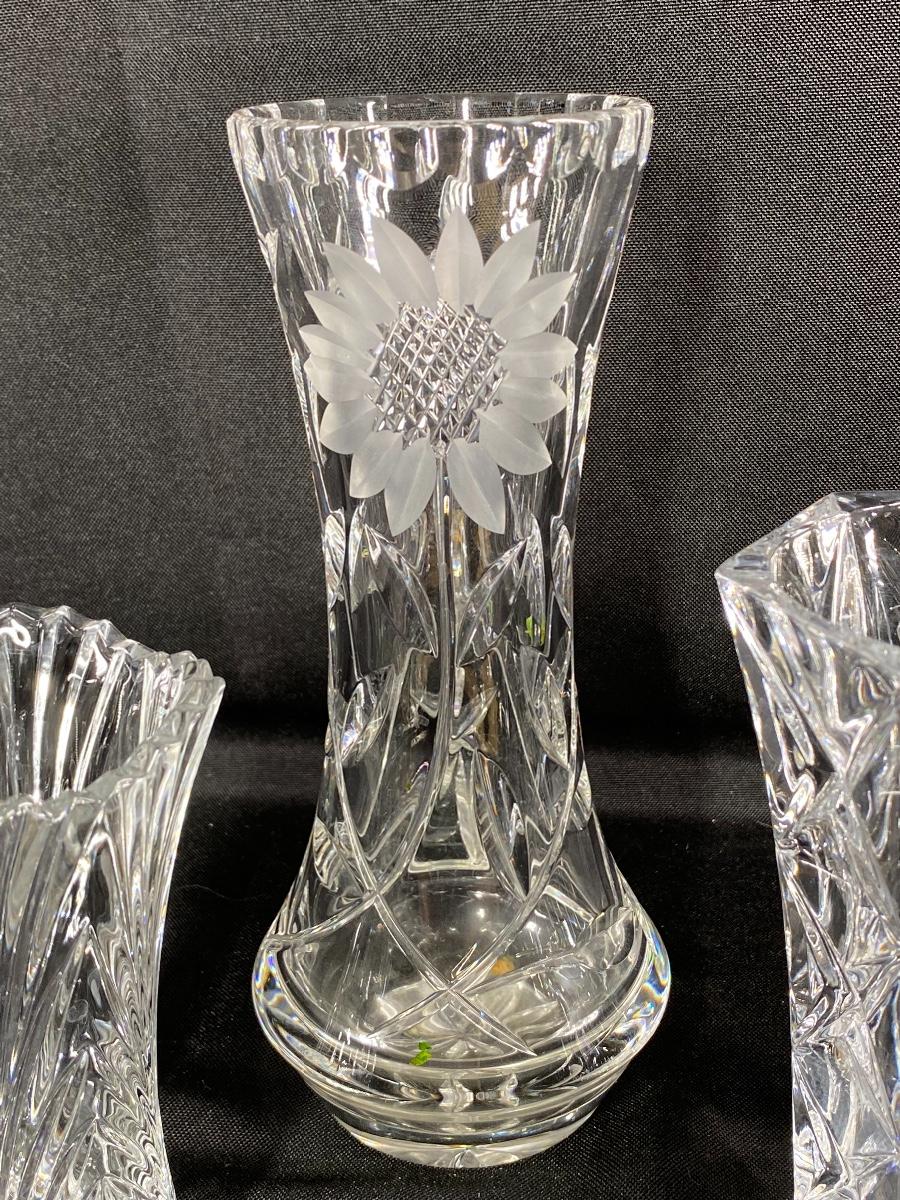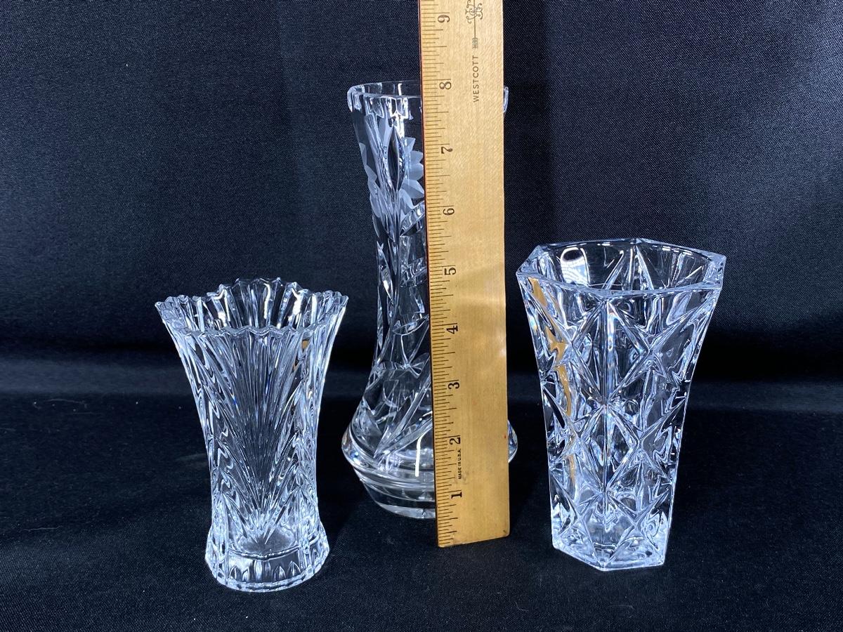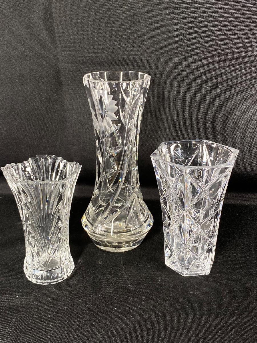 Set of three crystal vases. Good condition. Between 5" and 8" size.