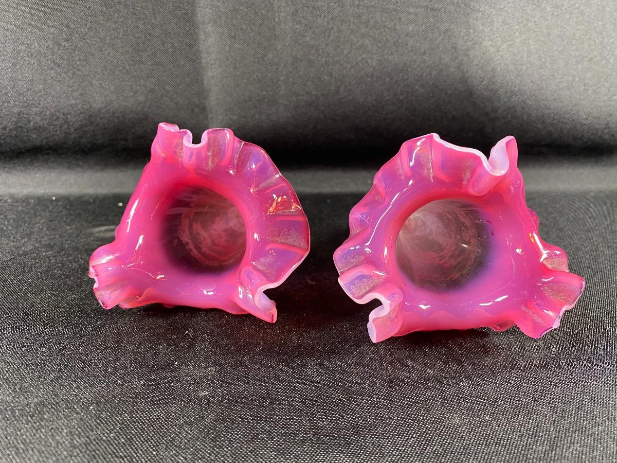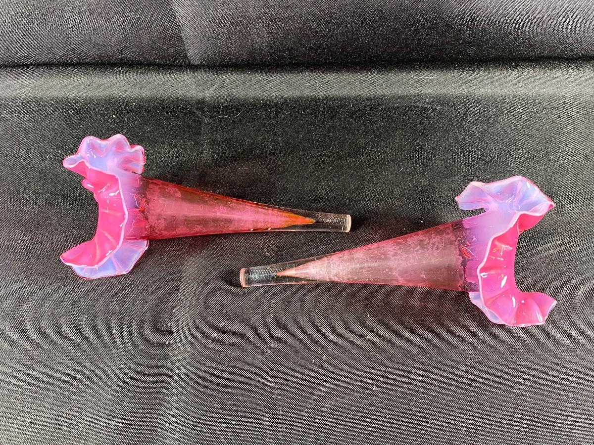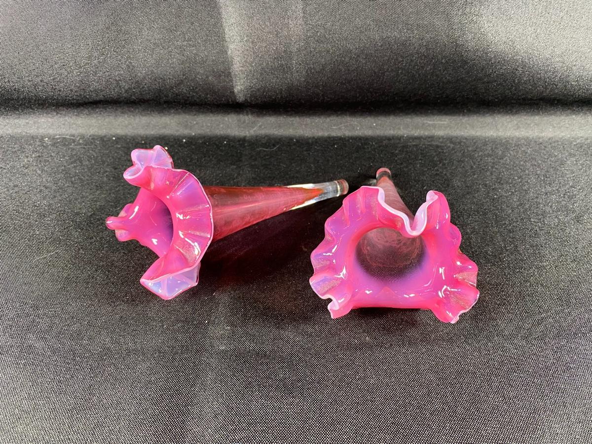 Pair of pink/white ruffled epergne horns. Horns only. Look like Fenton. No chips, need to be cleaned inside, well used.