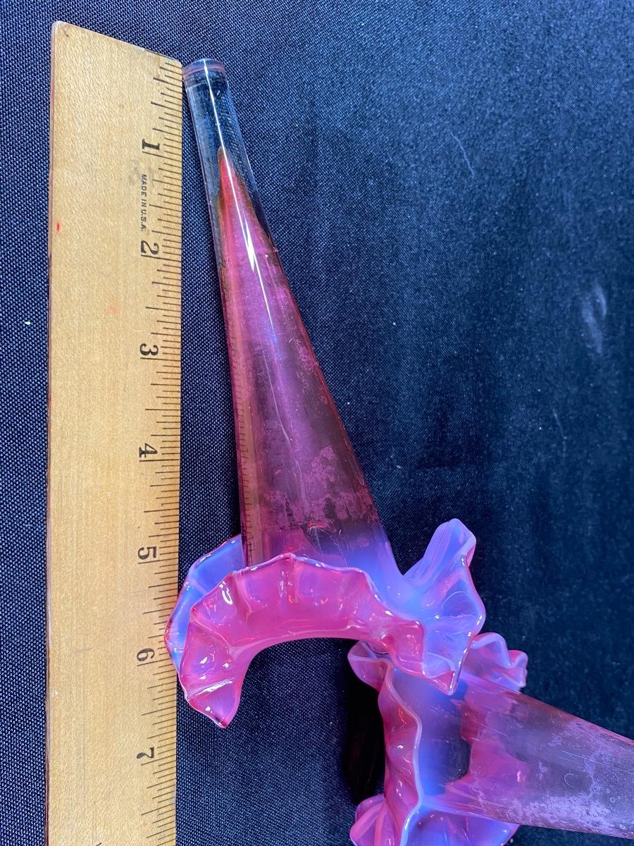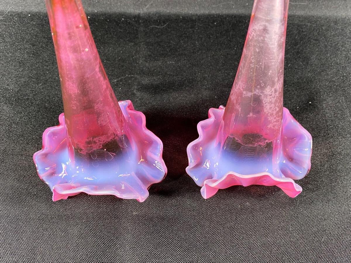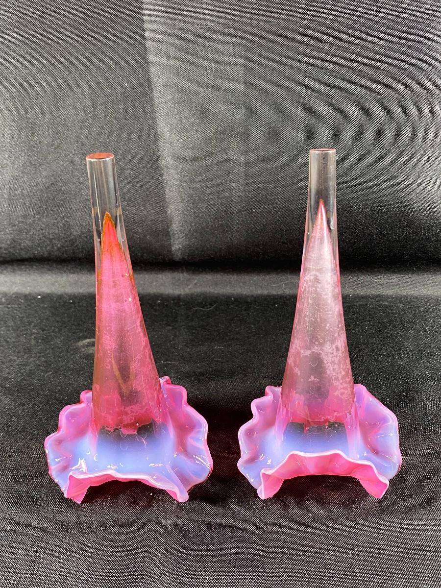 Pair of pink/white ruffled epergne horns. Horns only. Look like Fenton. No chips, need to be cleaned inside, well used.