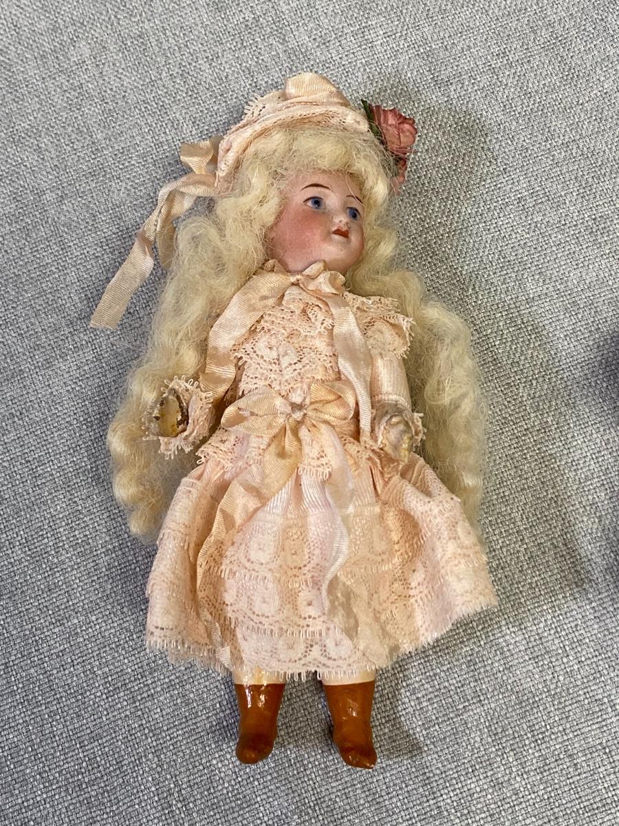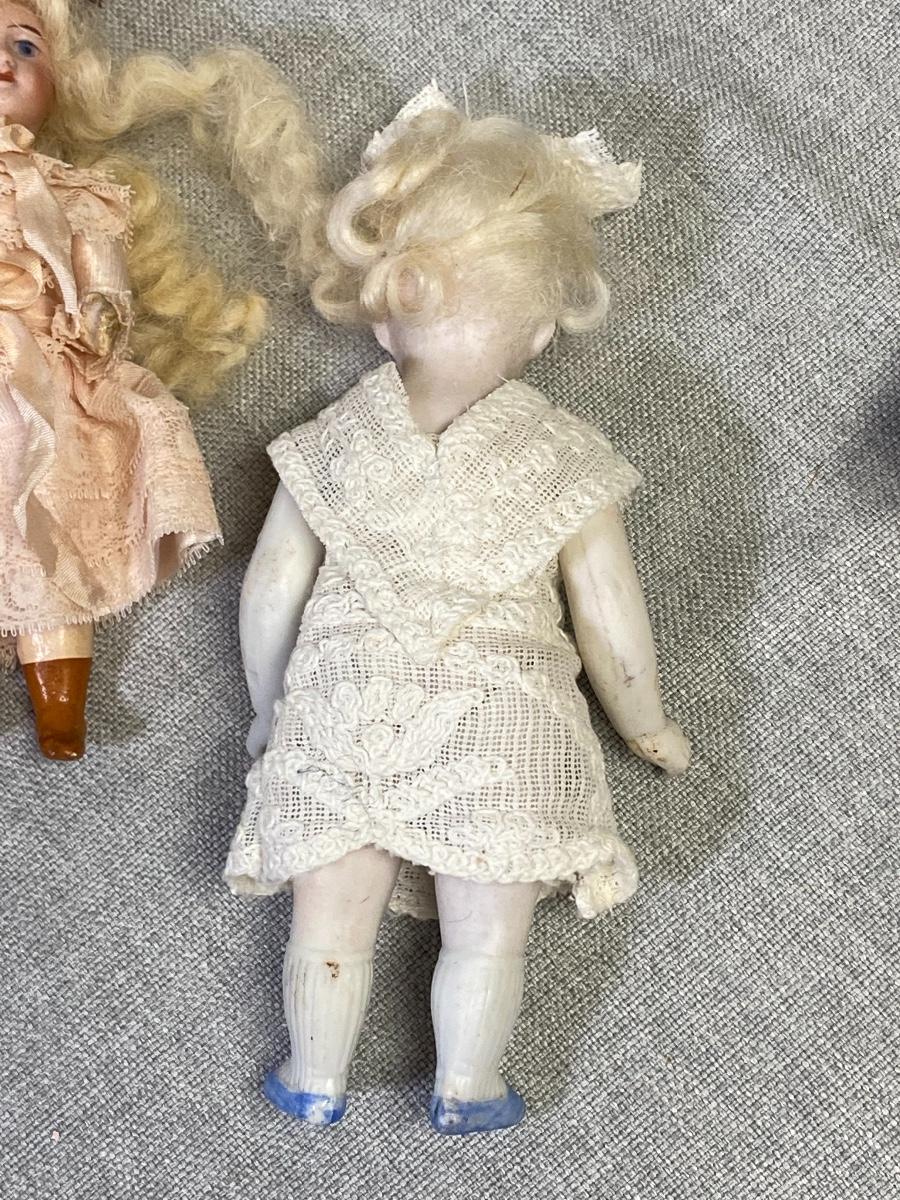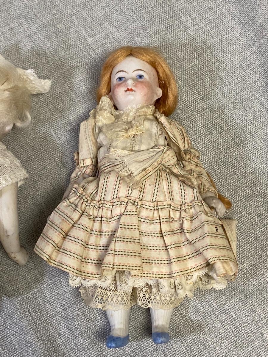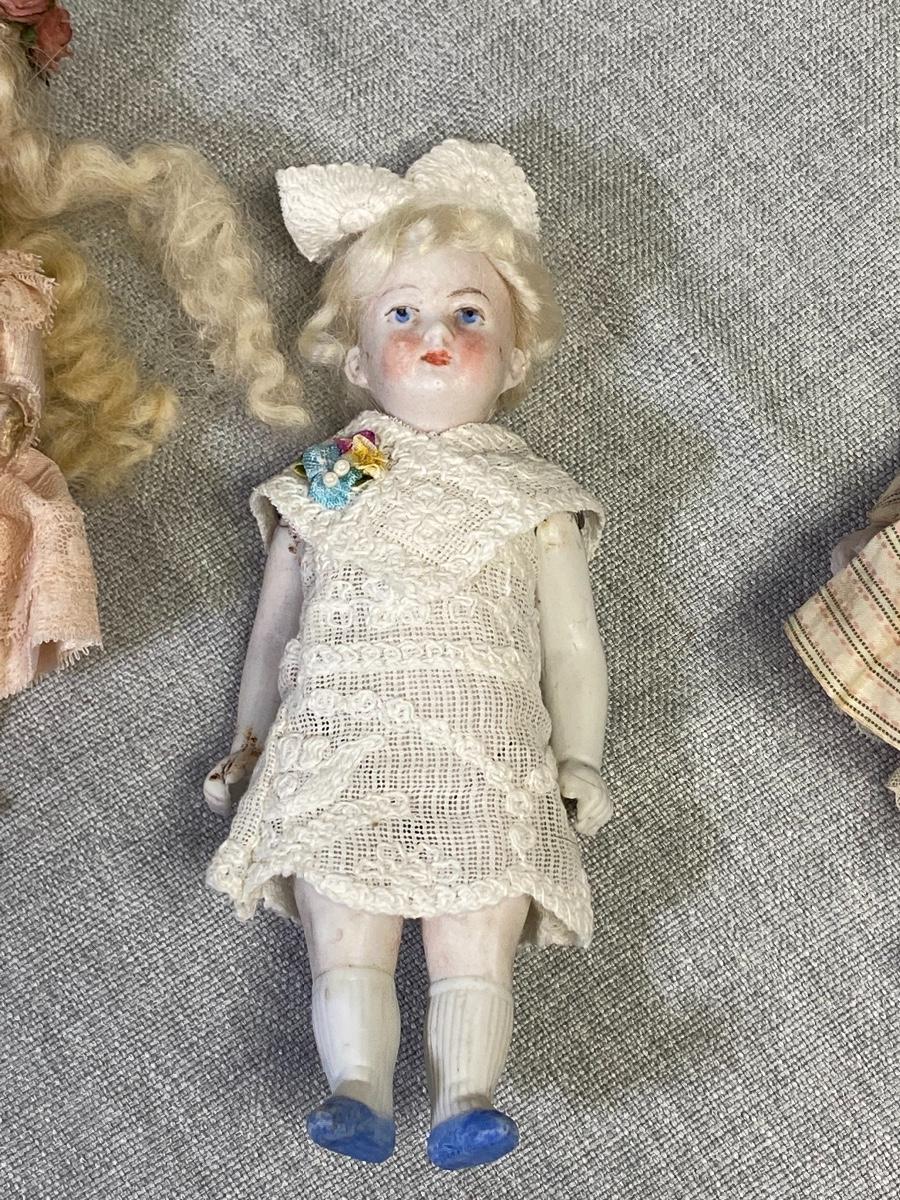 Set of 3 antique dollhouse size dolls. In good aged condition. The doll on left has a bisque head with composite body, the other two are bisque. Jointed. There are markings on two dolls, hard to make out. About 6" size.