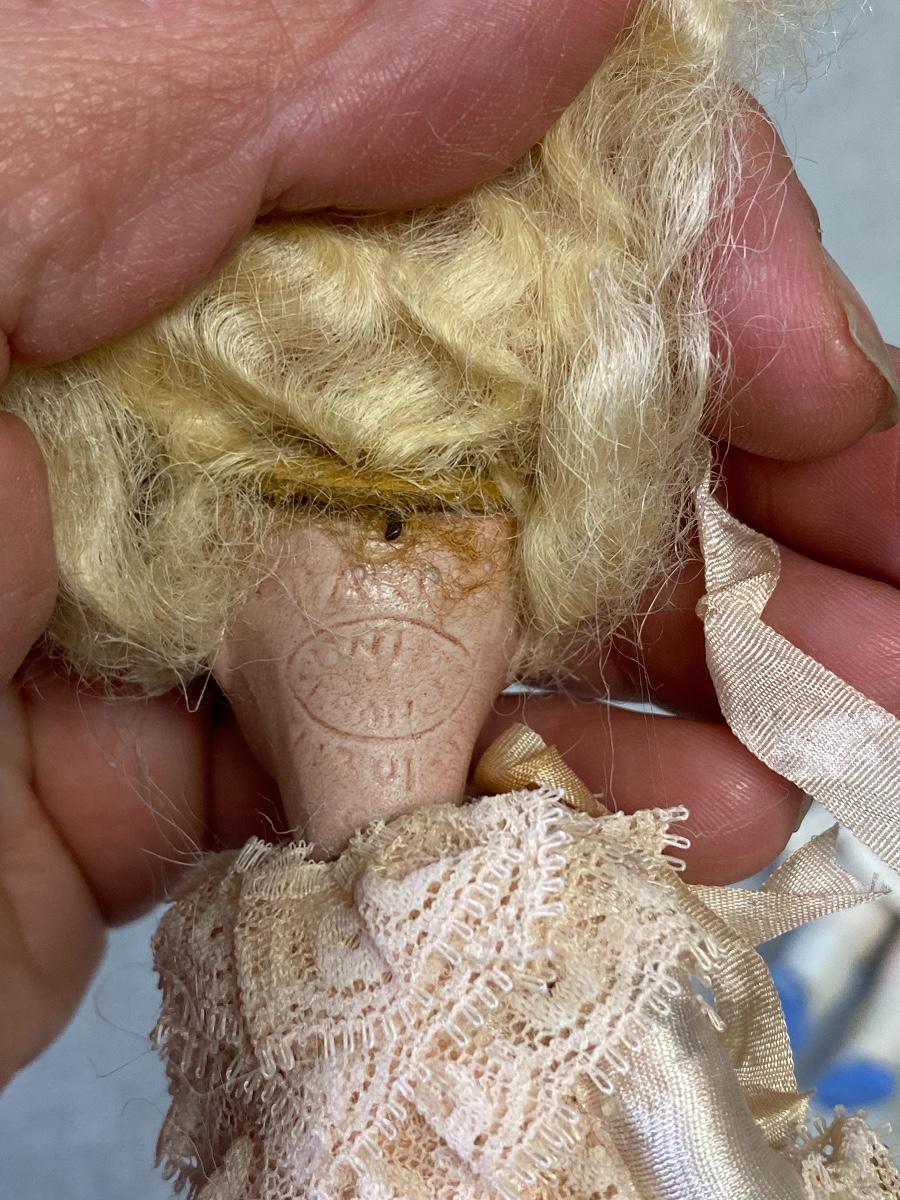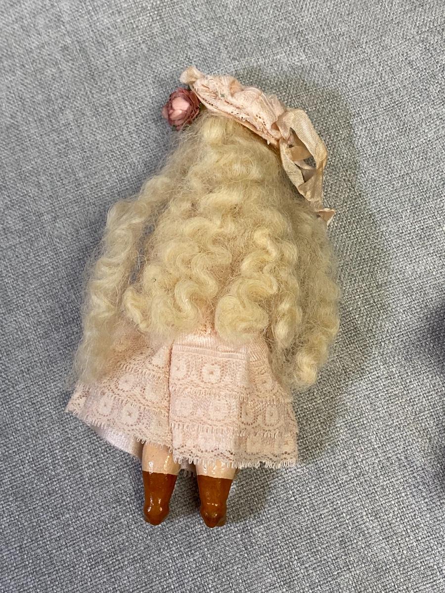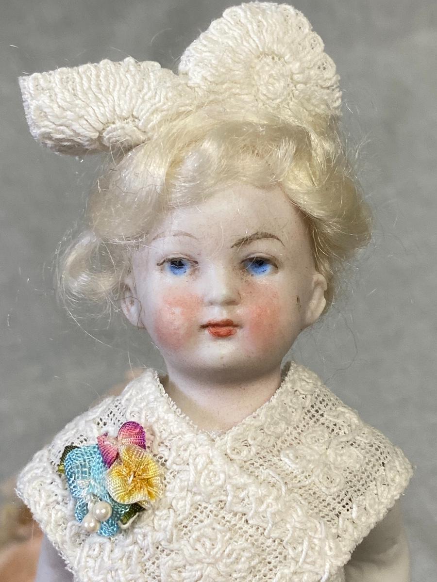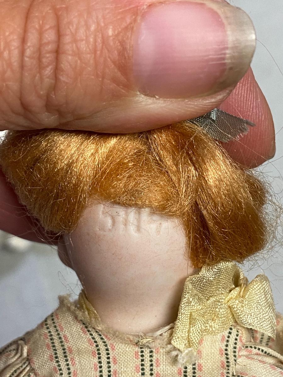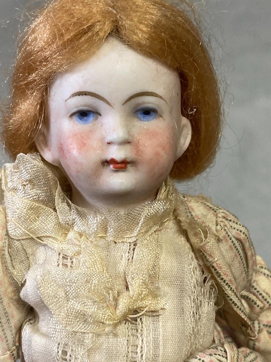 Set of 3 antique dollhouse size dolls. In good aged condition. The doll on left has a bisque head with composite body, the other two are bisque. Jointed. There are markings on two dolls, hard to make out. About 6" size.