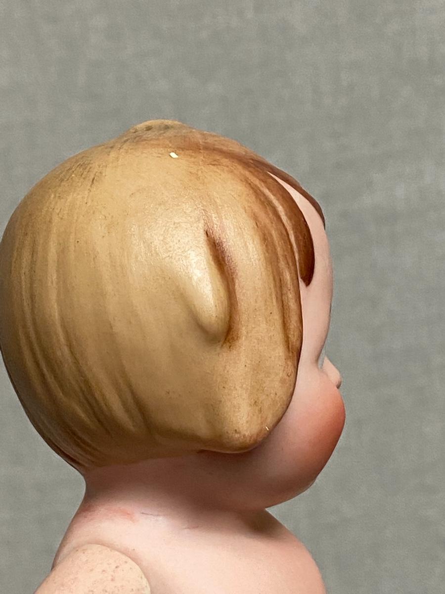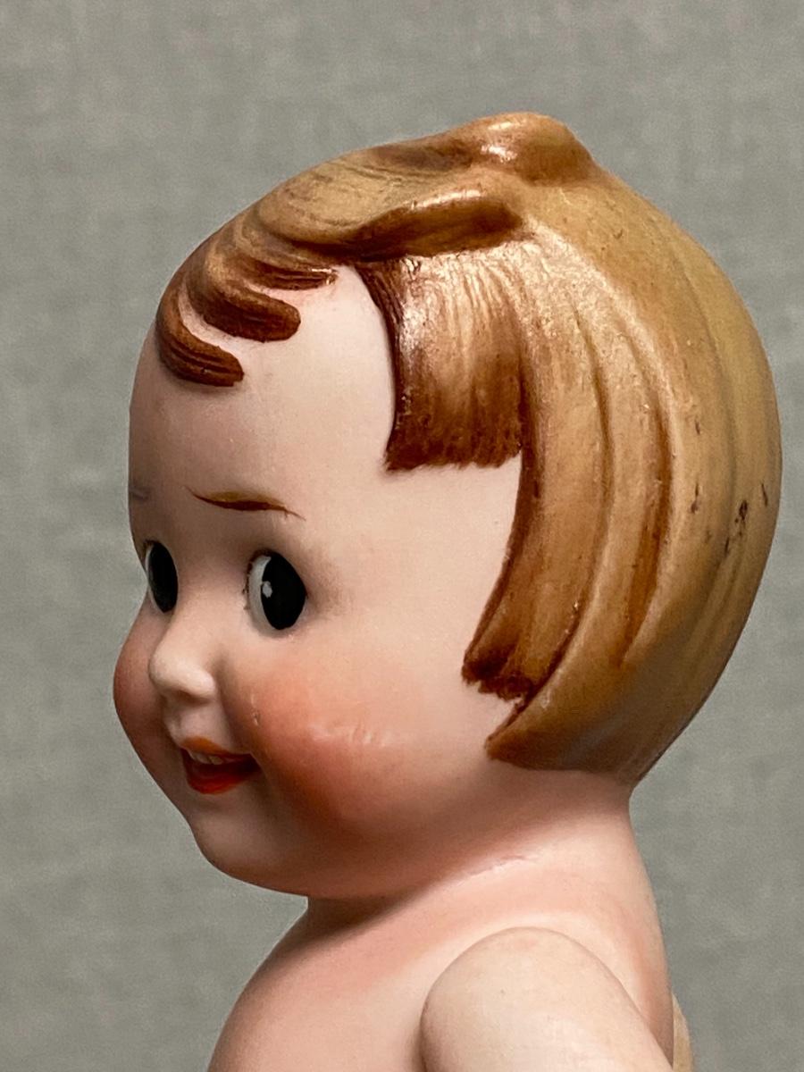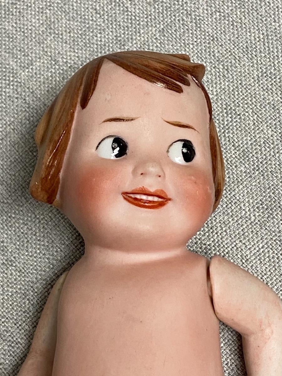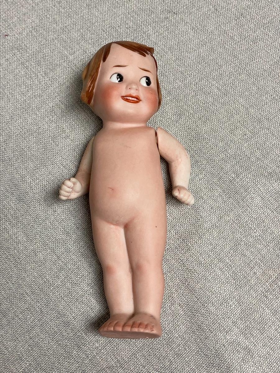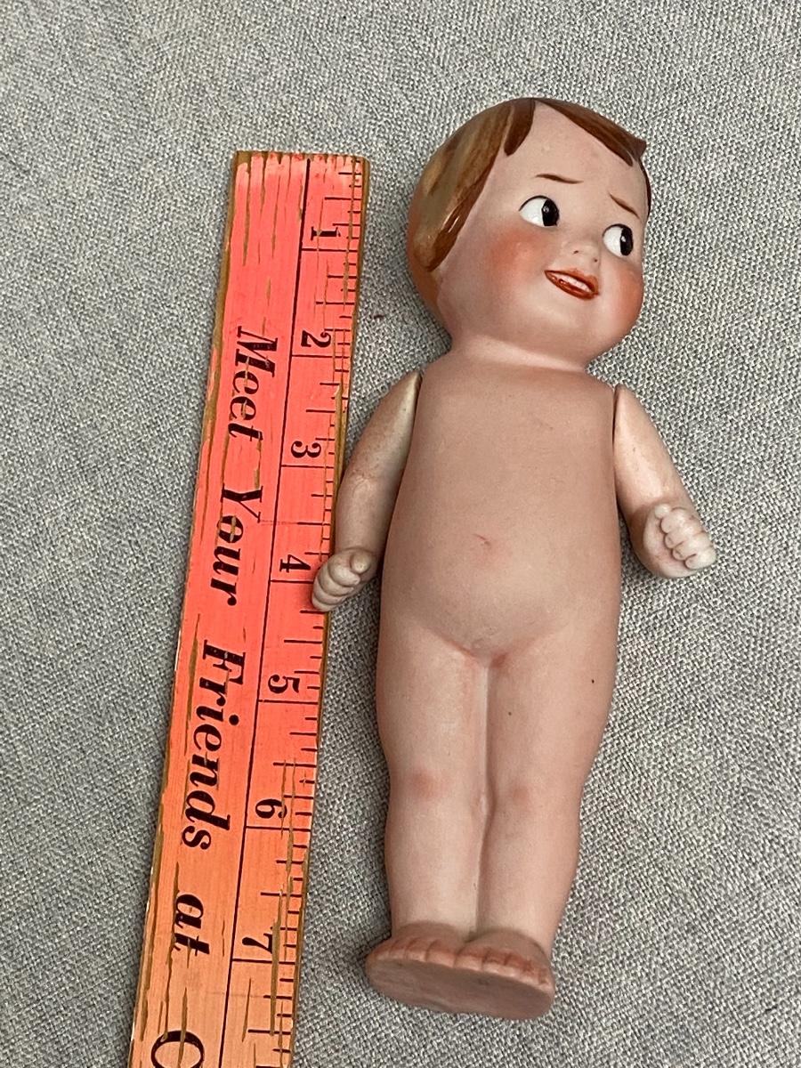 Vintage 7" bisque doll. Jointed at the shoulders only, legs, body, and head are one solid piece. Kinda looking back over shoulder. Good condition. Unmarked.