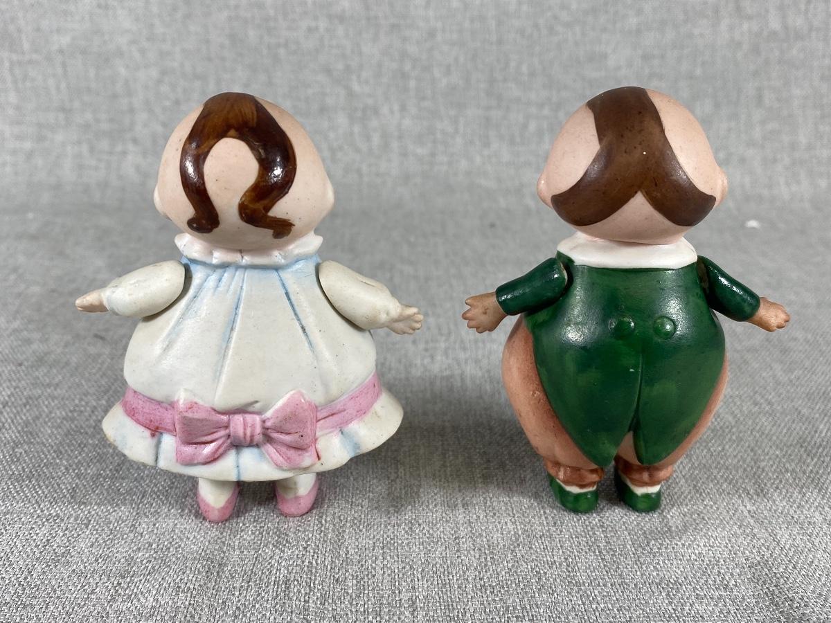 Adorable Tweedle Dee and Tweedle Dum bisque figurine set. Jointed arms. Under 4" size. Good vintage condition. Matching circle stamp patterns on the bottom.