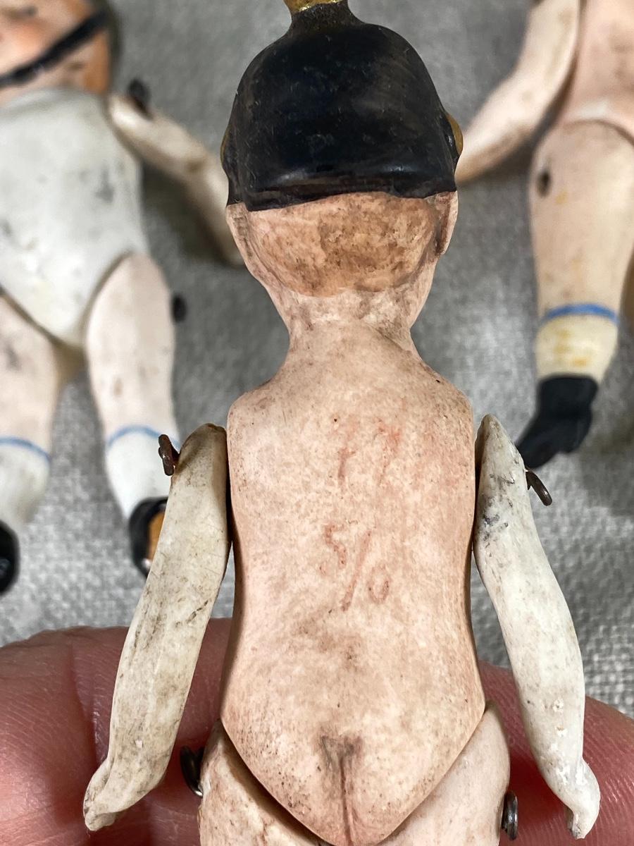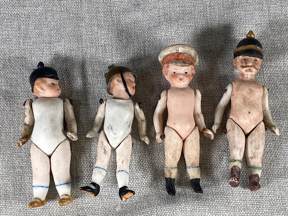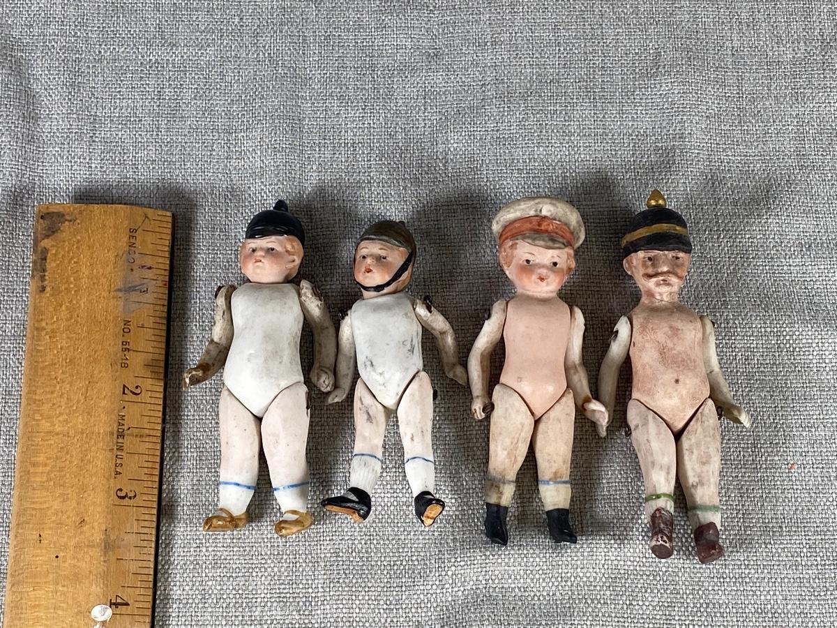 Set of 4 vintage jointed bisque dollhouse dolls. All look like soldiers or military from their hats. No clothes, painted socks and shoes. Signs of age. A few have marks on their back. About 3.5" size or smaller.