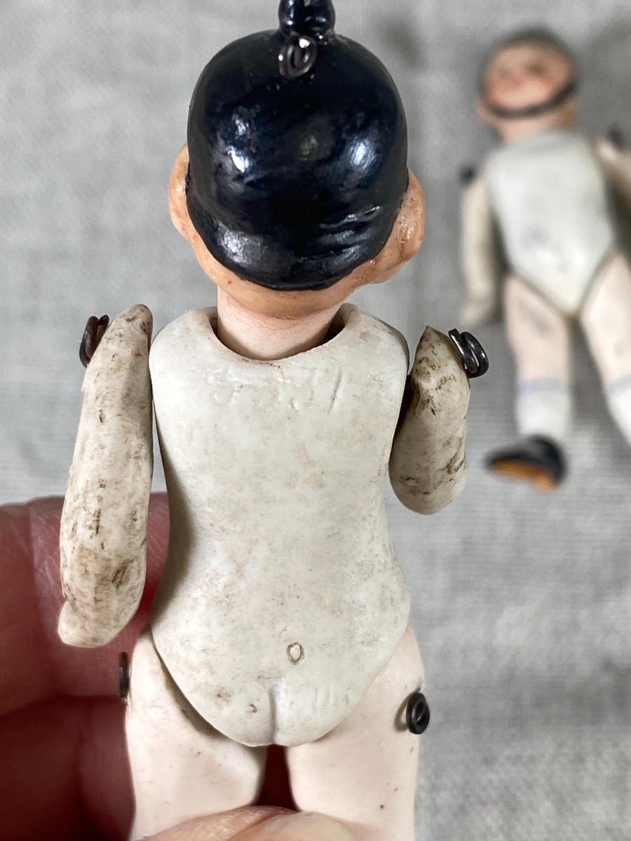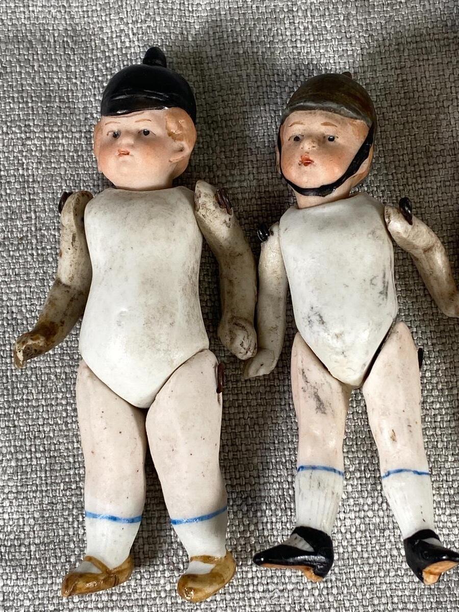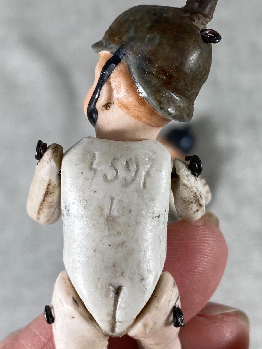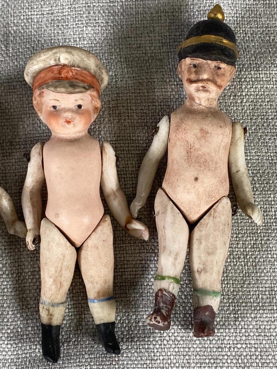Set of 4 vintage jointed bisque dollhouse dolls. All look like soldiers or military from their hats. No clothes, painted socks and shoes. Signs of age. A few have marks on their back. About 3.5" size or smaller.