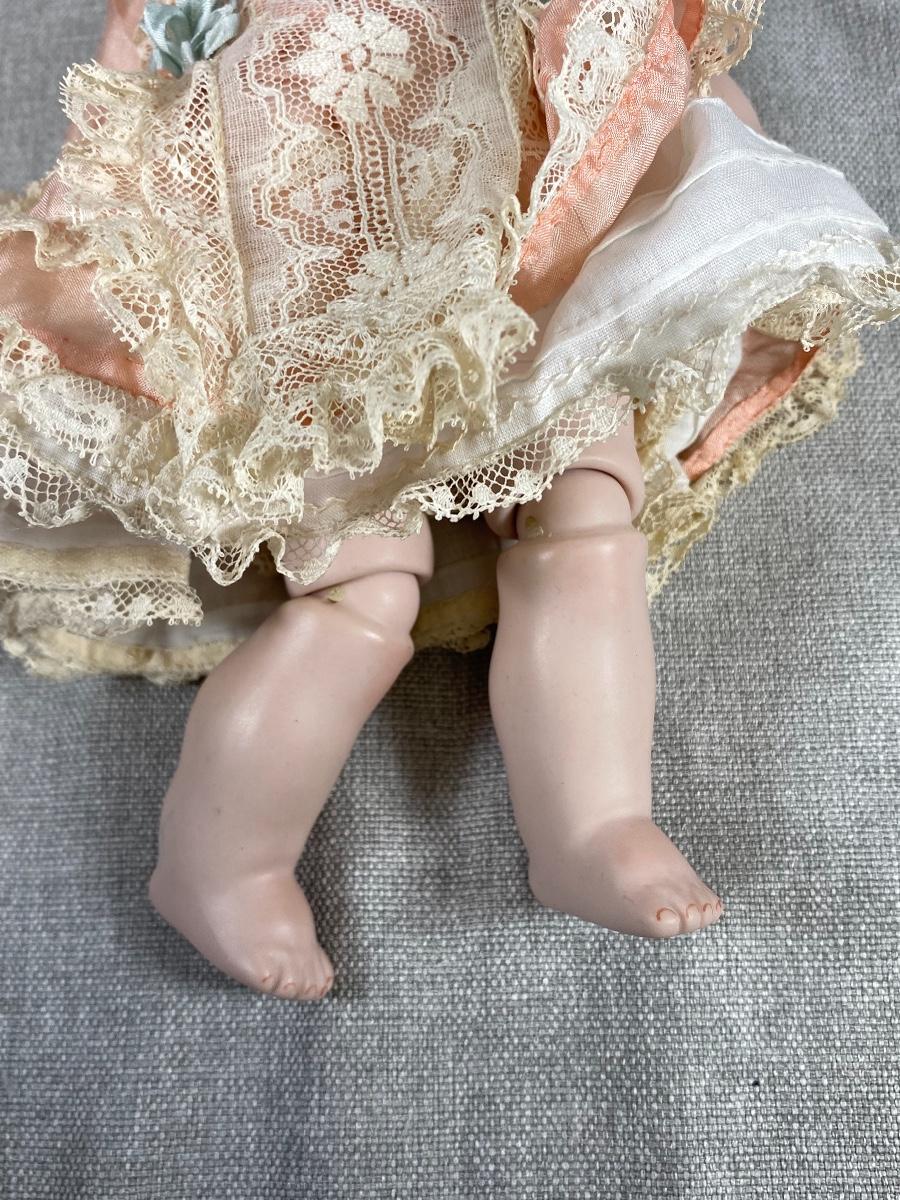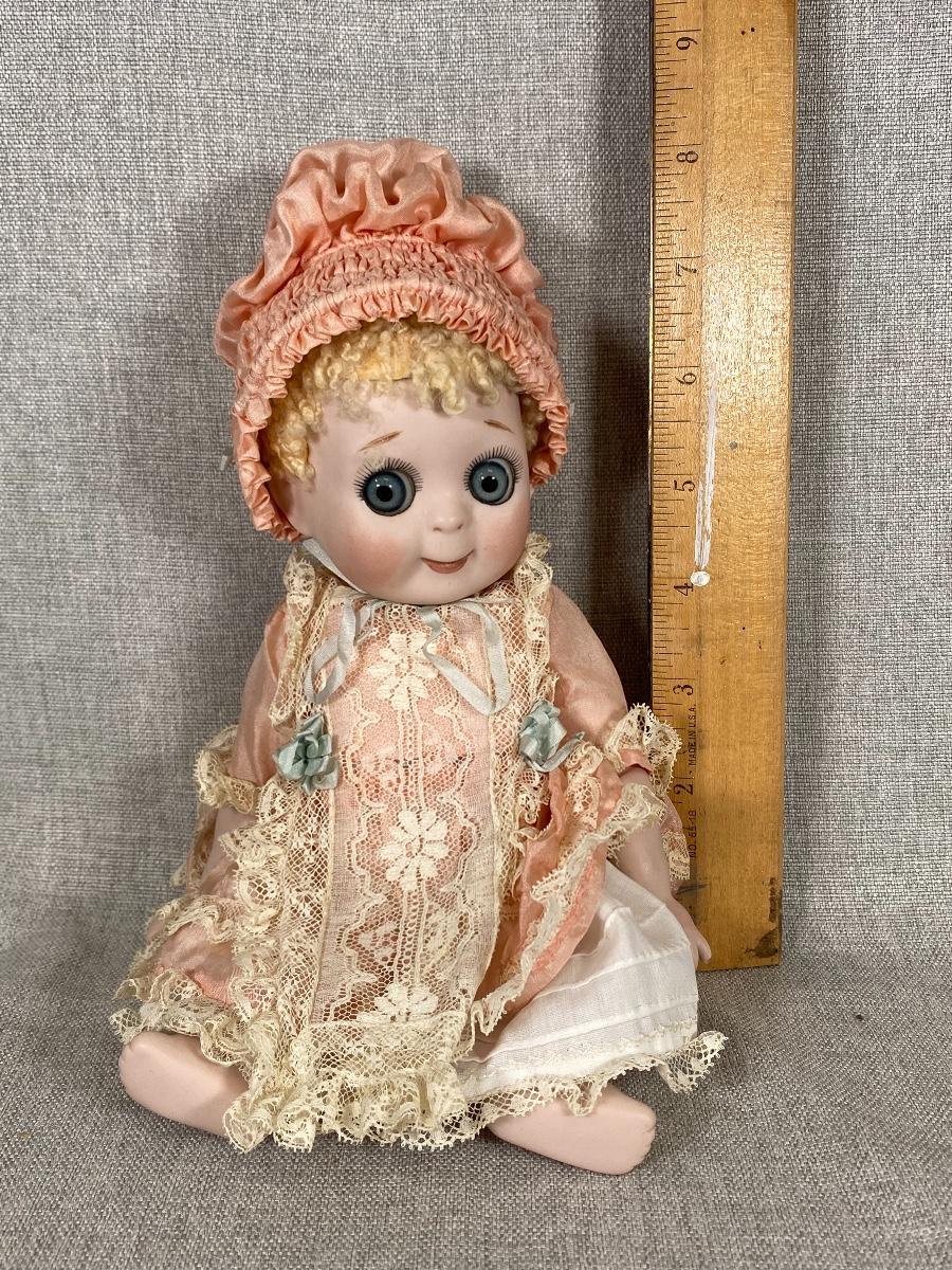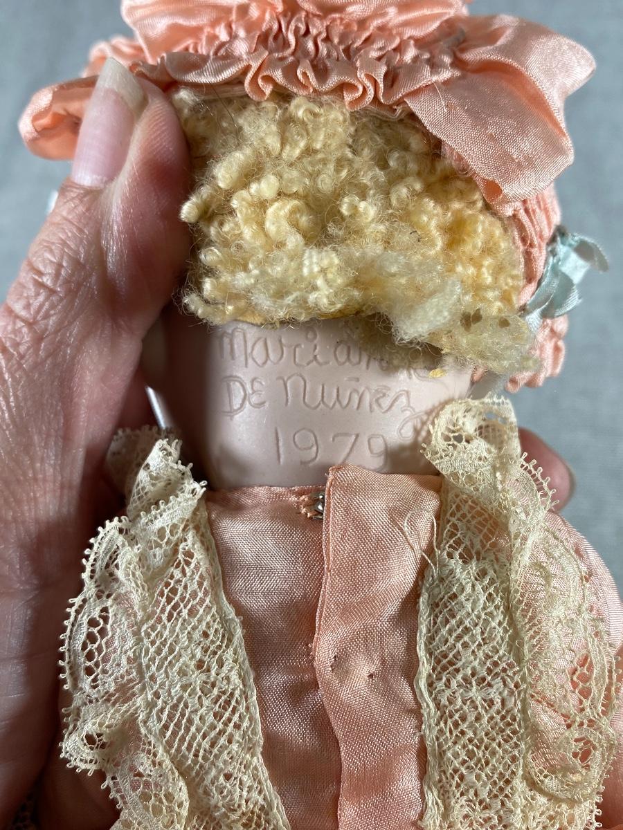 Cute Bo Peep style reproduction doll. Blue googly eyes with a watermelon smile. Artist Marianne DeNunez, signed and dated 1979. In good condition. Bisque jointed body. Under 10" size.