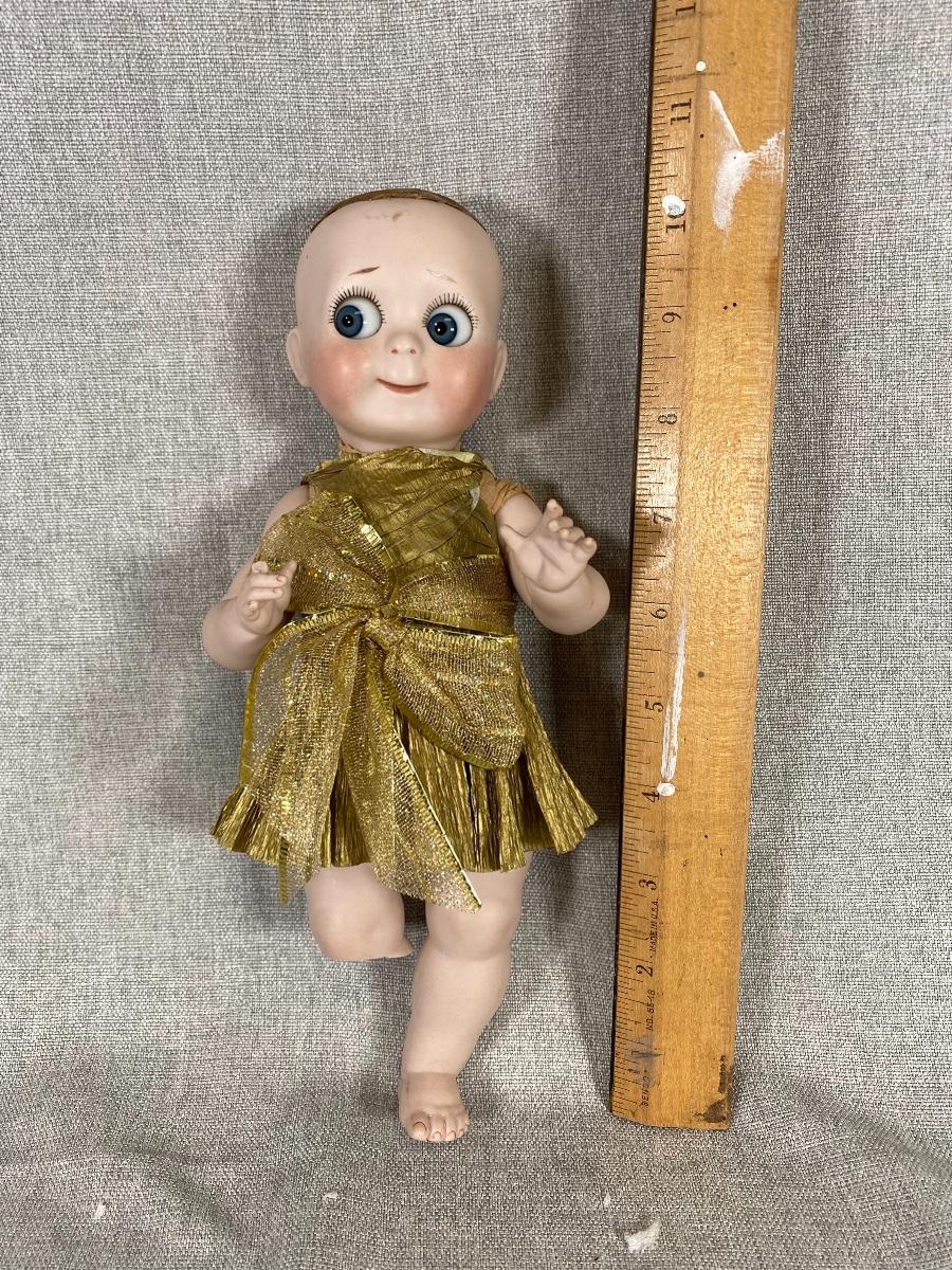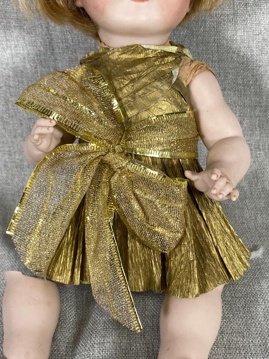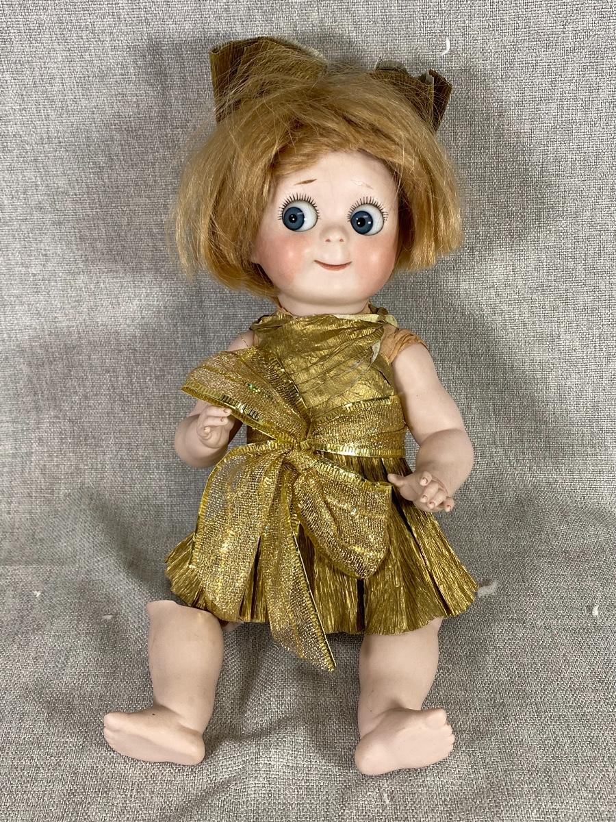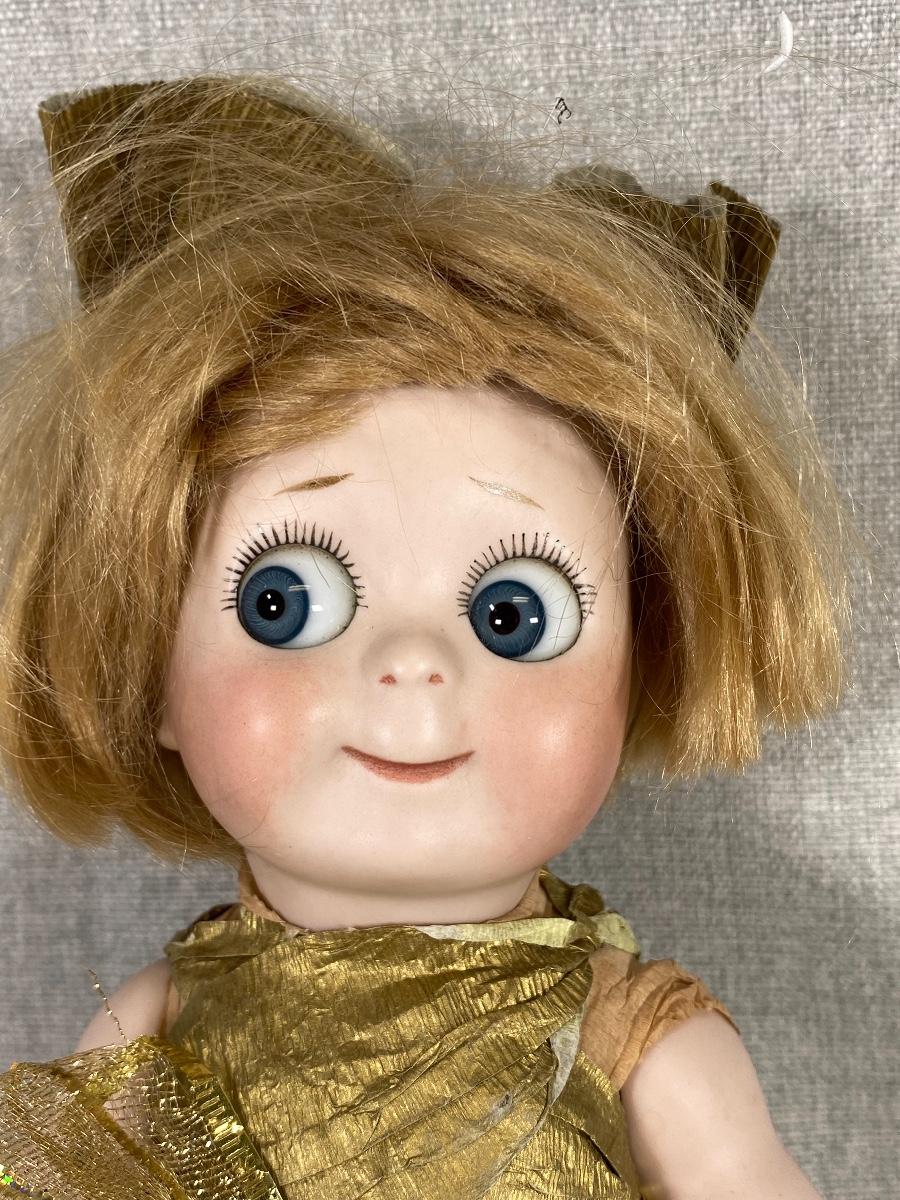 1966 Marianne DeNunez JDK 221 googly eyed repro doll. Big googly eyes with watermelon smile. Gold crepe paper dress and bow. Unfortunately her leg and a finger are broken. I did find her online, owner had purchased her in 2019, she had a broken finger then. Leg is included. About 10" size.