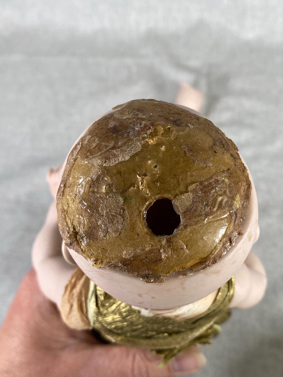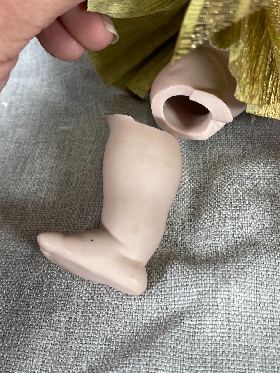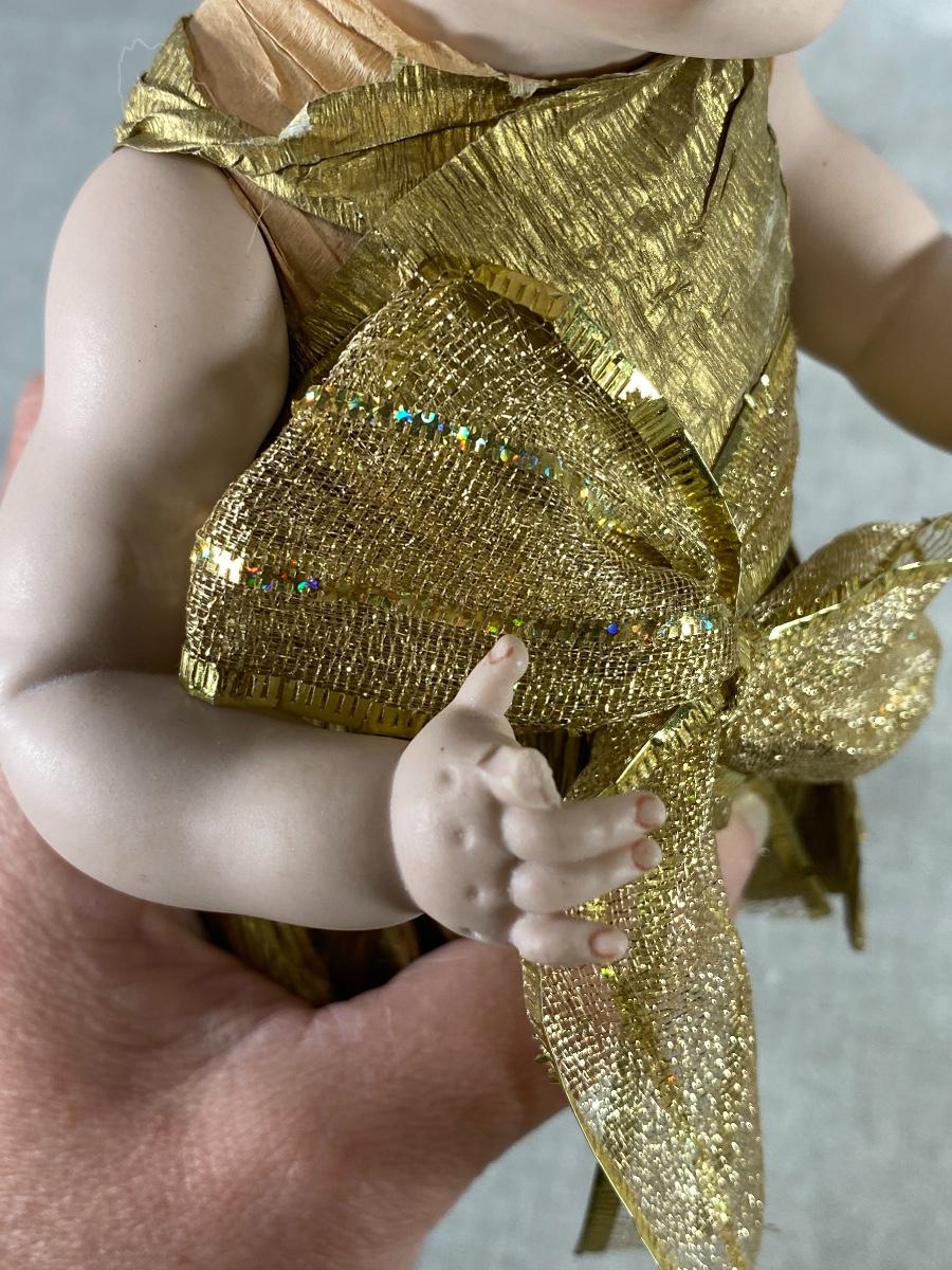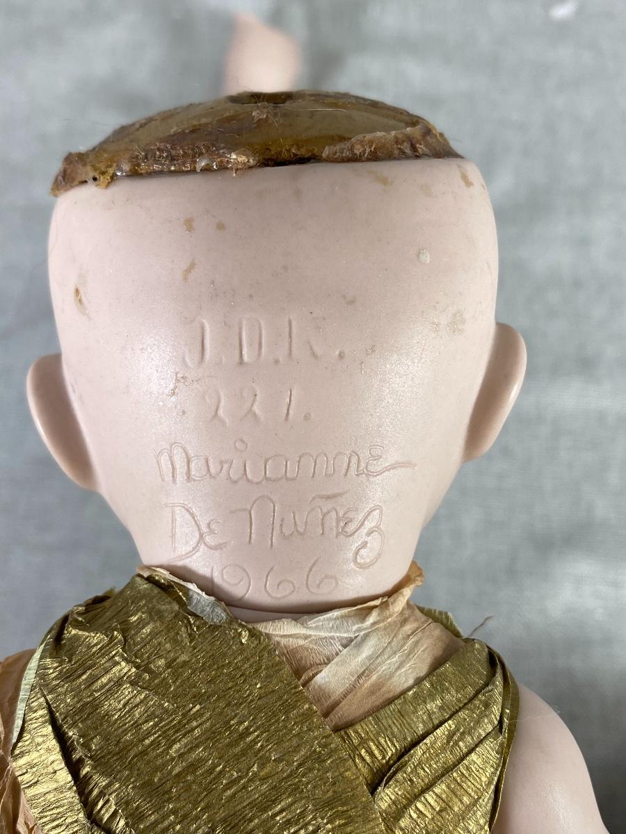 1966 Marianne DeNunez JDK 221 googly eyed repro doll. Big googly eyes with watermelon smile. Gold crepe paper dress and bow. Unfortunately her leg and a finger are broken. I did find her online, owner had purchased her in 2019, she had a broken finger then. Leg is included. About 10" size.