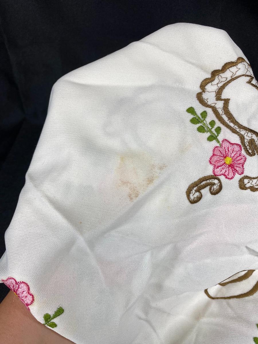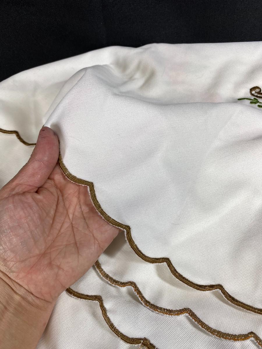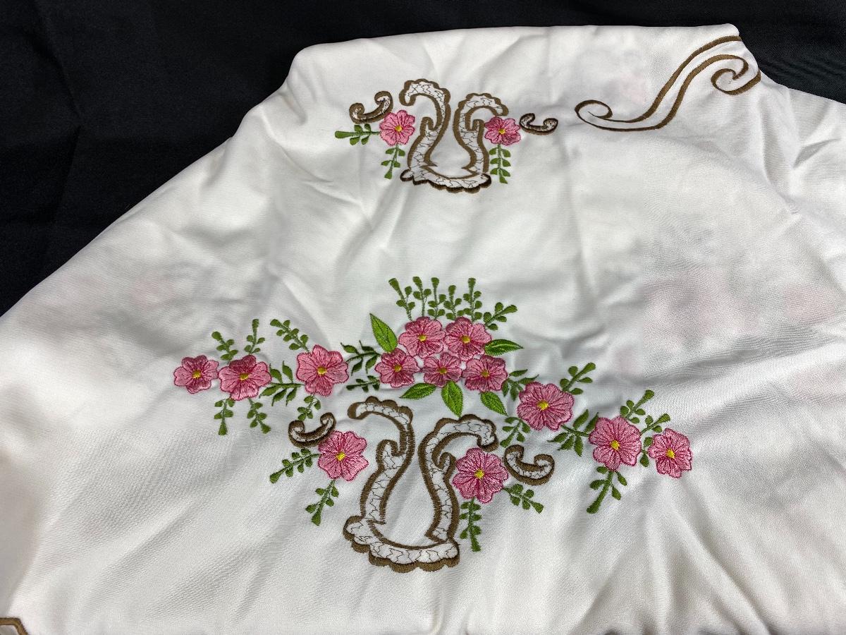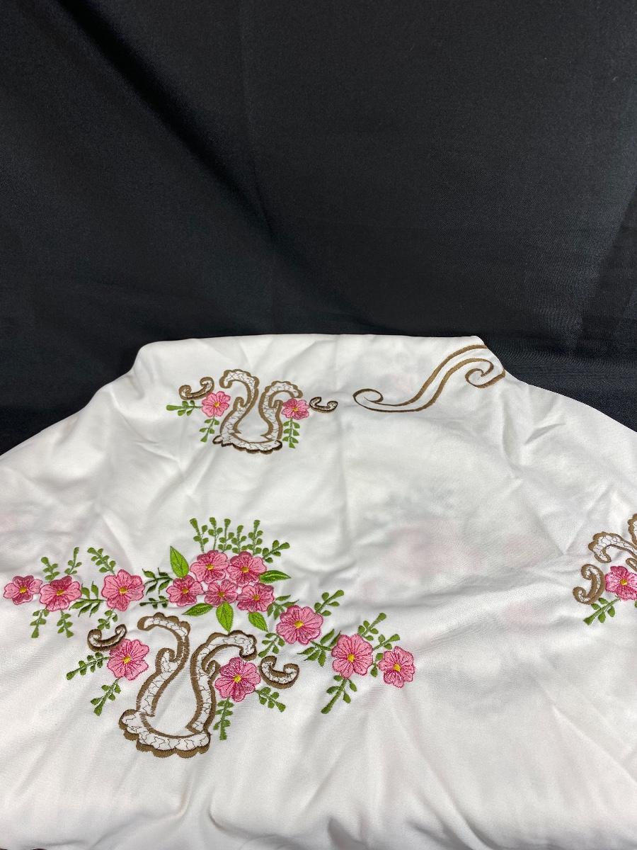 Vintage pink flower embroidered scallop edge tablecloth. Round shape, about 5' diameter. There are a couple spots, not sure how well they might come out or lighten.