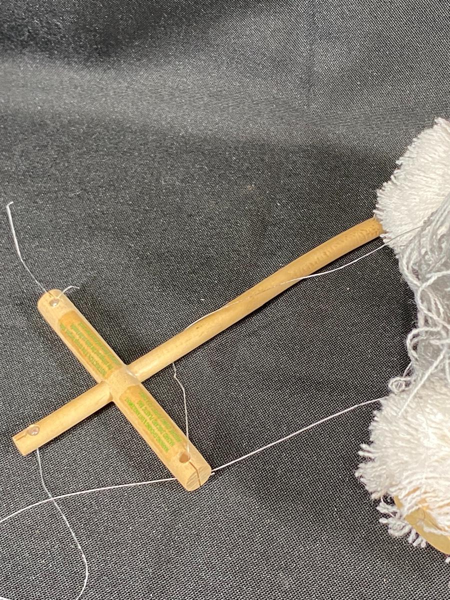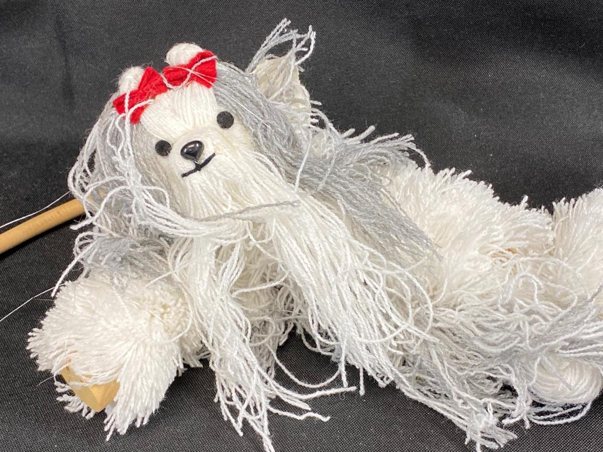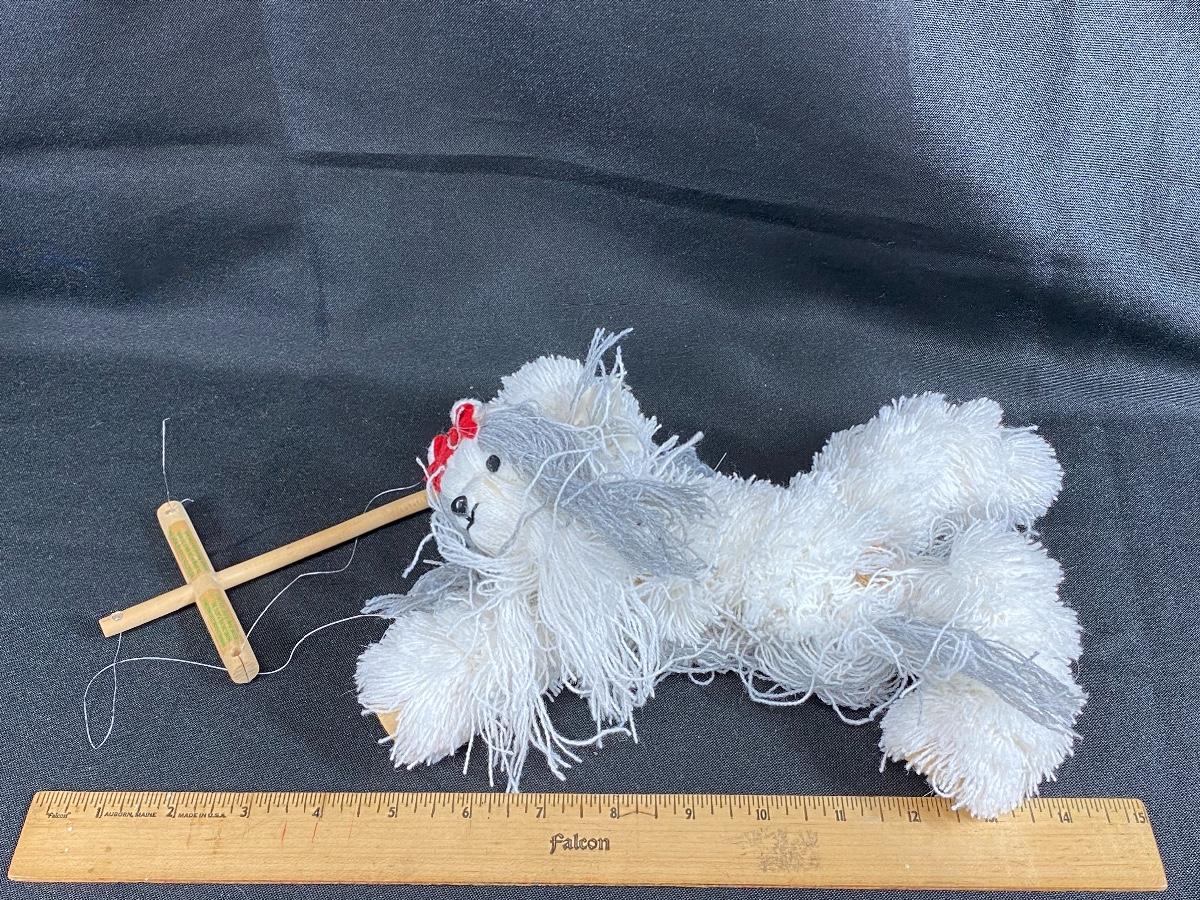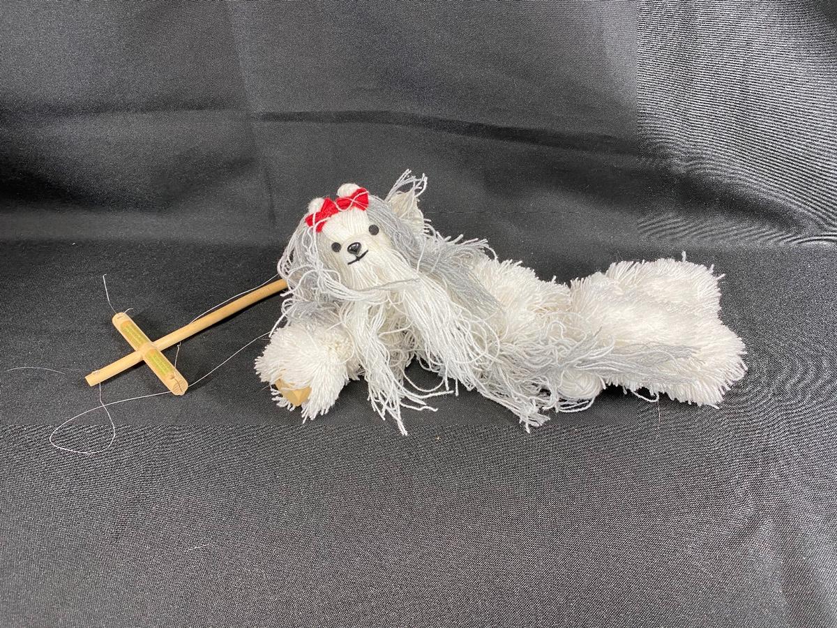 Cute art dog marionette string puppet. Has a sheep dog look with it's yarn fur. Needs to be fixed, some of the control strings have broken.