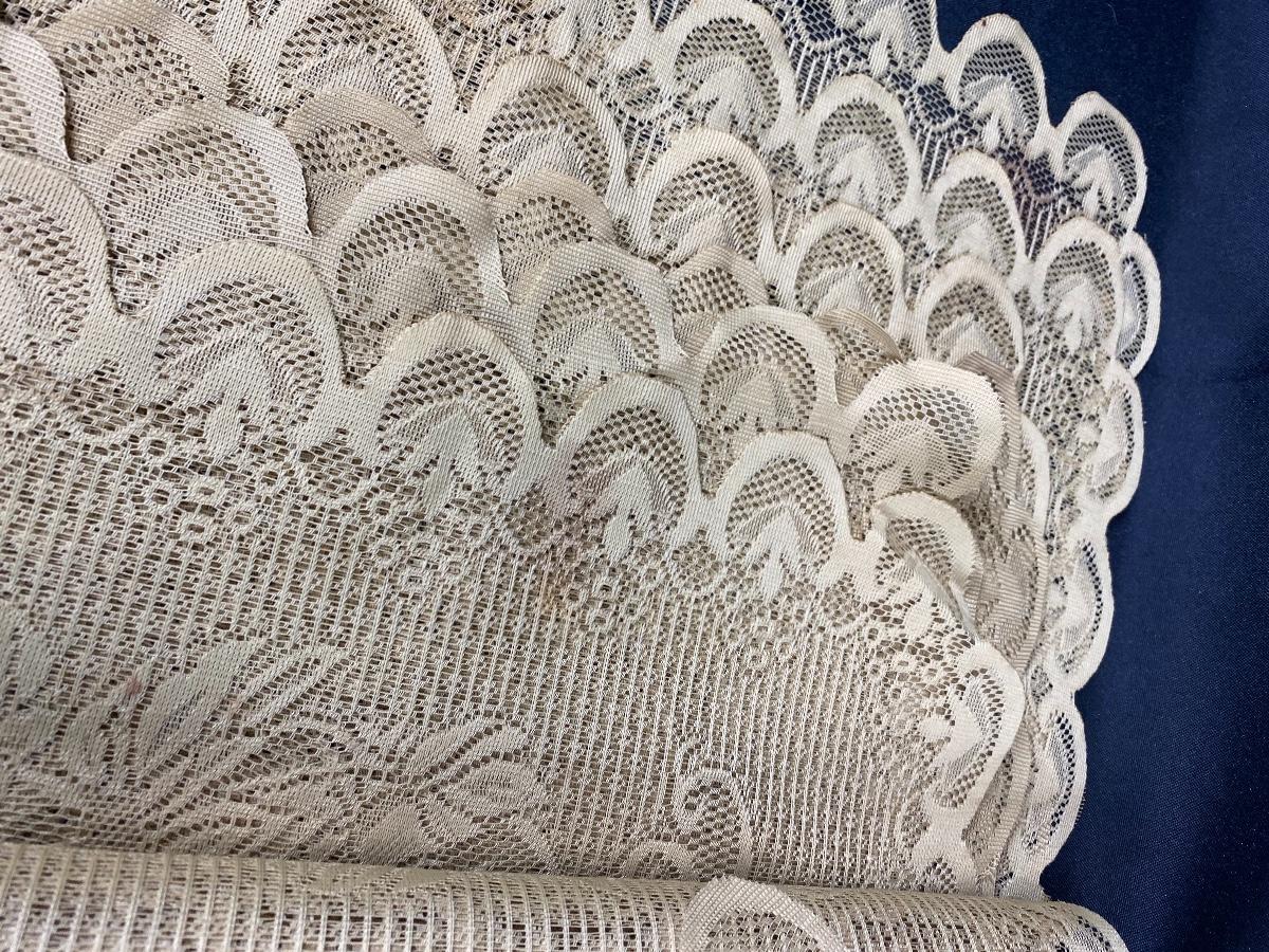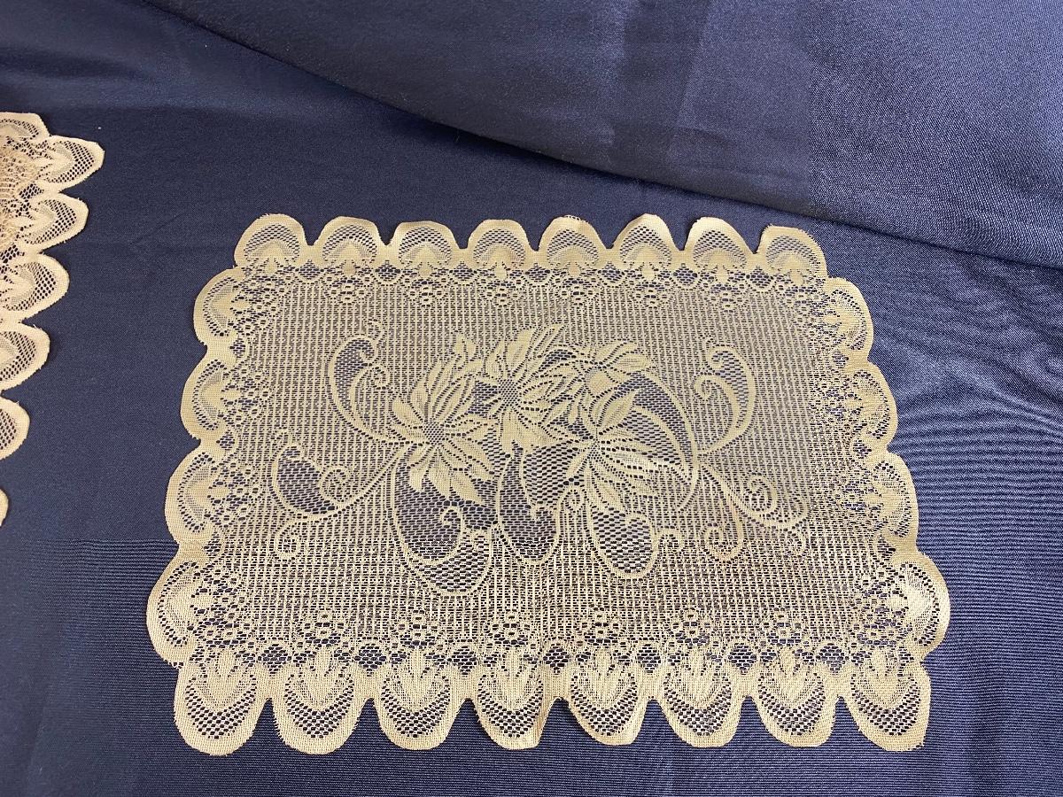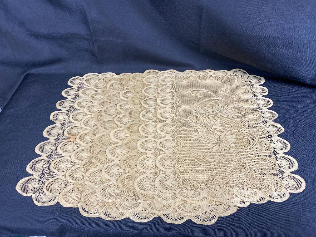 Lot of delicate lace placemats. Scallop edge, floral center design. There is some spots on a couple mats, may just need to be washed.