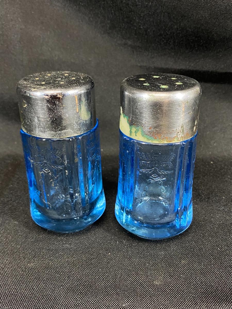 Vintage set of blue glass salt and pepper shakers. Caps have signs of age and use. Glass in good condition.