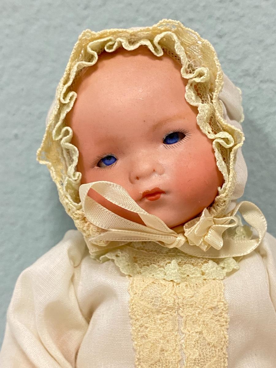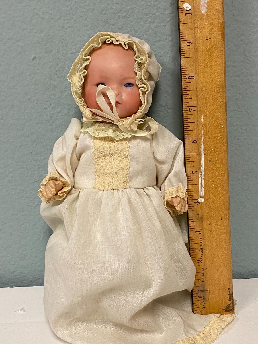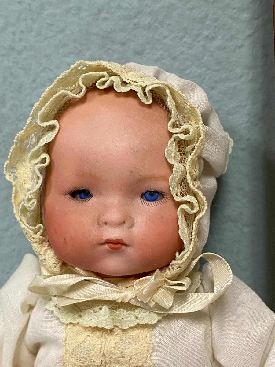 Antique Armand Marseille 9" baby doll. Bisque sleepy eye head with composite body. Blue eyes are a little off, one is back a little far. Light signs of age and wear. Back of head marked AM Germany 371/9/0 K.