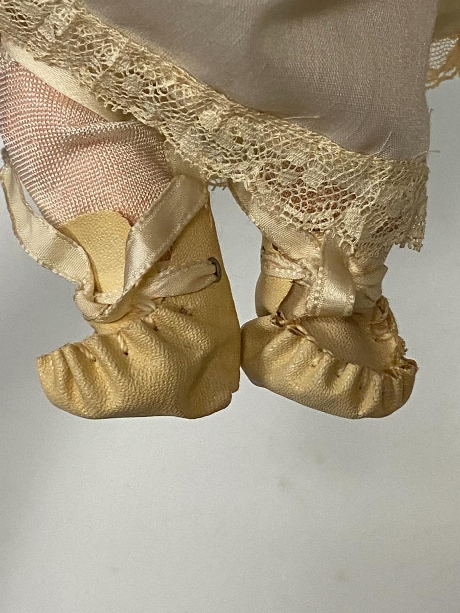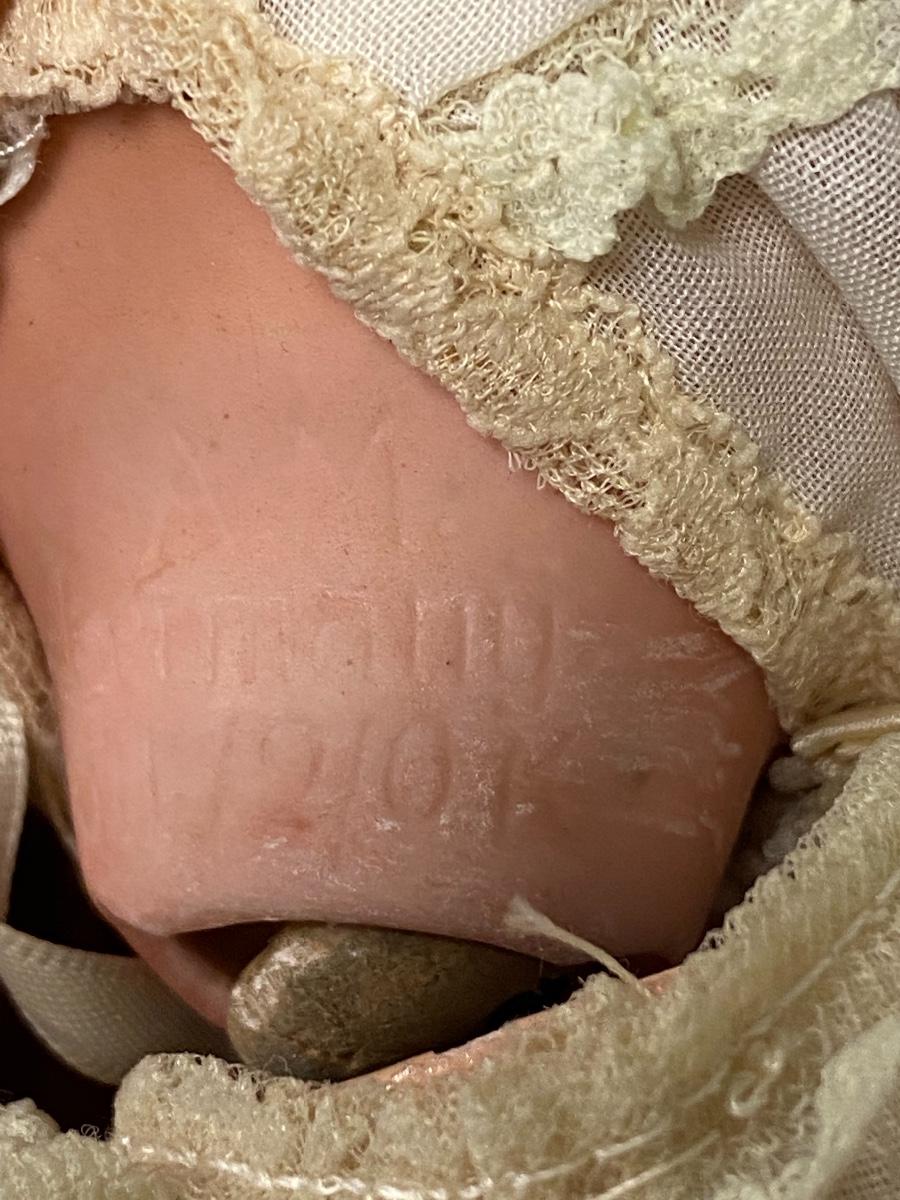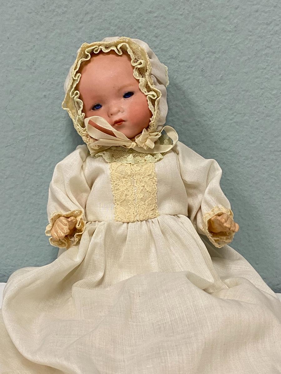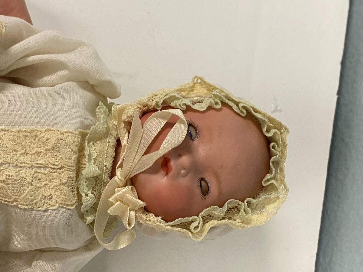 Antique Armand Marseille 9" baby doll. Bisque sleepy eye head with composite body. Blue eyes are a little off, one is back a little far. Light signs of age and wear. Back of head marked AM Germany 371/9/0 K.