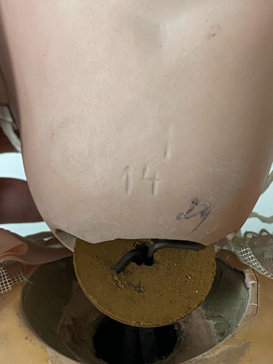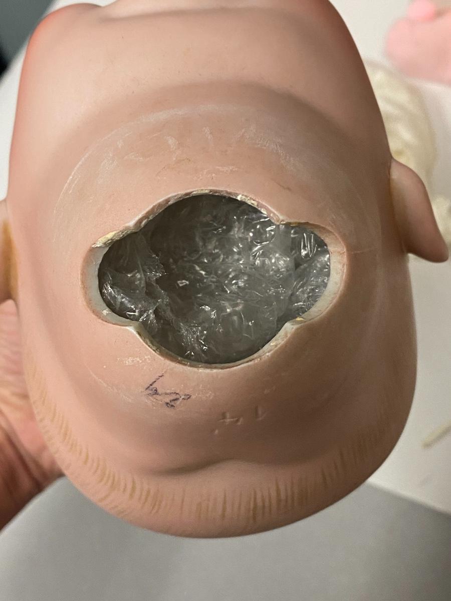 Large vintage bisque and composite baby doll. Unfortunately, her head decided to come off the plug and she broke her eyes in the process. Head is marked 14 on the back. Eyes can be accessed through the neck. Needs love.
