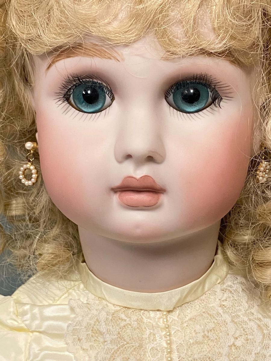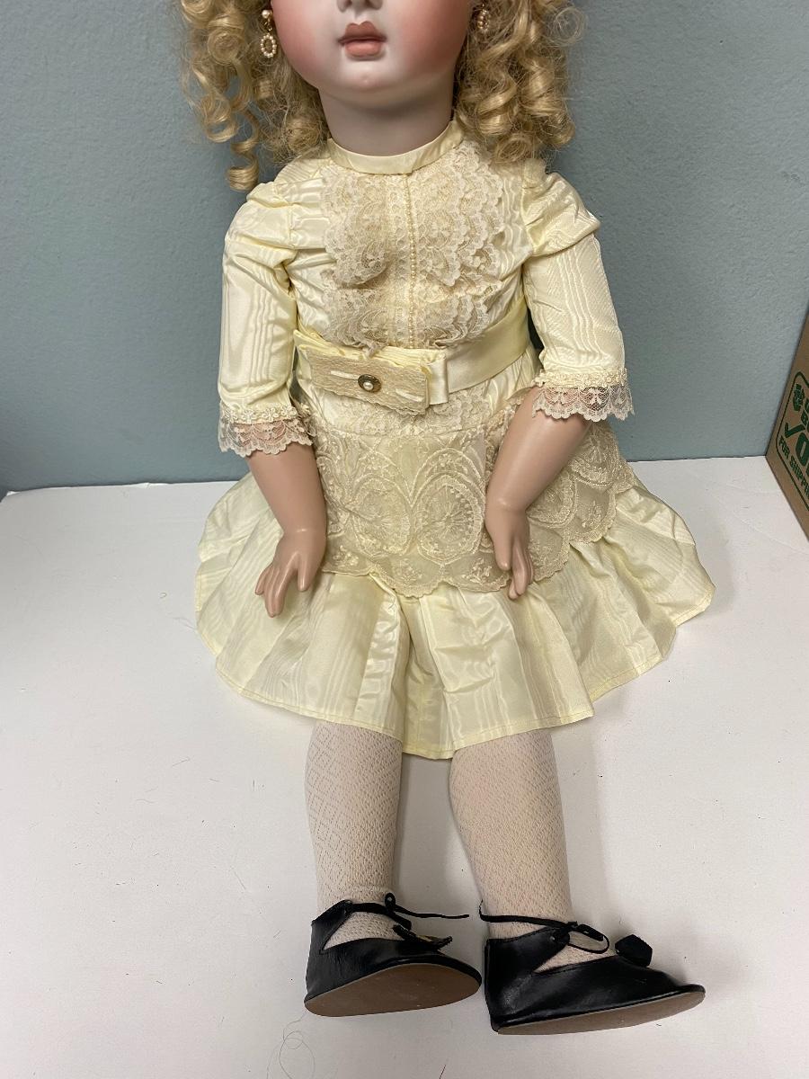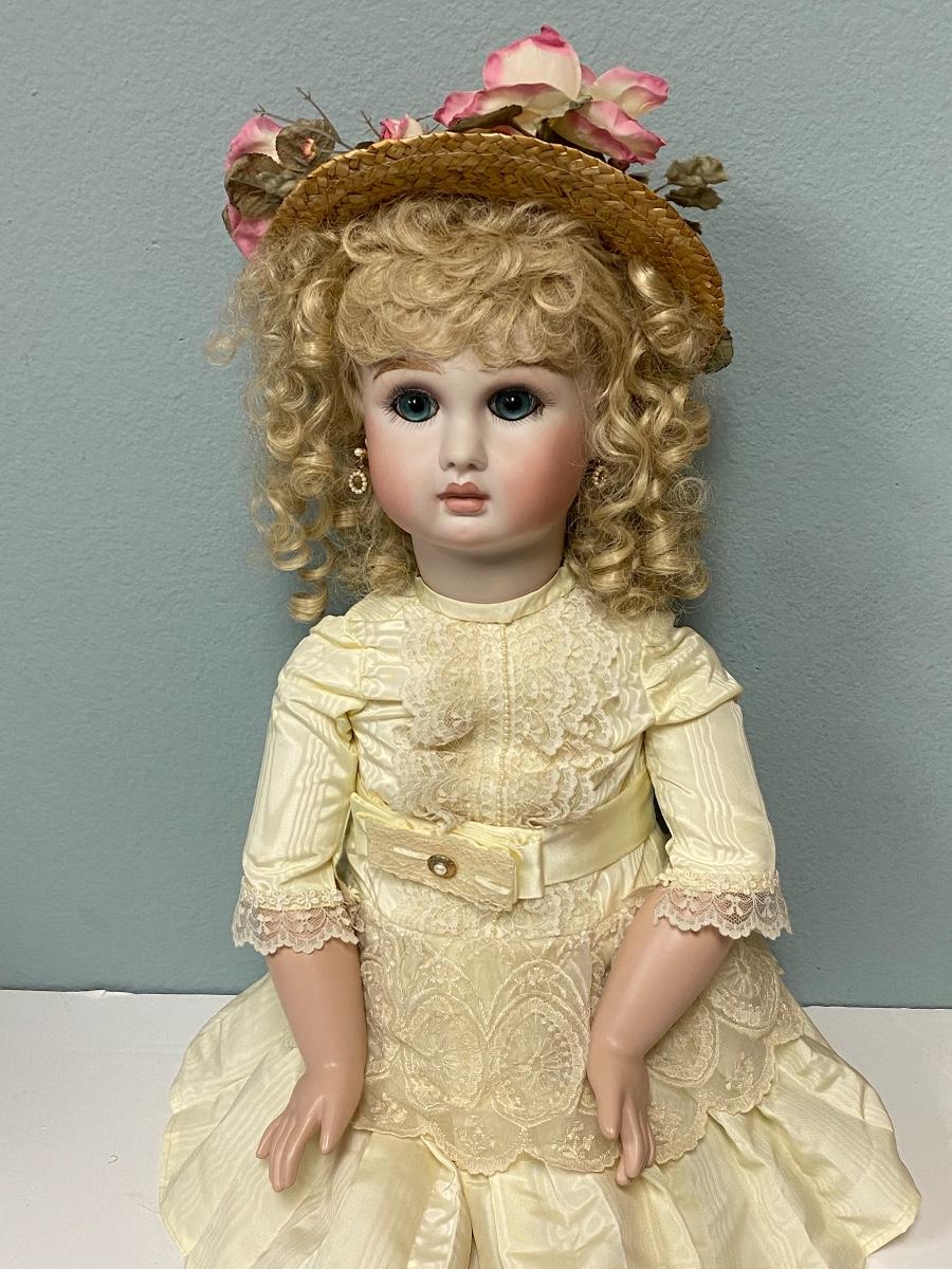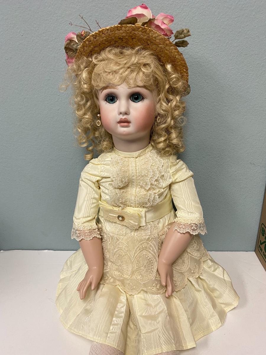 Beautiful blonde hair, turquoise eyed reproduction doll by Wanda Kuhl. Bisque head is marked J. Steiner Bte SGDG Paris FLre A 21. Pale yellow Victorian style dress. Nicely done. About 31" size. Composite Seeley body.