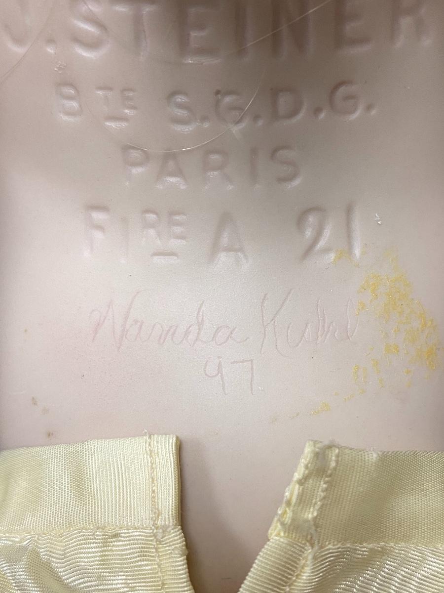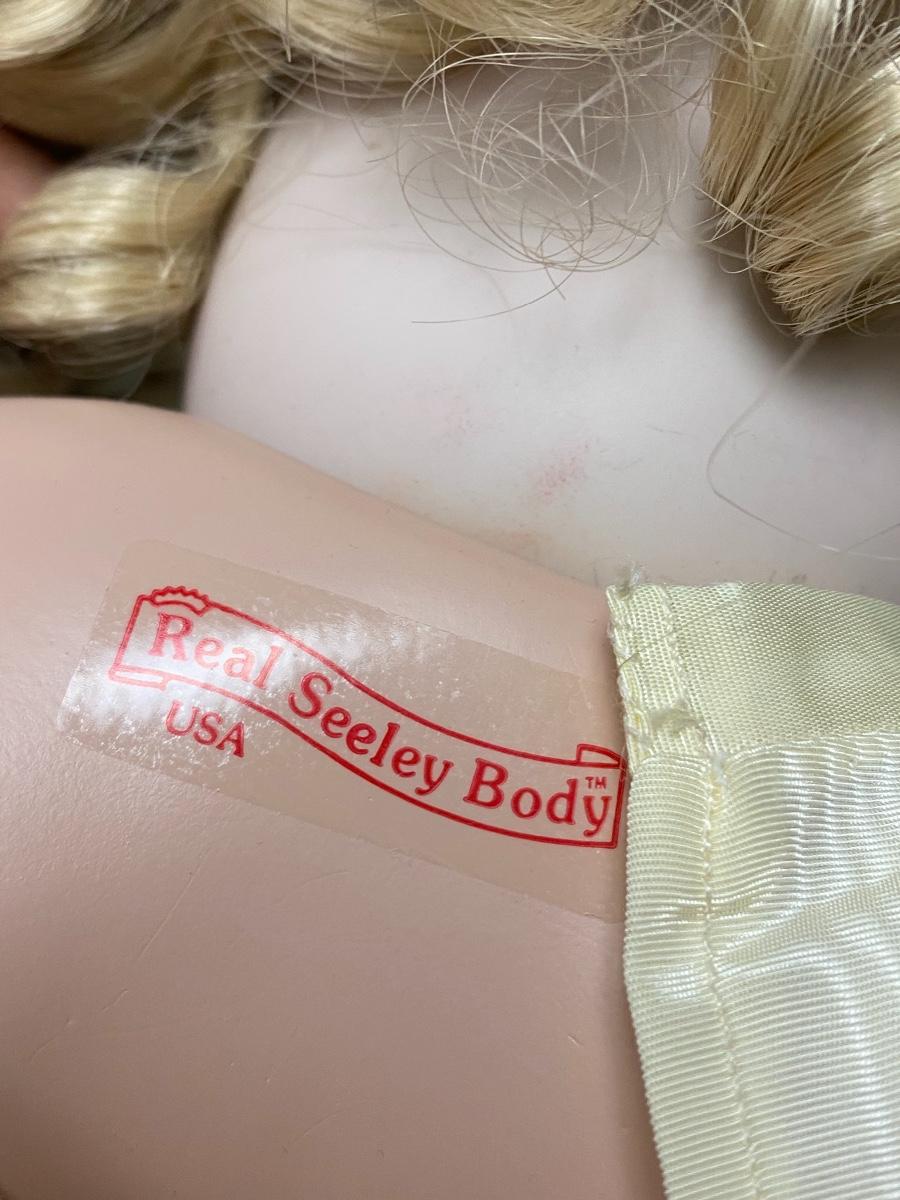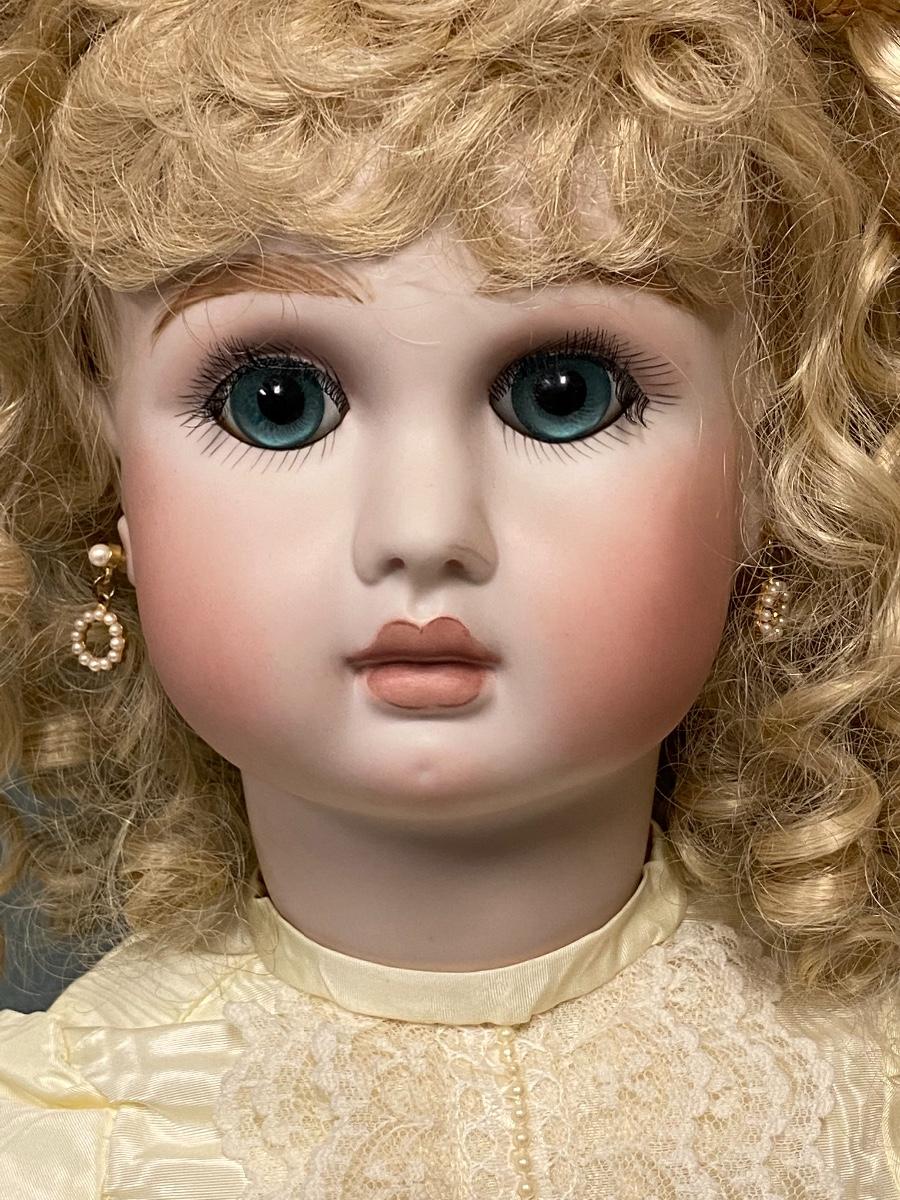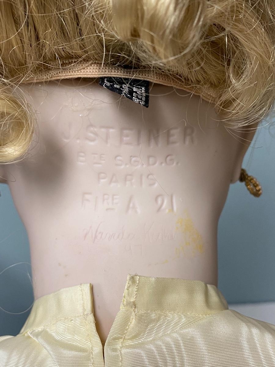Beautiful blonde hair, turquoise eyed reproduction doll by Wanda Kuhl. Bisque head is marked J. Steiner Bte SGDG Paris FLre A 21. Pale yellow Victorian style dress. Nicely done. About 31" size. Composite Seeley body.