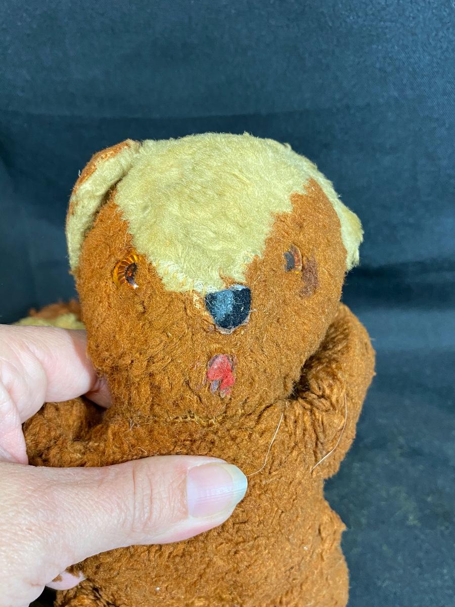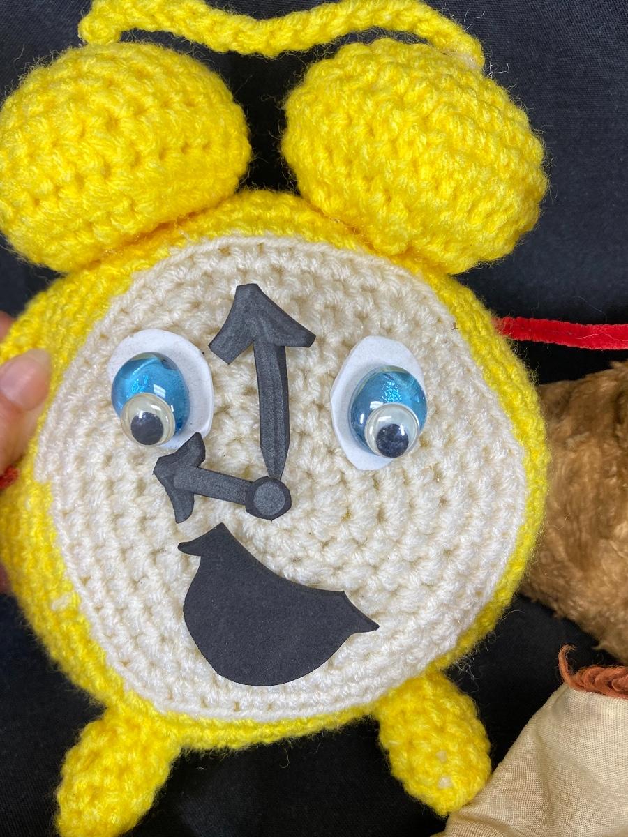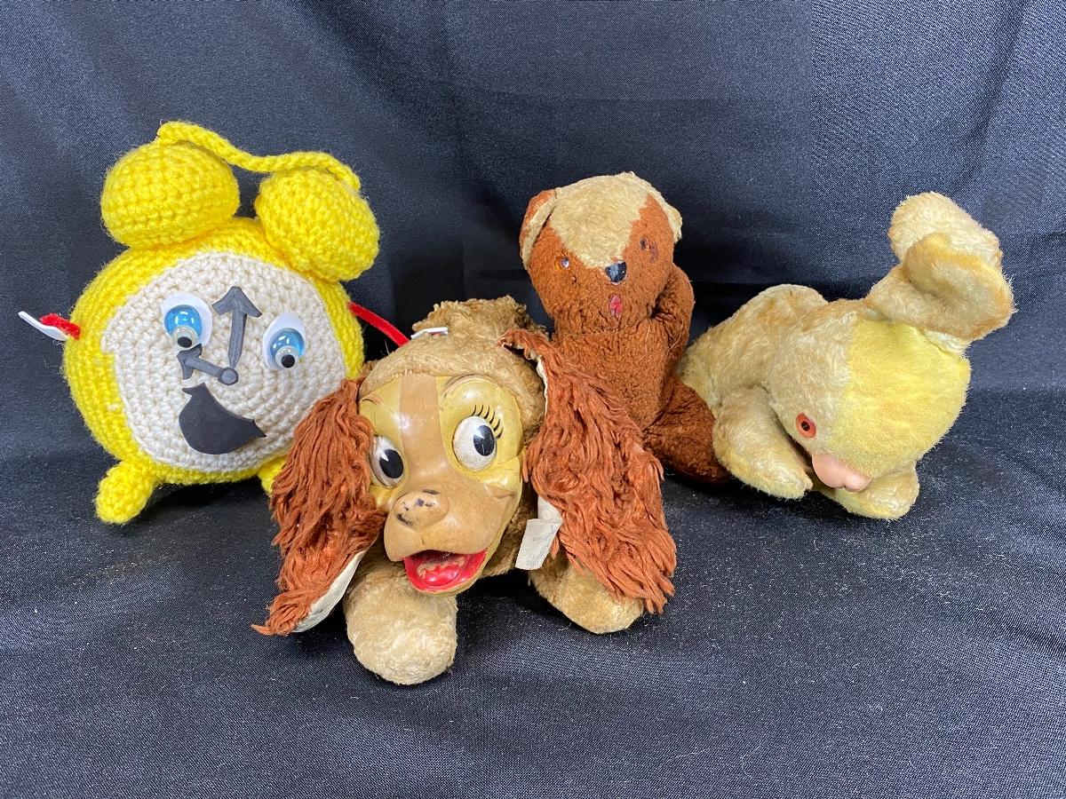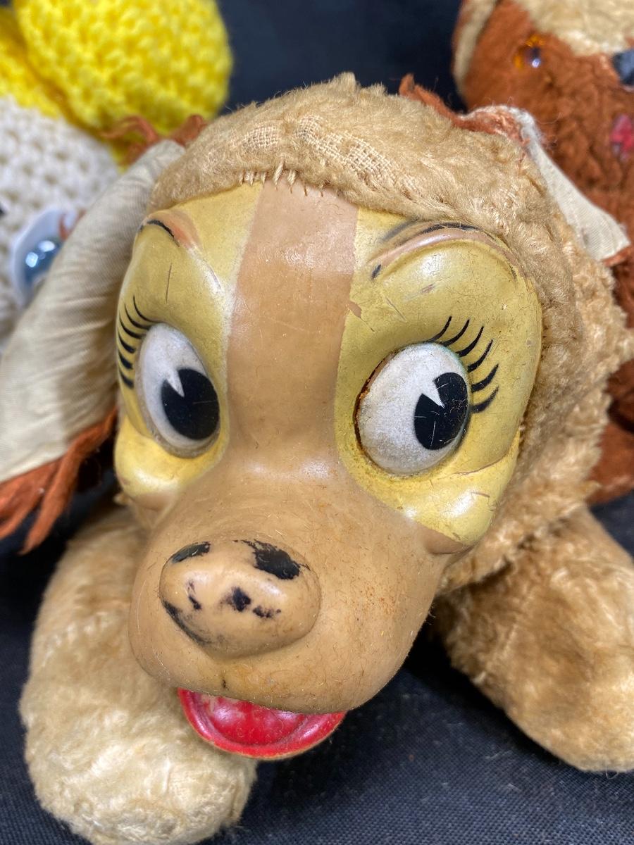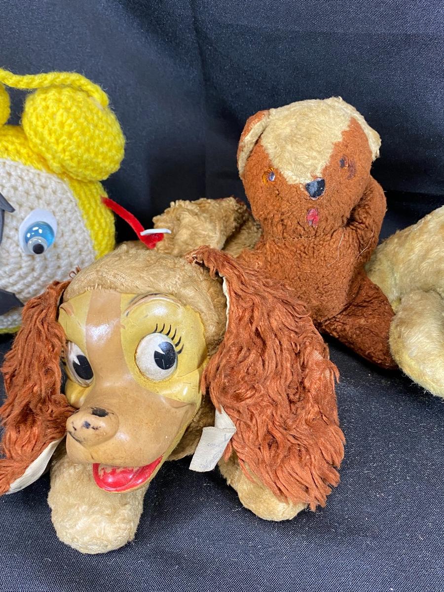 Lot of very loved plush vintage animals. Crochet clock, a rabbit, a bear, and Lady from Disney's Lady and the Tramp. All are well loved.