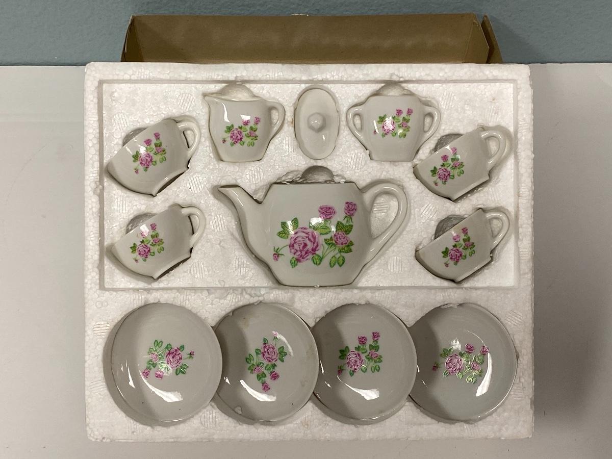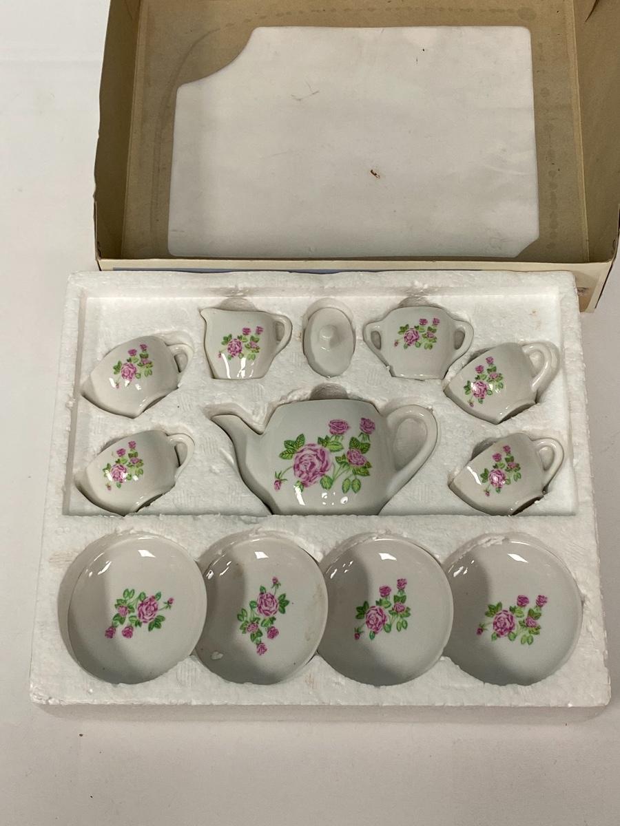Boxed children's china tea set. 12 pcs. total. Good condition, box has some wear.