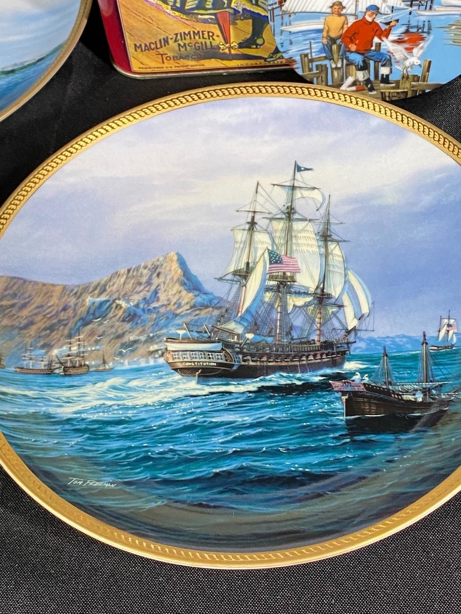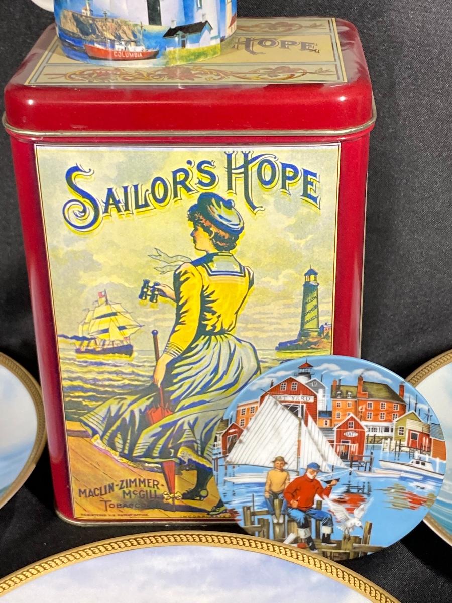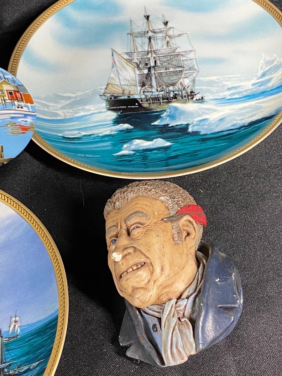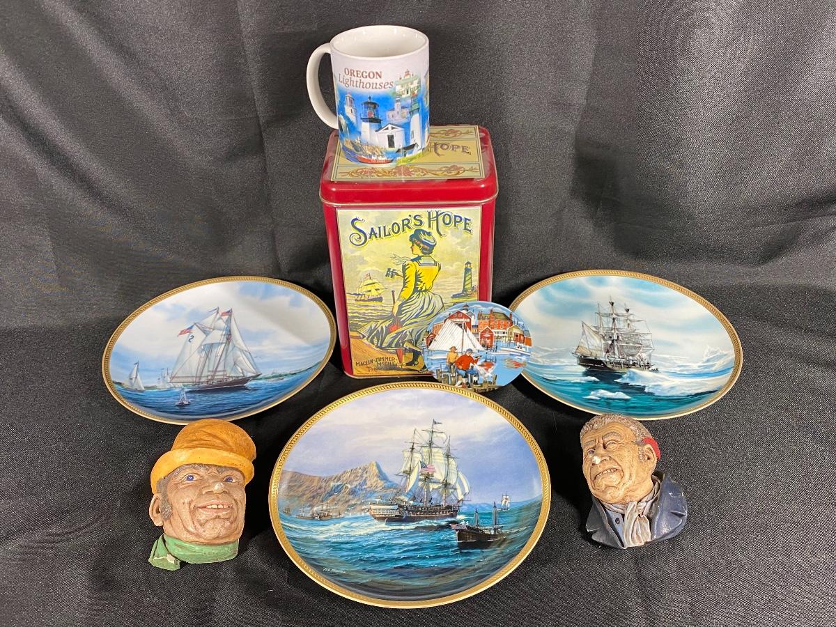 Mixed lot with a nautical sailing theme. Includes everything photo'd. Good to fair conditions, a couple chips on the faces. See pictures.