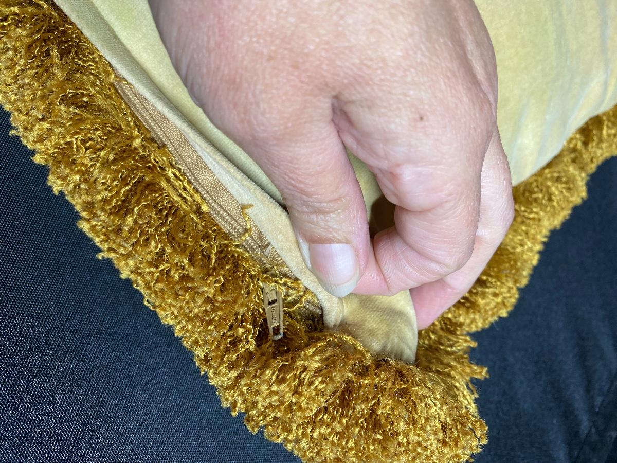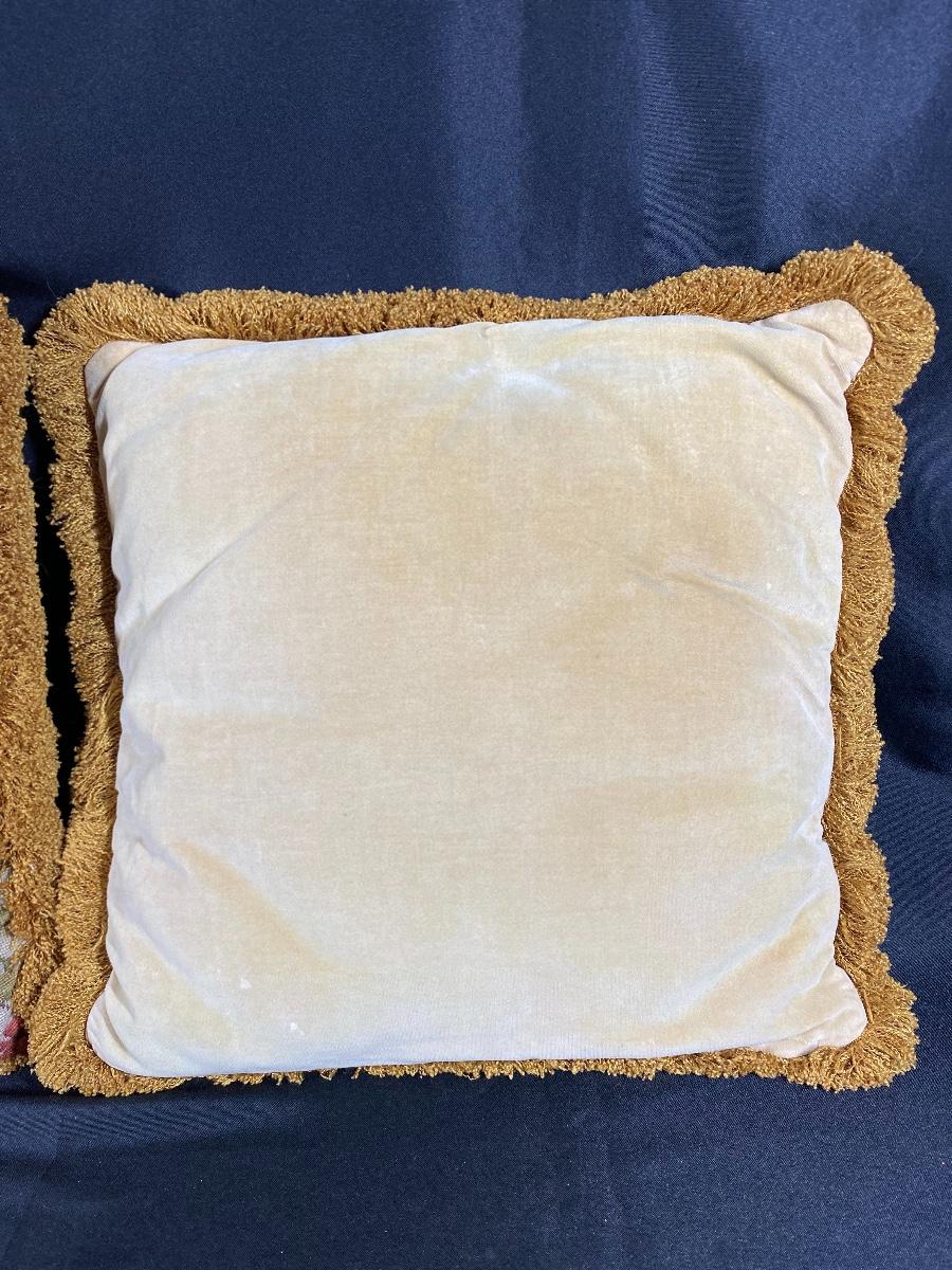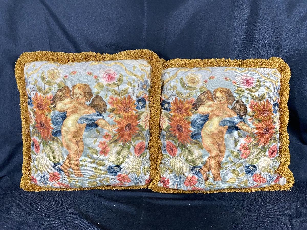Pair of needlepoint floral cherub throw pillows. Good condition. Have a zipper to allow removal of pillow. About 16" size.